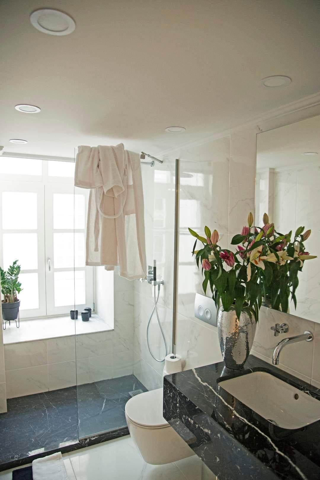 Step into a world of sophistication as you enter the spacious living area, featuring a plush sofa bed that accommodates additional guests. The apartment is adorned with tasteful prints and a modern curved chandelier, offering an inviting space for relaxation and socializing. The kitchen, with its expansive Crittal-style windows, floods the space with natural light and provides seamless access to the outdoor courtyard. Two beautifully appointed bedrooms promise restful nights, while the marble-clad bathrooms add a touch of opulence to your daily routine.