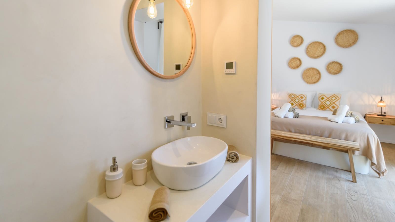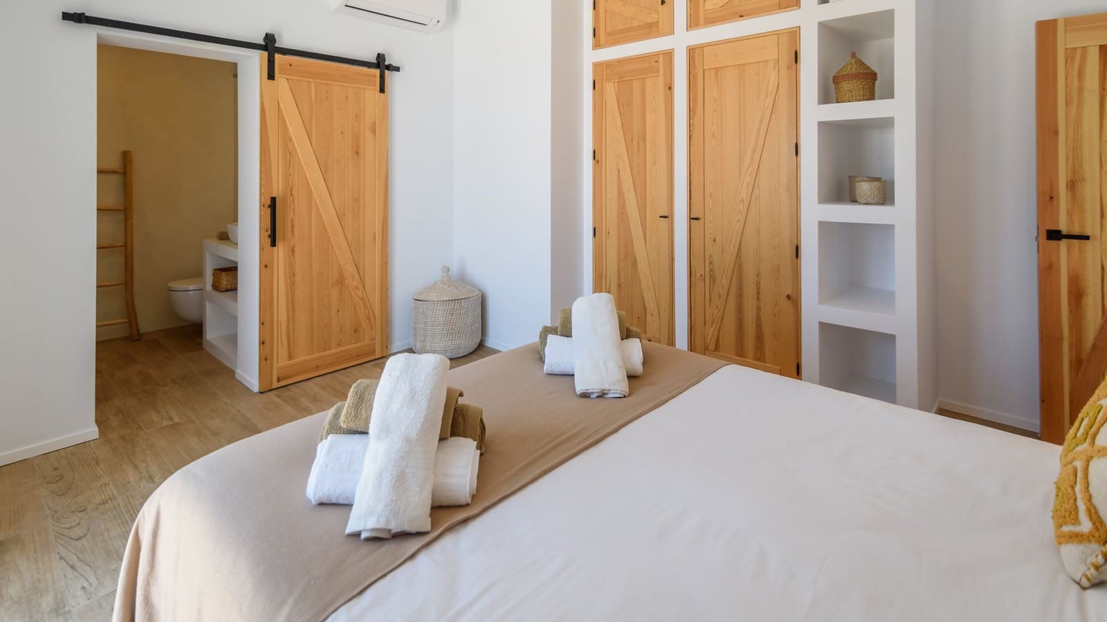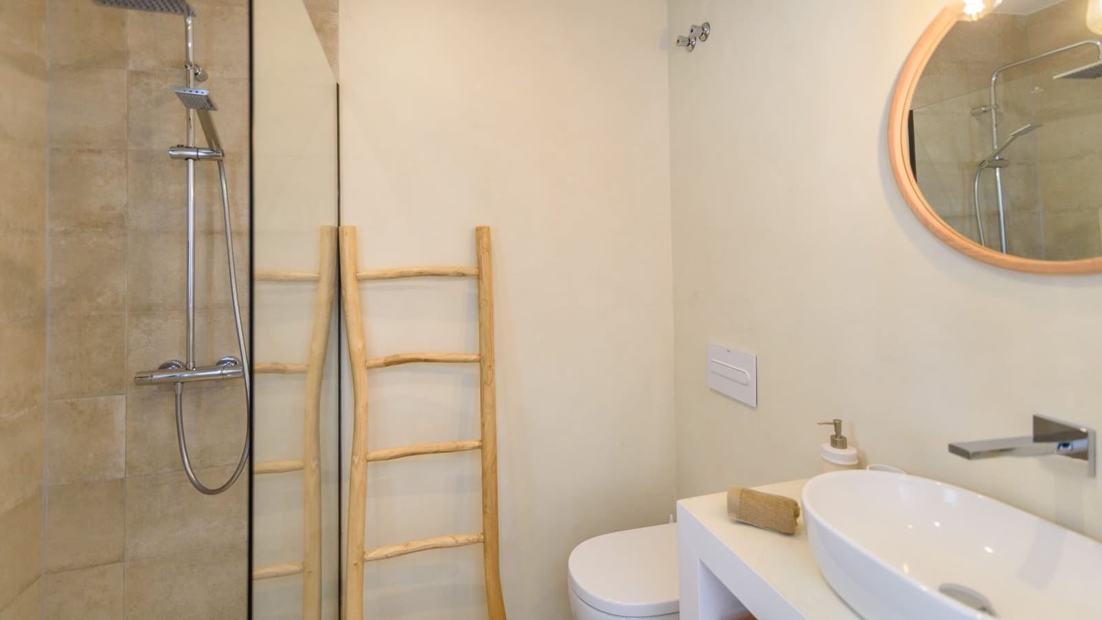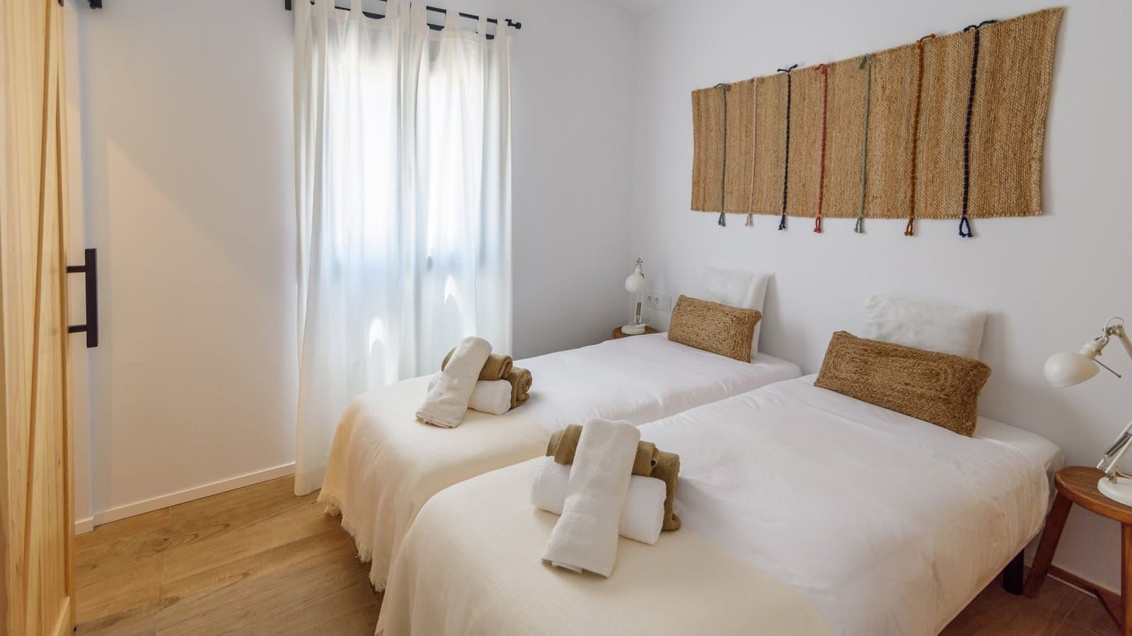 Step into a world of refined comfort, where the interior of this luxury apartment rental in Axarquia blends modern sophistication with traditional charm. The open-plan living area, adorned with neutral tones and natural wicker accents, creates a soothing ambiance perfect for relaxation. The fully-equipped kitchen invites culinary adventures, while the spacious living room provides a cozy retreat with a flatscreen TV for entertainment. Each of the three bedrooms offers a tranquil haven, ensuring restful nights for all guests.