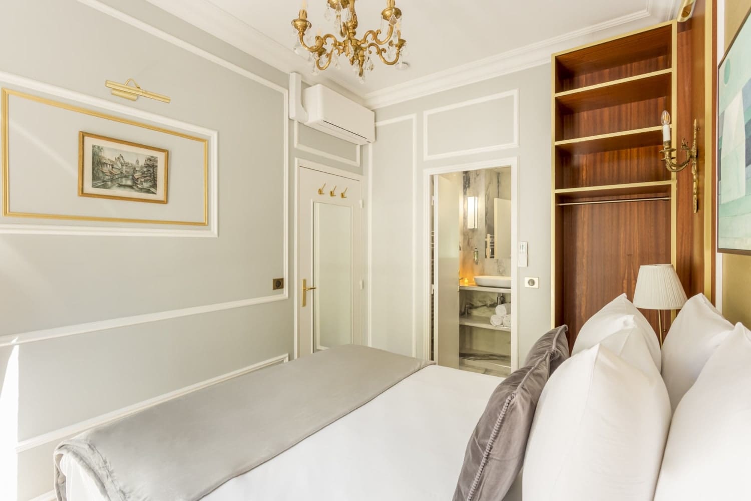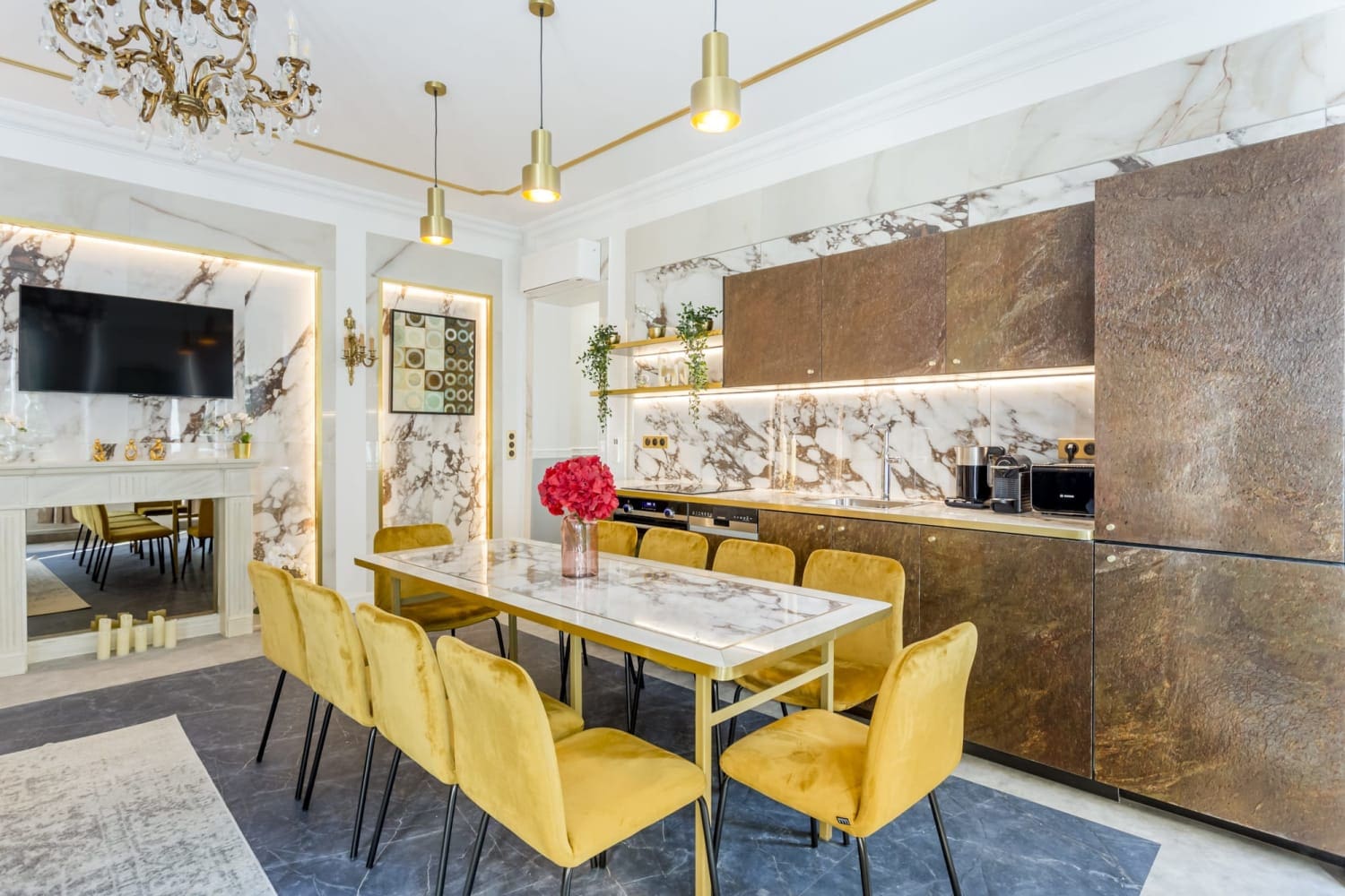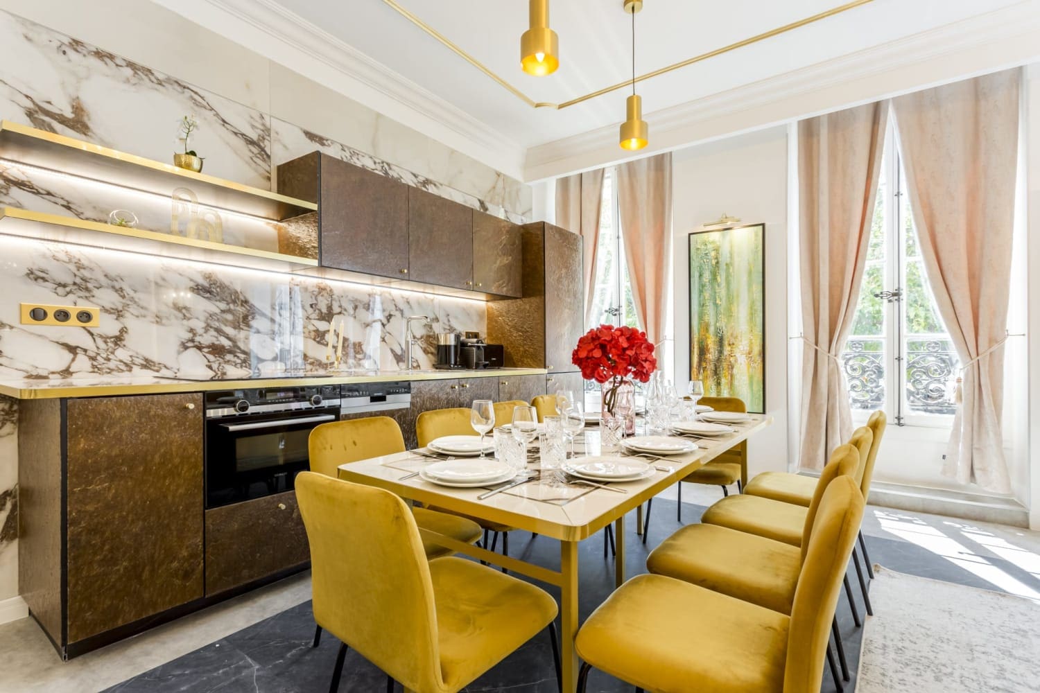 Step inside this meticulously designed apartment, featuring four spacious bedrooms and bathrooms, accommodating up to nine guests. The interiors showcase a harmonious blend of modern French design with heritage elements, including luxurious marble finishes and elegant crystal chandeliers. The living area is a haven of comfort, with French doors leading to Juliet balconies that invite natural light and provide a glimpse of the bustling Parisian streets. The kitchen, while perfect for preparing light meals, encourages you to savor the culinary delights found in the local eateries.