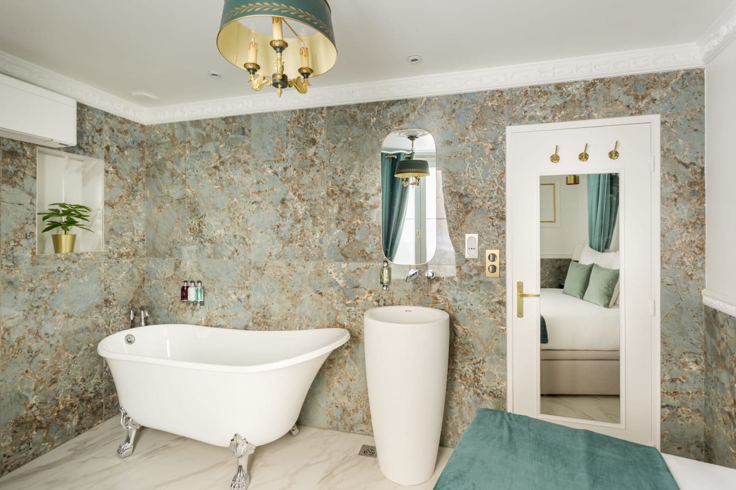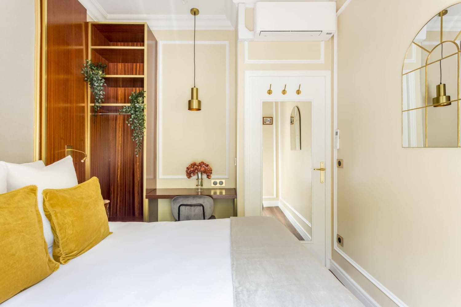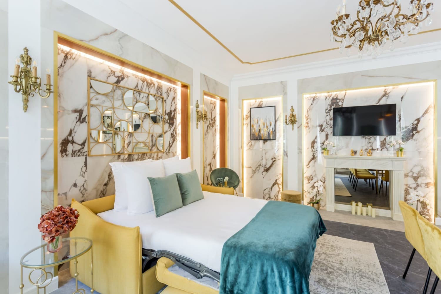Step inside this meticulously designed apartment, featuring four spacious bedrooms and bathrooms, accommodating up to nine guests. The interiors showcase a harmonious blend of modern French design with heritage elements, including luxurious marble finishes and elegant crystal chandeliers. The living area is a haven of comfort, with French doors leading to Juliet balconies that invite natural light and provide a glimpse of the bustling Parisian streets. The kitchen, while perfect for preparing light meals, encourages you to savor the culinary delights found in the local eateries.