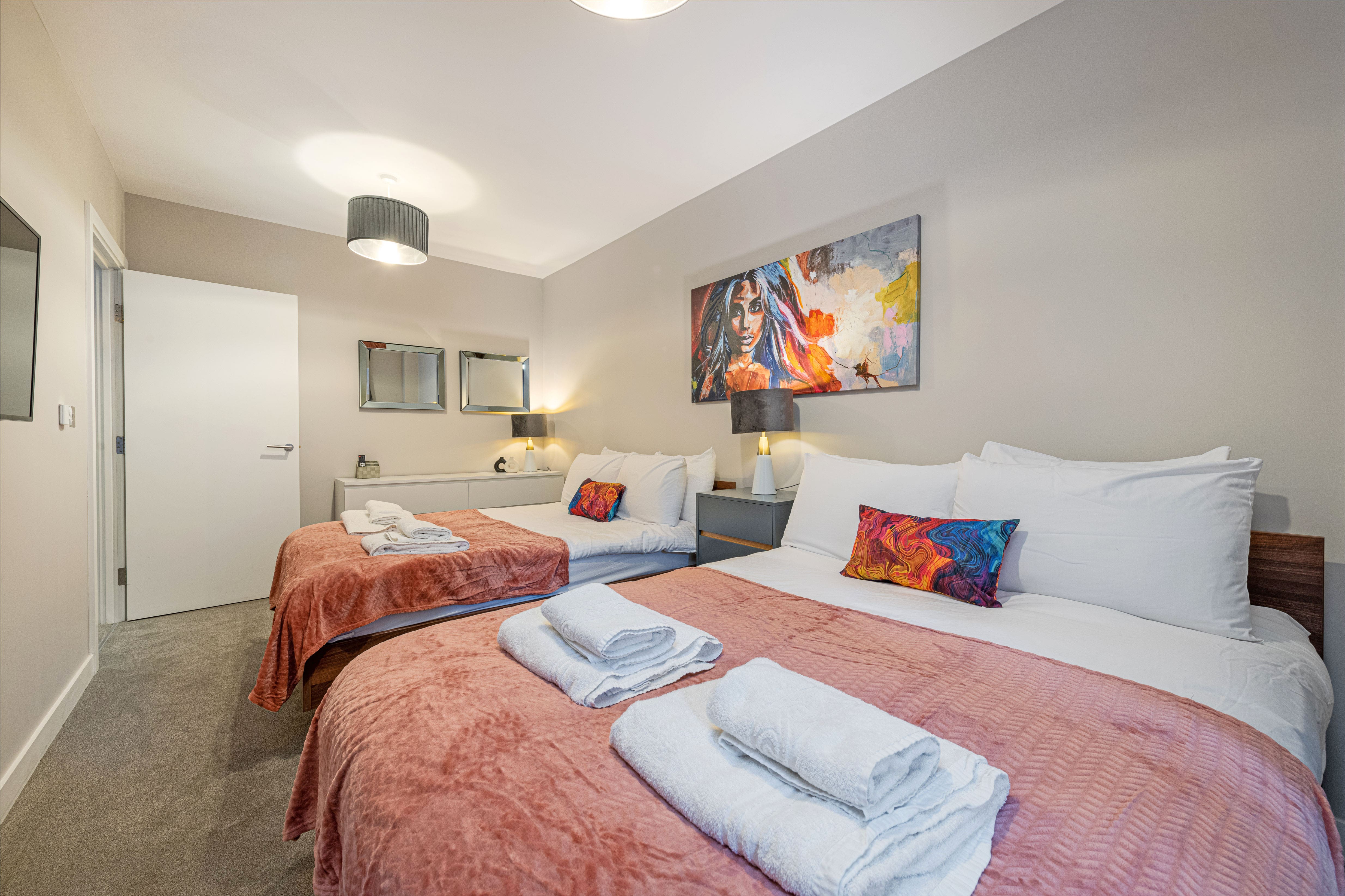 The apartment accommodates up to 13 guests across four bedrooms and additional living room bedding. Note that stairs may pose a challenge for those with mobility issues. Pets are welcome, making it a perfect choice for the entire family. For further options, browse our luxury villa rentals in United Kingdom.