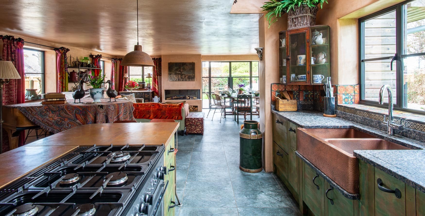 It’s fair to say that this isn’t your typical English village getaway. For a start, the interior design is more boho than rustic, with the preference for patterned tiles, weathered materials and shelves packed full of trinkets making it rather unique around these parts. The gargantuan kitchen was designed by a chef of thirty-five years and is a culinary whizz’s dream, while there’s also a grand piano for the more musically inclined. Four of the bedrooms are upstairs, but the fifth sits in a shepherd’s hut at the end of the garden complete with a lounge and kitchenette. Inbetween this cute set-up and the main house lies the outdoor space, which is both large and split up into designated zones — a patio with an alfresco dining table (on wheels so you can move it to follow the sunshine), a deck with a corner sofa and a well-maintained lawn that’s ideal for a game of croquet. The timber-framed home is located only twenty minutes’ drive from Oxford, but Blenheim Palace and its sprawling grounds can be seen from some of the bedroom windows and is reached in five minutes’ walk.