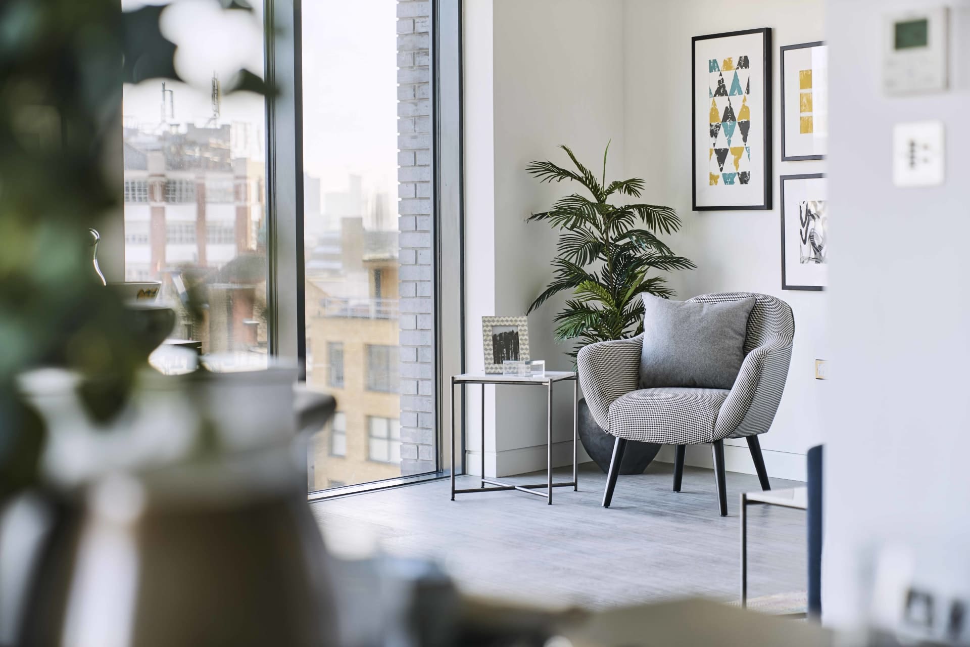 Step into a world of sophisticated design in this stunning sixth-floor apartment. The open-plan living area is adorned with chic modern art, lush houseplants, and exquisite pottery, creating a warm and inviting atmosphere. Large floor-to-ceiling windows flood the space with natural light and offer breathtaking views of East London’s iconic Victorian terraces. The sleek, monolithic kitchen is a nod to the area’s industrial past, equipped with state-of-the-art appliances for culinary enthusiasts. Each of the three bedrooms is a sanctuary of comfort, with the twin bedroom doubling as a workspace, making it ideal for business travelers or those working remotely.