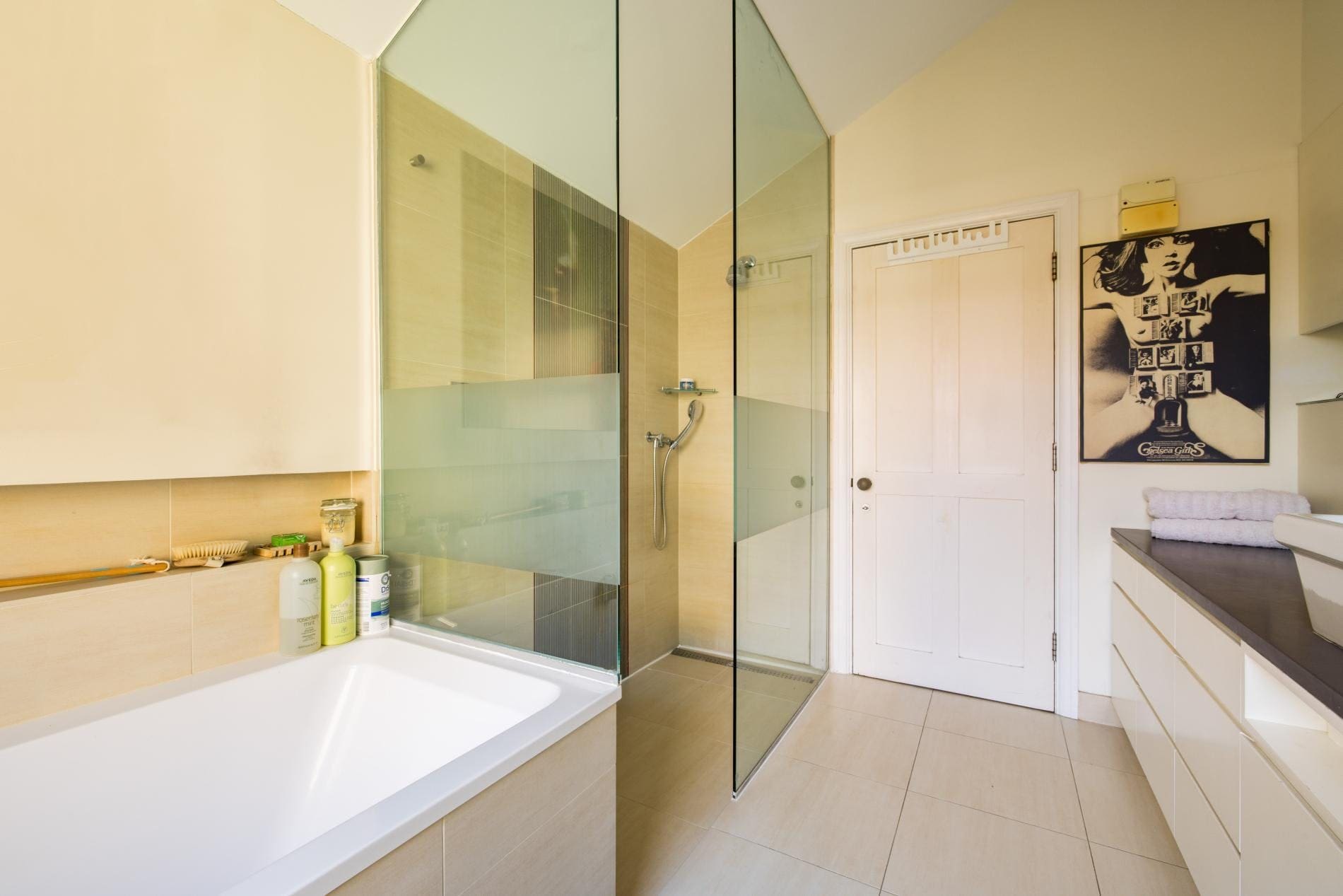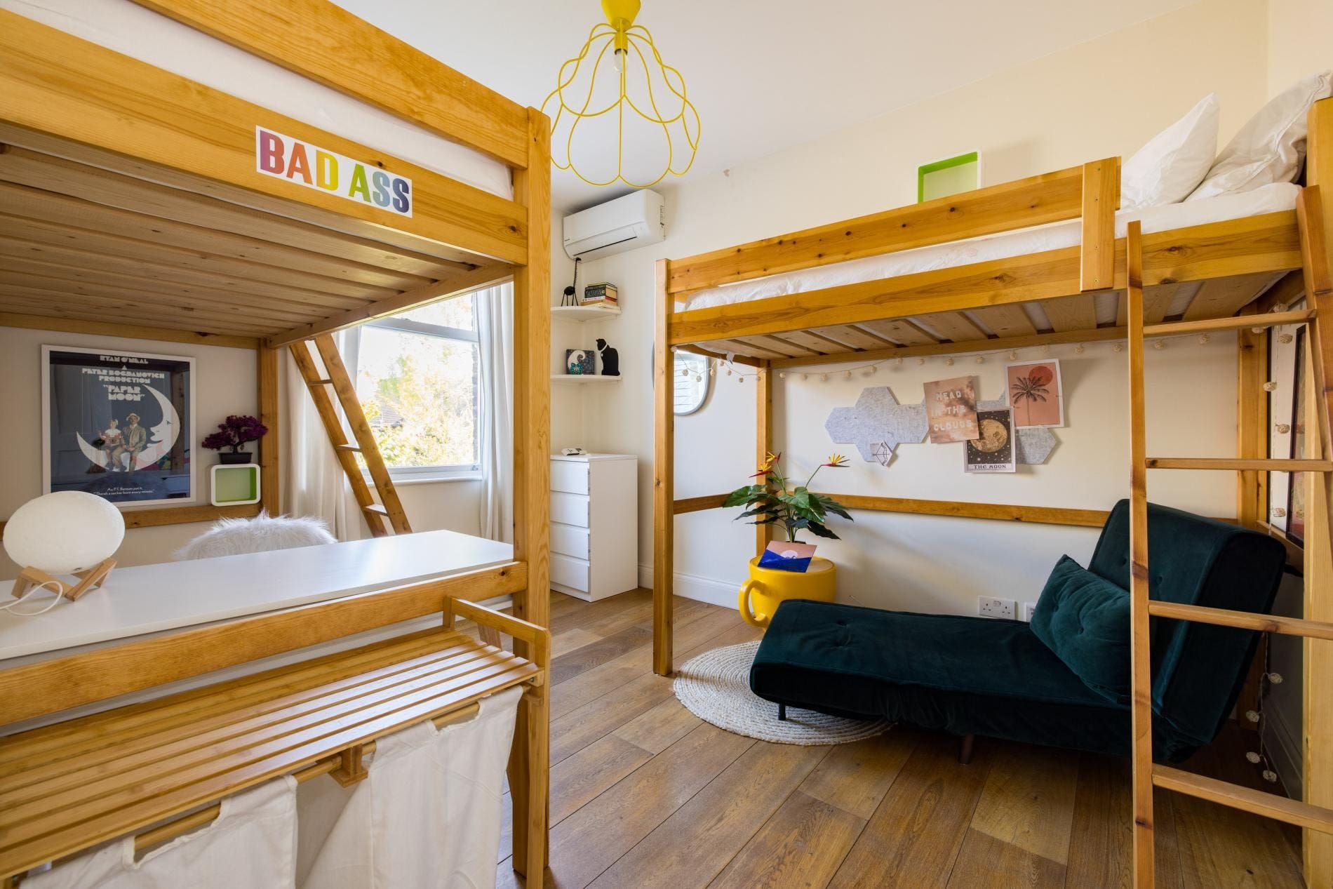 Step inside to discover a thoughtfully designed interior, characterized by its artistic flair and comfortable spaces. The sunken lounge, complete with vintage Czech movie theatre seating, invites relaxation, while the main living room features a unique hanging bubble chair and a piano, providing a creative space for leisure. The kitchen is fully equipped with modern appliances, ensuring you have everything you need to prepare gourmet meals. The three bedrooms offer flexible sleeping arrangements, including a loft bedroom with a sofa bed and a children’s room with single bunk beds and a futon, making it ideal for families with kids.