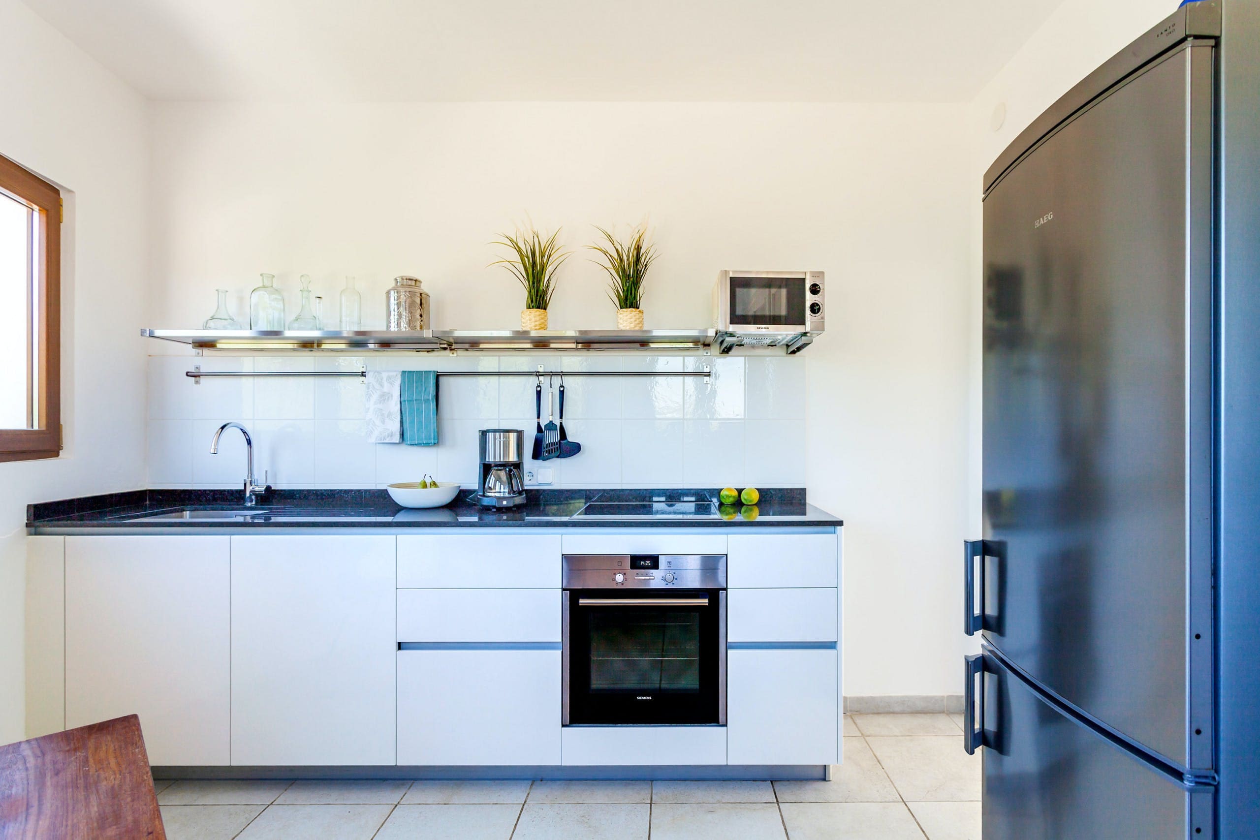 A: Small supermarkets are within walking distance; larger shops are a short drive away in Santanyi.