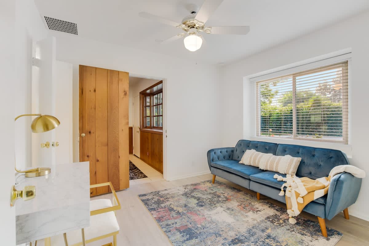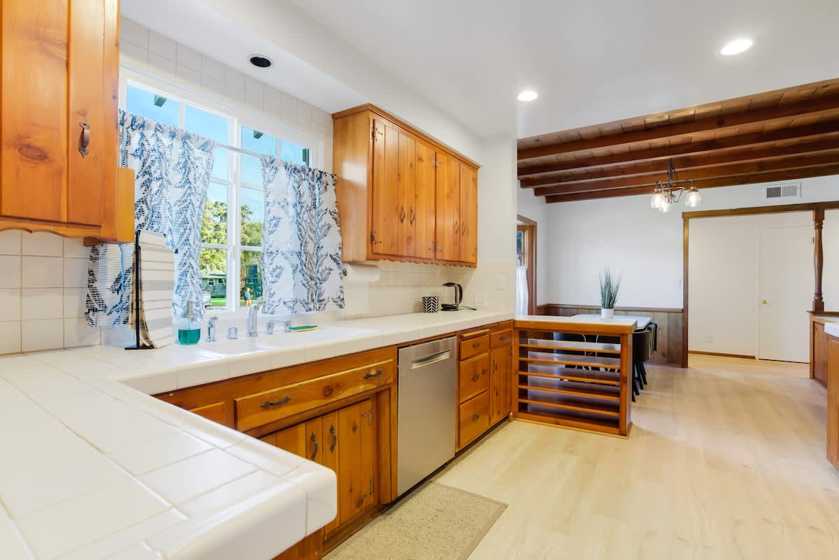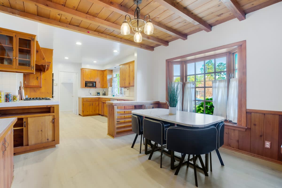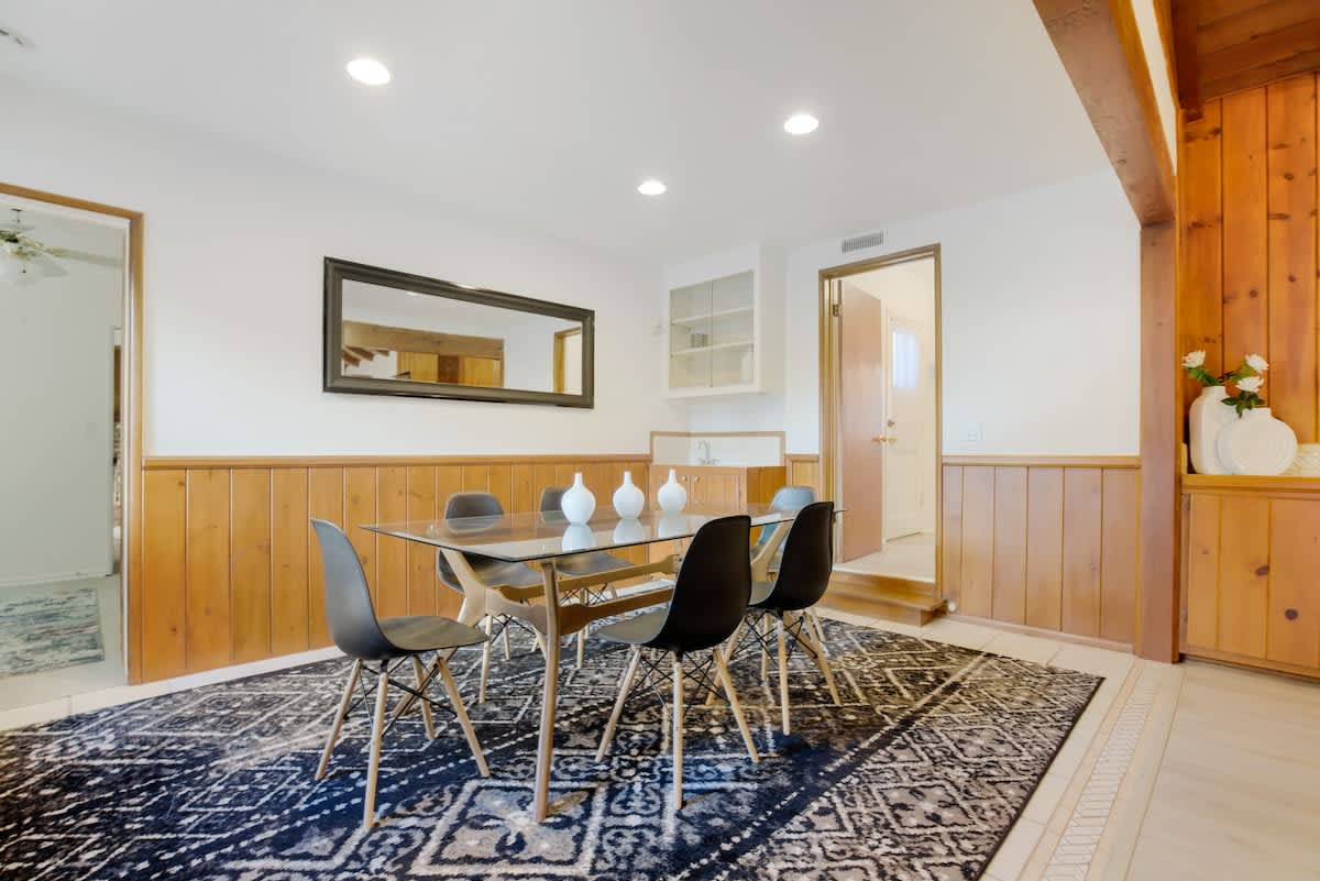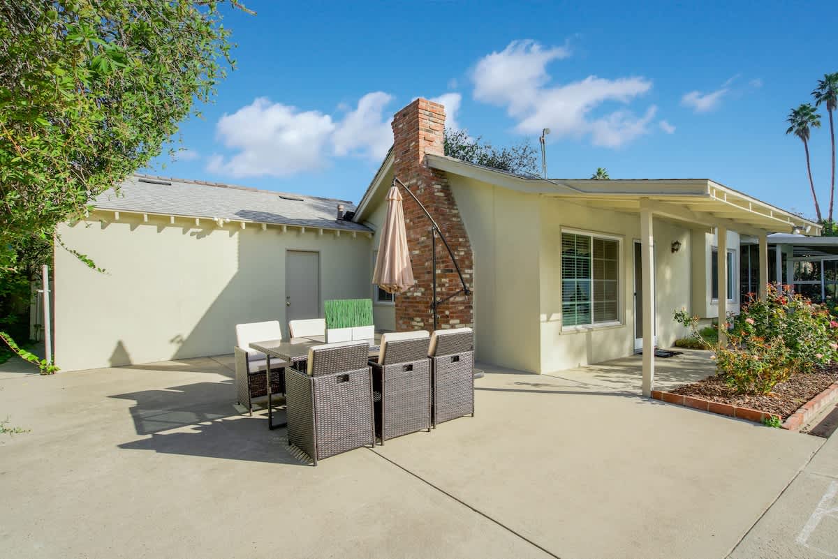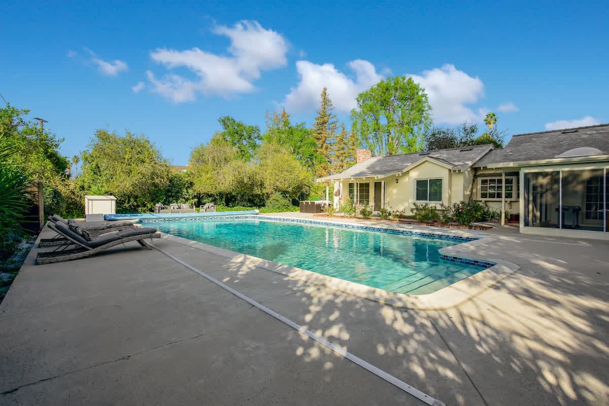 Enjoy the California sunshine in the expansive outdoor area, complete with a sparkling pool and lush gardens. The sunlit terrace is perfect for al fresco dining, while the poolside cabana offers a relaxing spot to unwind. With garden maintenance provided during your stay, you can focus on relaxation and fun.