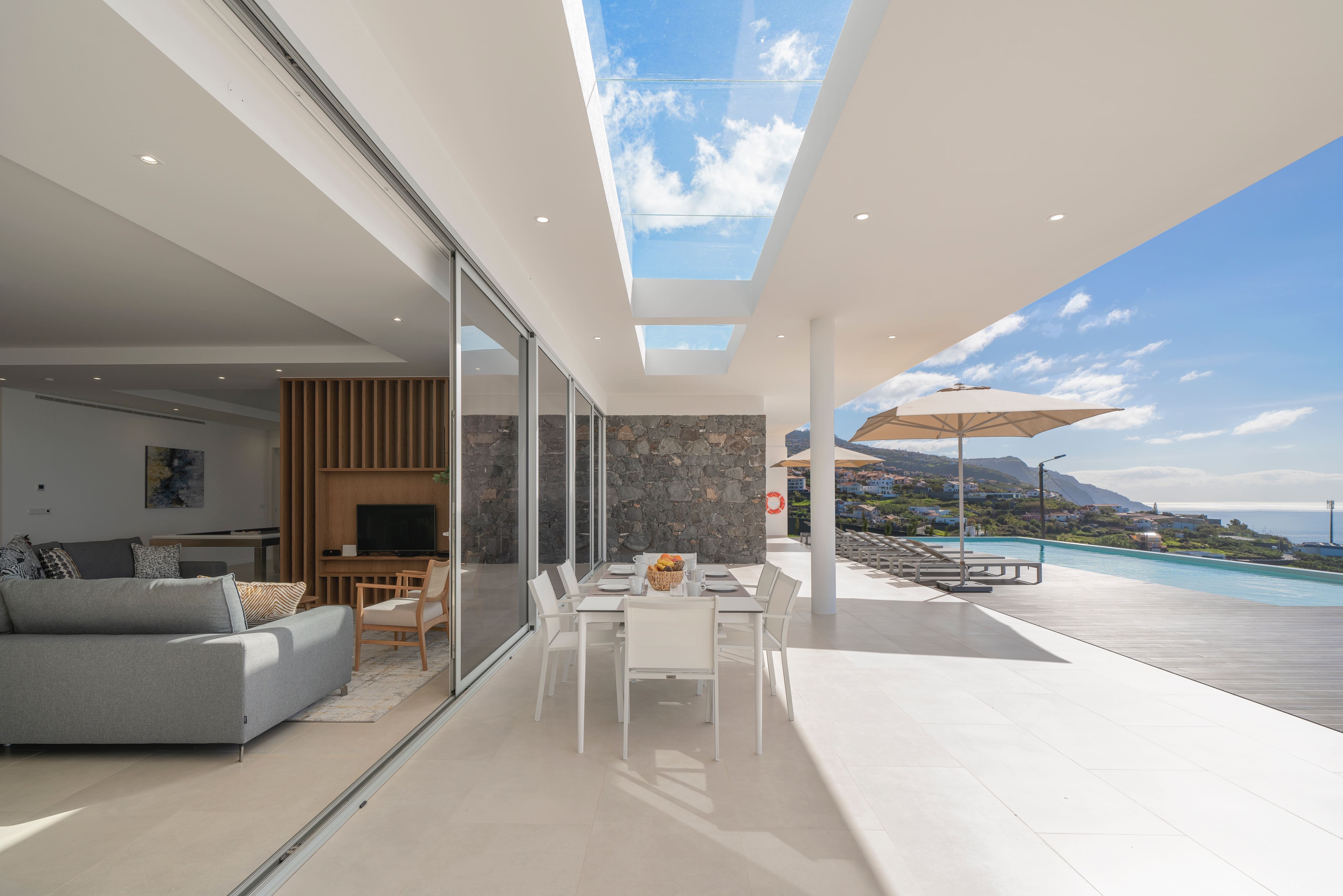 Step into a world of elegance as you enter the spacious interiors of Casa Laurissilva. The open-plan living area is adorned with floor-to-ceiling windows, allowing natural light to flood the space and offering breathtaking views of the coastline. The contemporary design is complemented by plush furnishings, creating a serene atmosphere ideal for relaxation. The modern kitchen is fully equipped with top-of-the-line appliances, perfect for preparing gourmet meals. Each of the four bedrooms is a sanctuary of comfort, featuring en-suite bathrooms for added privacy and convenience.