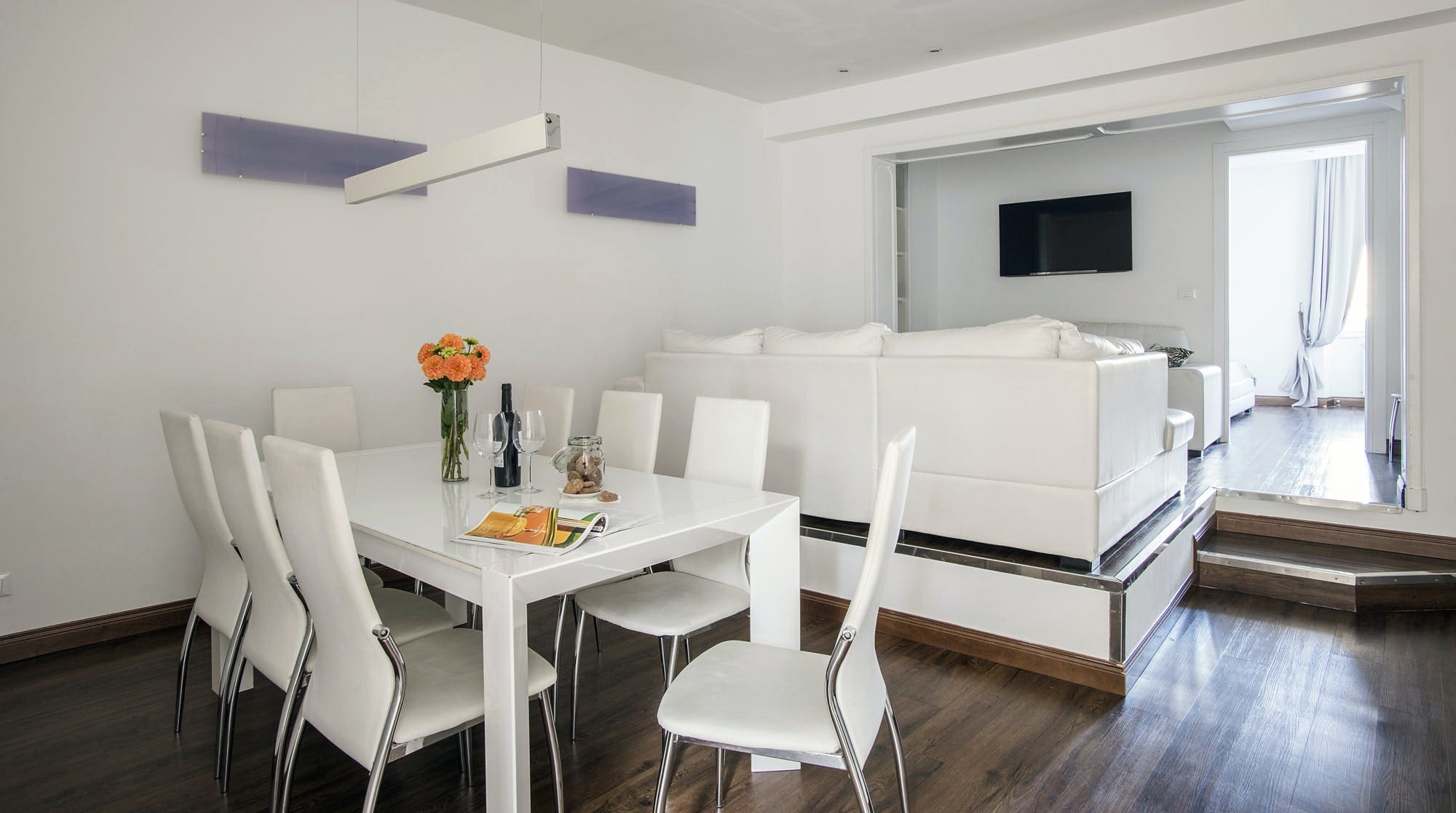 Step into a world of sophisticated design as you enter this expansive living space. The stylish interior features white, leather L-shaped sofas, perfect for relaxation and social gatherings. The kitchen, awash in a striking mulberry-purple, is fully equipped for culinary creations. The apartment boasts a mix of mezzanine sleeping areas and private king-size suites, ensuring comfort for all guests. While the living room might not flood with natural light, its cozy ambiance is unmatched. The master bedroom, though lacking an ensuite, offers a serene retreat.