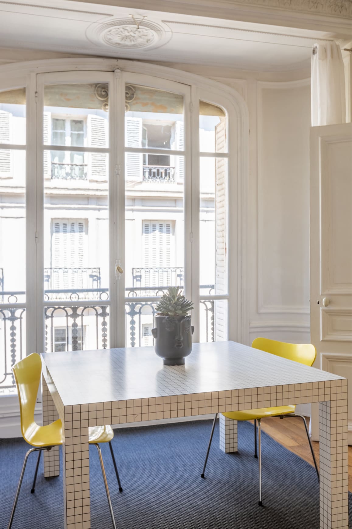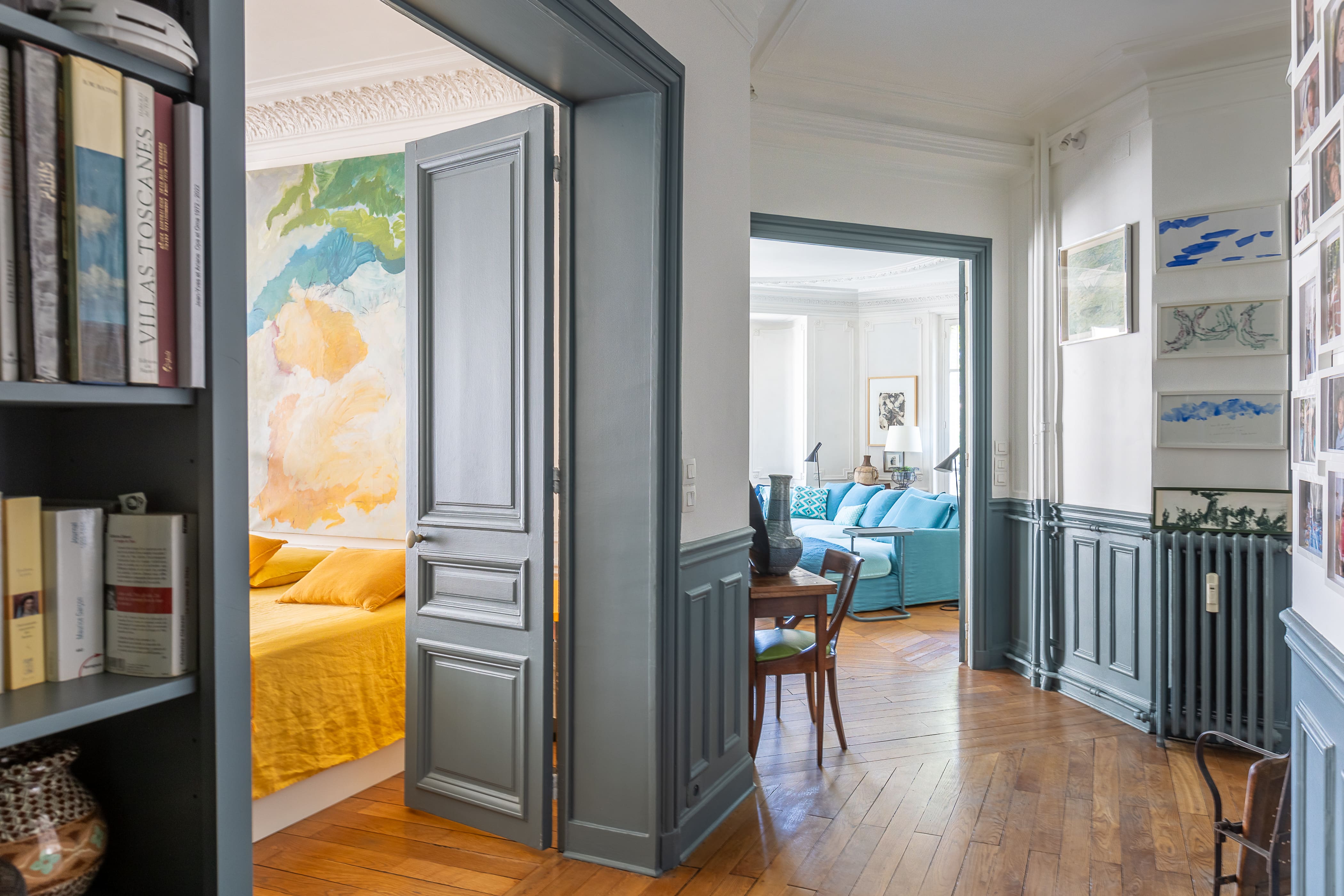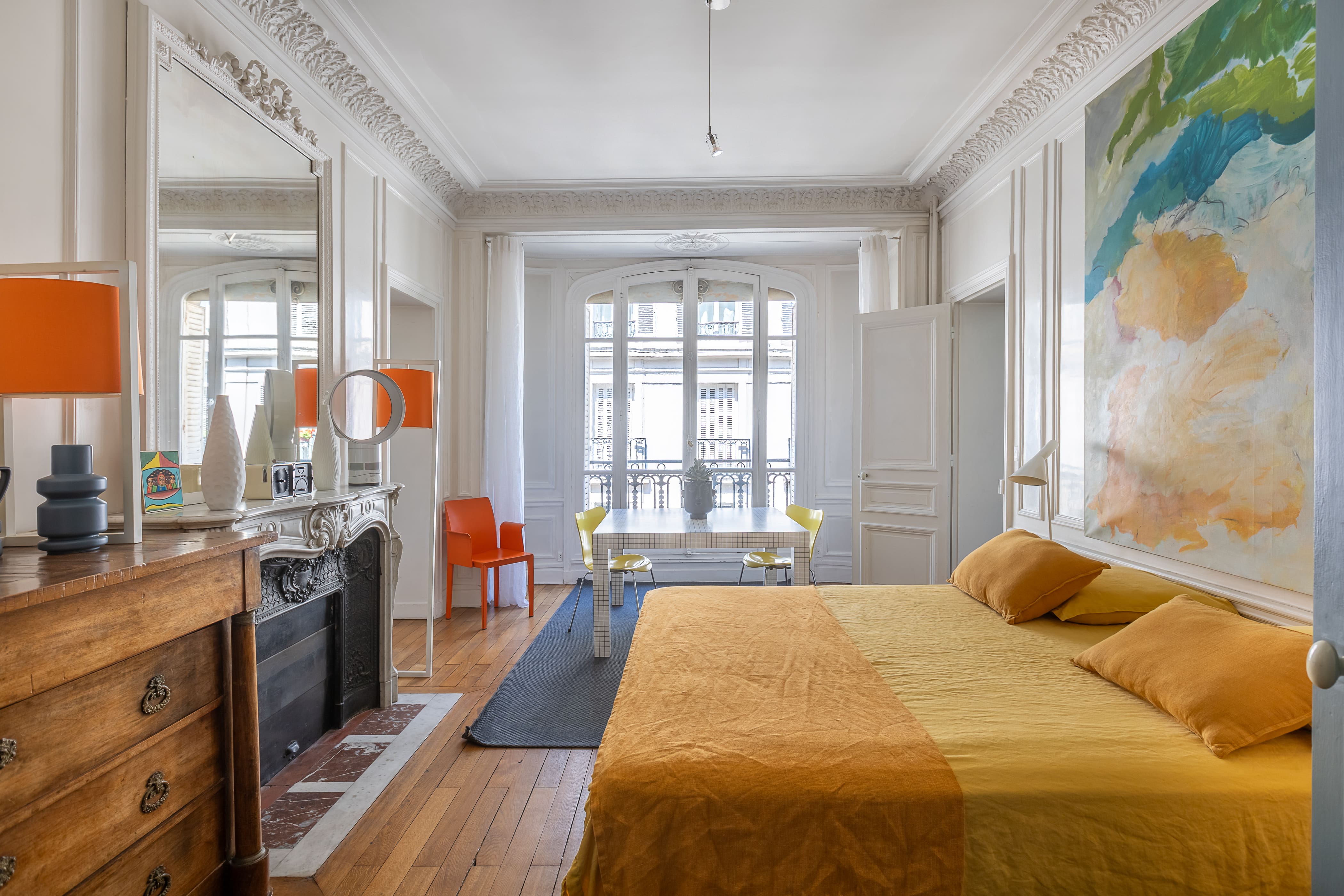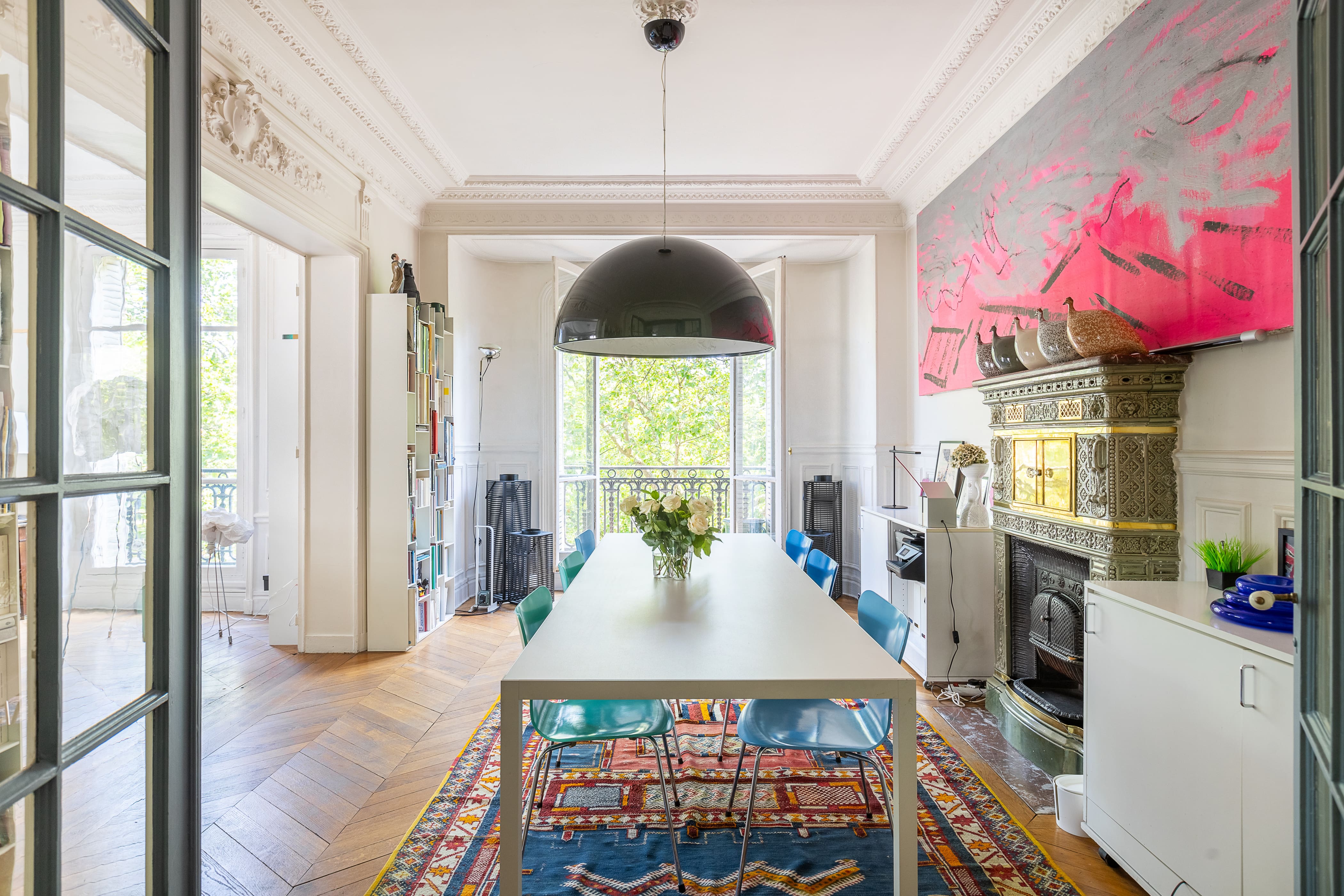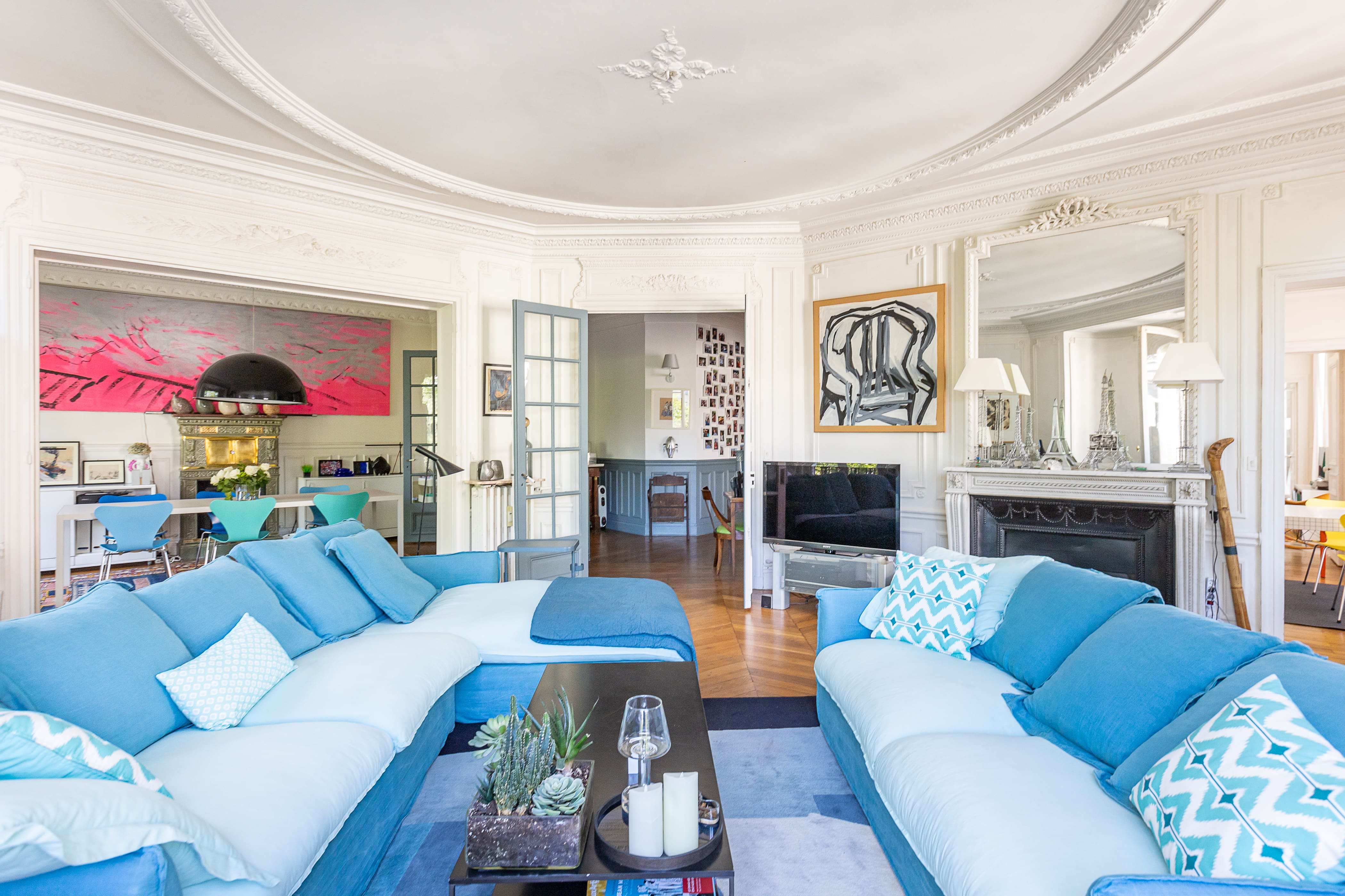 Step inside this Parisian gem, where traditional Hausmannian architecture meets modern elegance. The apartment features large windows that flood the space with natural light, highlighting the Hungarian point hardwood floors and intricate mouldings. The living area is adorned with bright blue velvet couches and contemporary artwork, creating a vibrant atmosphere perfect for conversation and relaxation. The dining area boasts a large table that can accommodate up to twelve guests, making it a perfect setting for memorable dinner parties. The modern kitchen is fully equipped, catering to all your culinary needs.