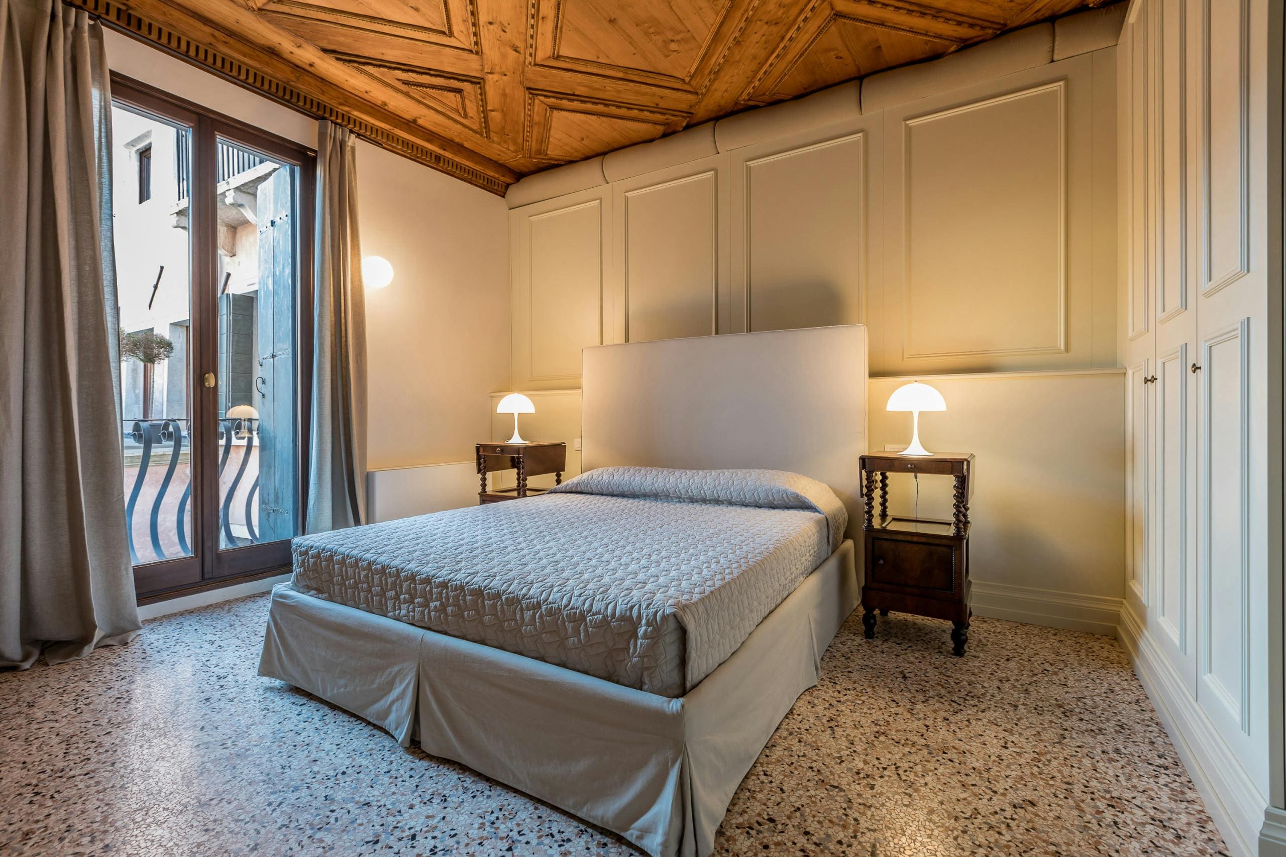 The interior of the apartment is a masterpiece of design and comfort. Meticulously crafted by renowned architect Alberto Torsello, the space features stunning terrazzo floors and vibrant frescoes that narrate the rich history of Venice. The grand living area, with its Soffitto a Cassettoni wooden ceilings, provides an inviting space for relaxation. The fully equipped kitchen is a culinary enthusiast’s dream, while the three elegantly designed bedrooms promise restful nights. Each room is a sanctuary of comfort, offering a perfect retreat after a day exploring the canals of Venice.