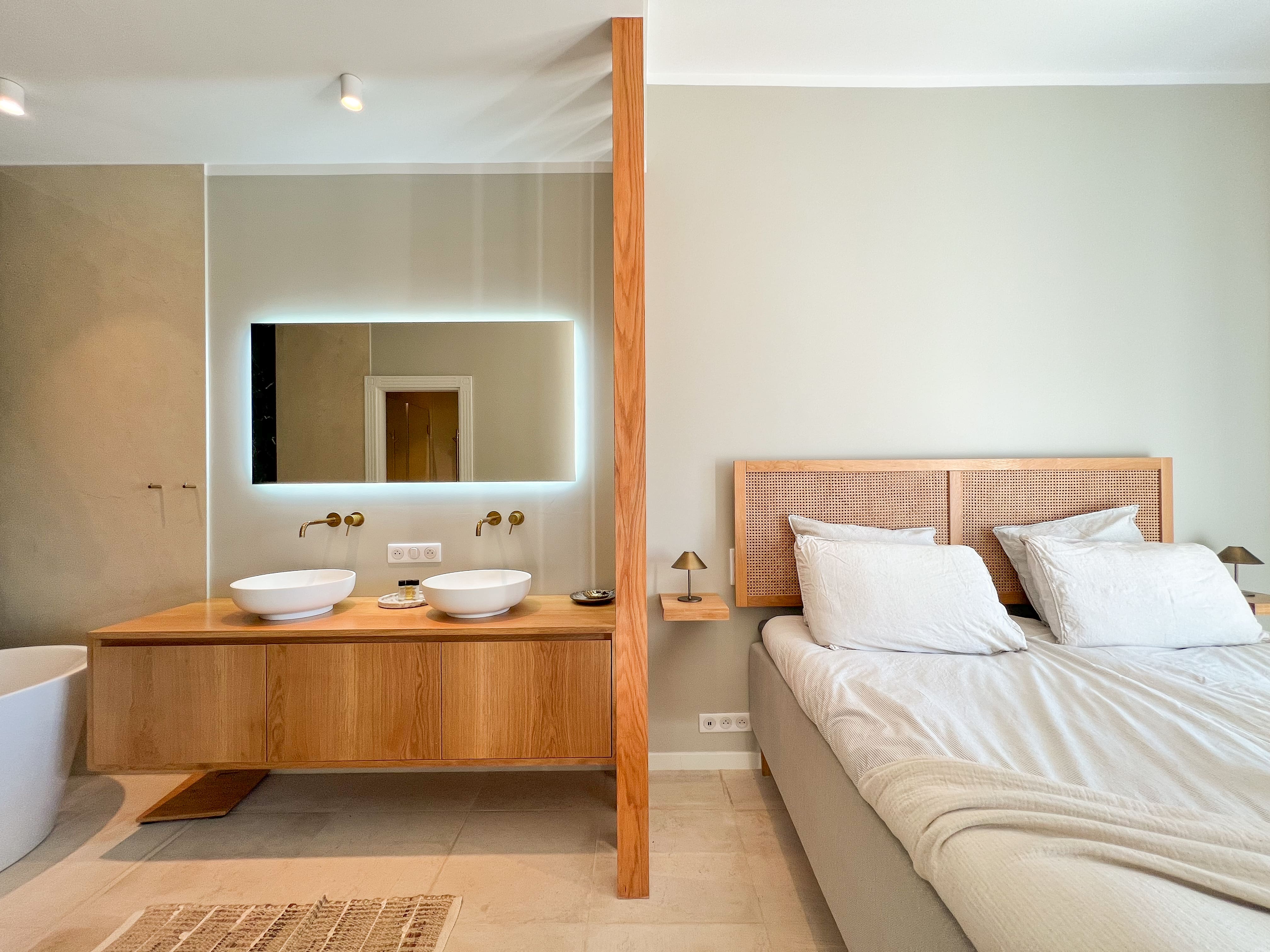 Step inside this elegant abode to discover a blend of modern sophistication and classic charm. The main villa, complemented by an apartment and two independent studios, offers ample space and privacy for up to 16 guests. Each of the eight bedrooms is designed with comfort in mind, featuring king-size beds and plush furnishings. The living spaces are airy and bright, with large windows framing the stunning Mediterranean views. A fully-equipped kitchen invites culinary exploration, while the expansive dining area is perfect for gatherings.