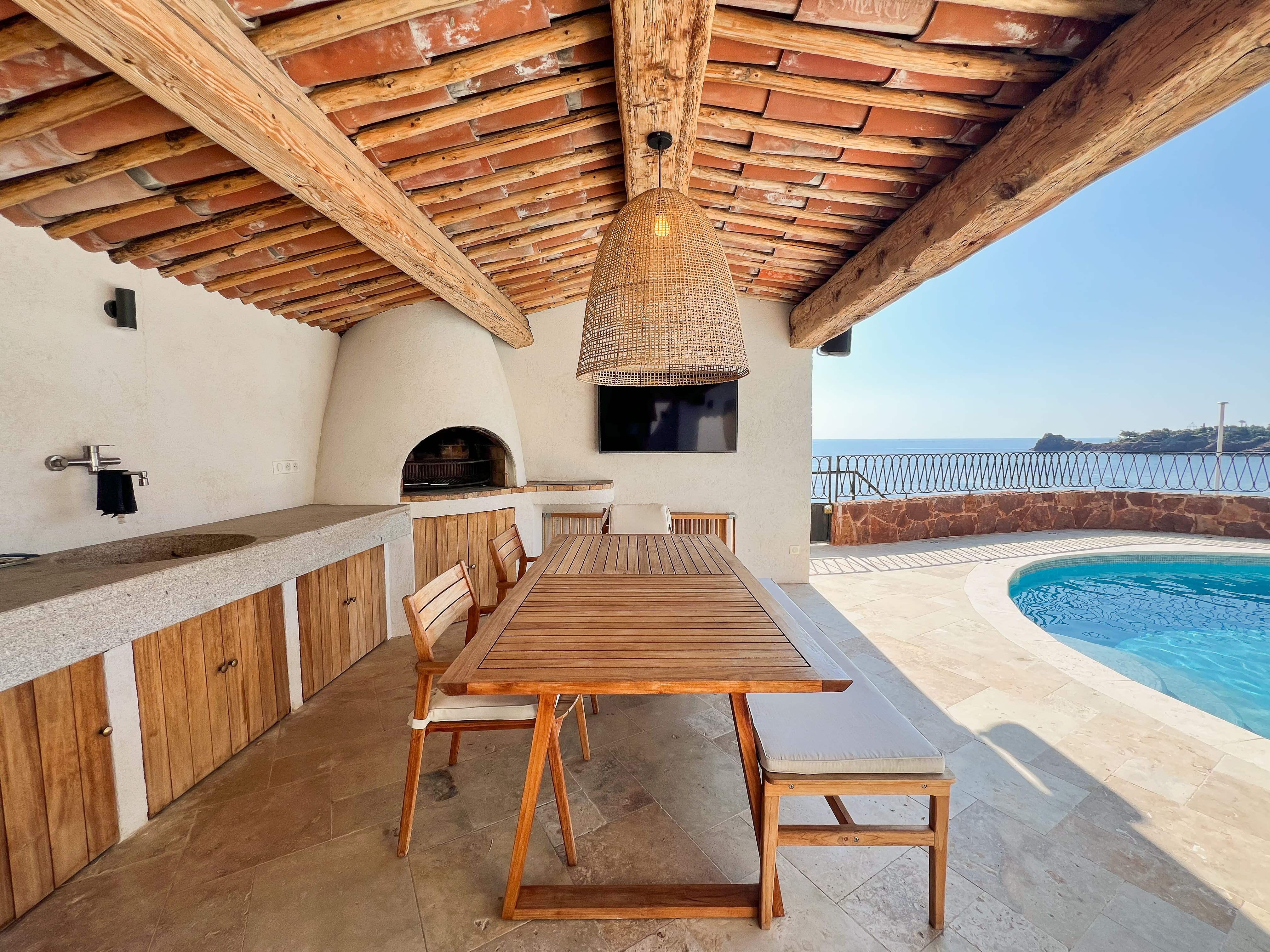 Outside, the private heated pool serves as a centerpiece for relaxation, surrounded by sun loungers and vibrant gardens. Enjoy alfresco dining on the terrace equipped with a barbecue, or simply unwind and soak in the panoramic sea views. With direct access to the nearby beach, the lure of the ocean is just steps away.