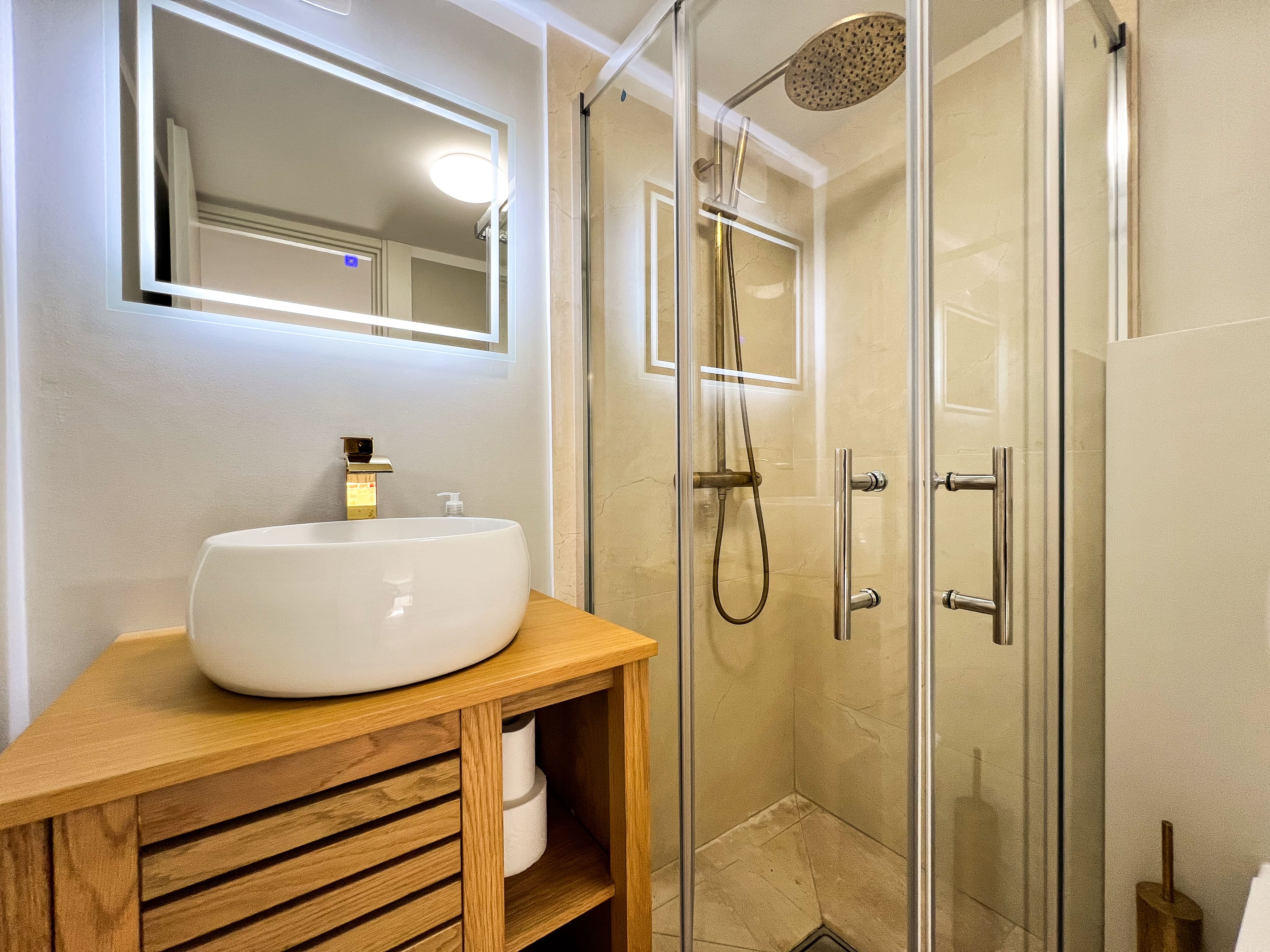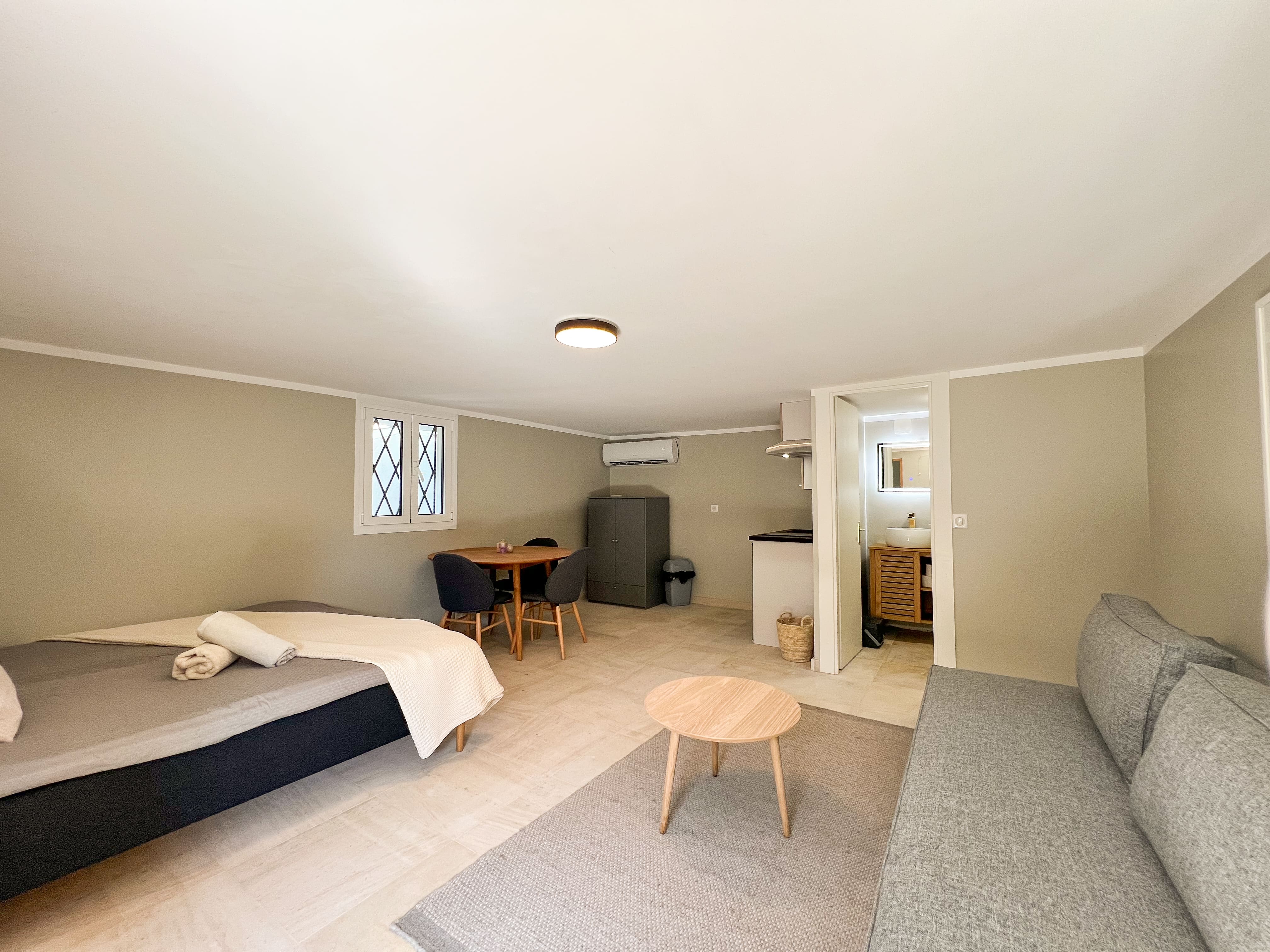 This Cannes house accommodates up to 16 guests across eight bedrooms and seven bathrooms. Private parking is available for six vehicles, with additional space for three more. The studios offer extra privacy, complete with king-size beds and sofa beds. For more options, browse our luxury villa rentals in France.