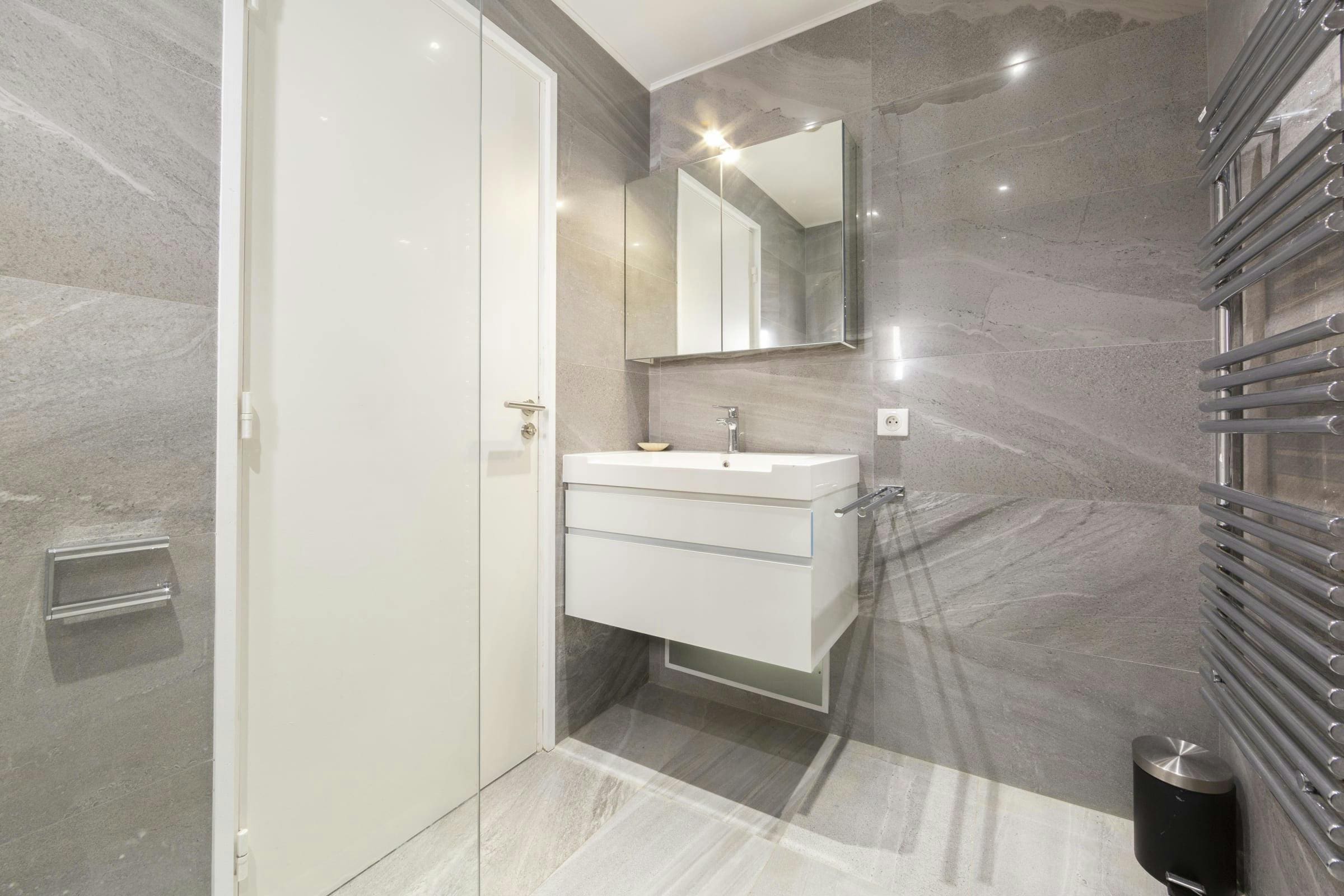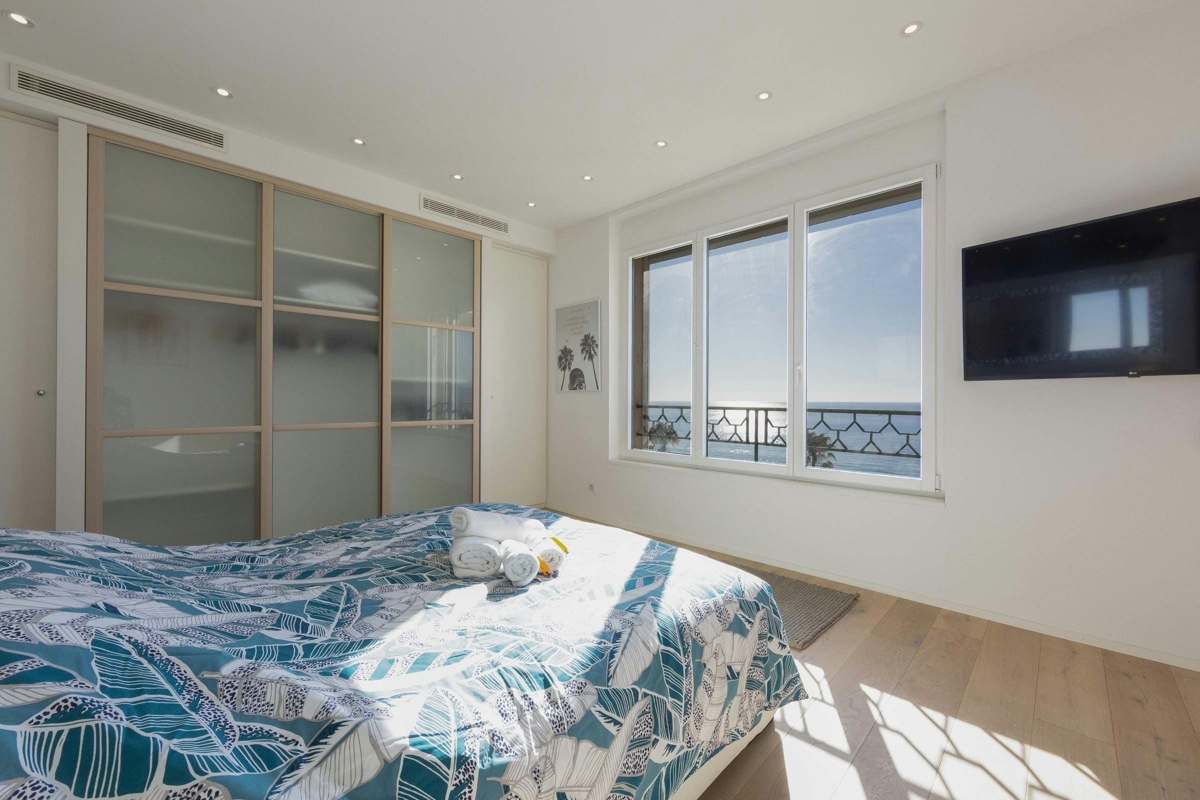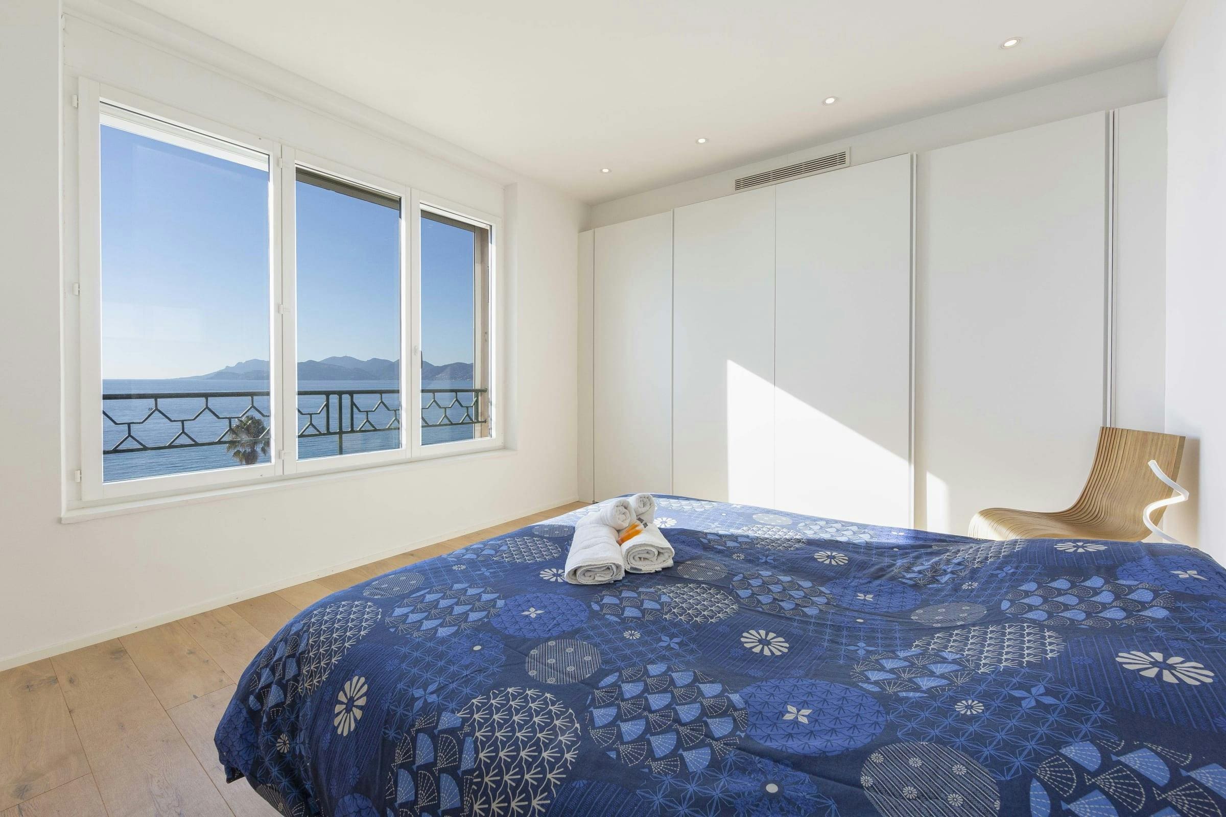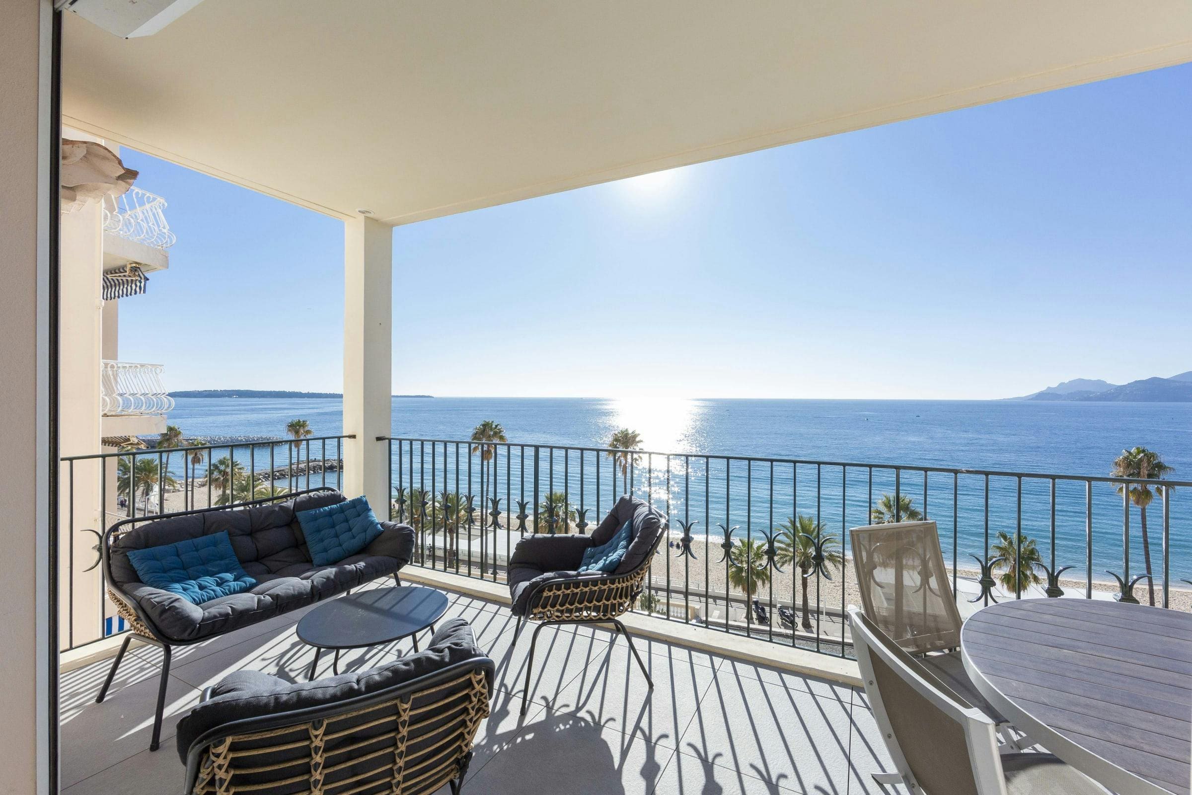 Relax on the sunny terrace, where the mesmerizing sea views create a peaceful retreat. An additional shaded balcony offers a tranquil space to unwind with a book or a glass of wine. The apartment’s proximity to the beach and port means you’re never far from the vibrant life of Cannes, yet you can always return to your serene sanctuary.