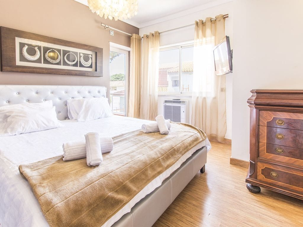 The apartment accommodates up to nine guests with five bedrooms and three bathrooms. Onsite parking is available for up to three cars, ensuring convenience for guests. Please note that pets are not allowed, and a housekeeper visits to maintain the communal spaces and bedrooms. For more options, browse our luxury villa rentals in Portugal.