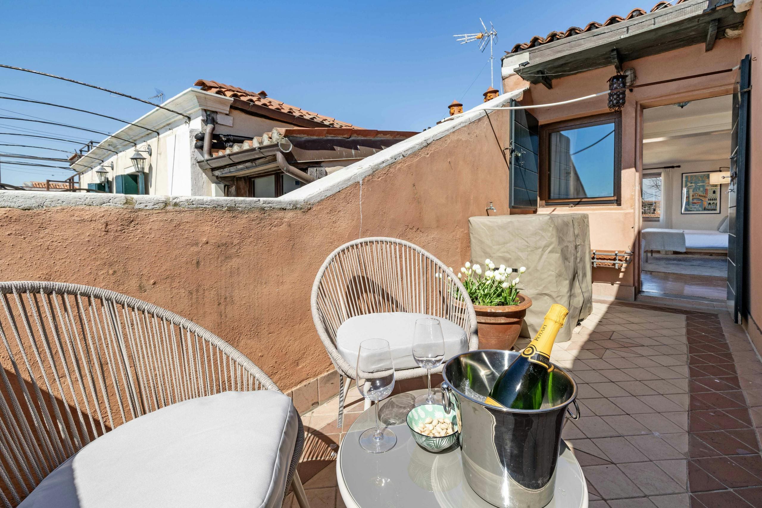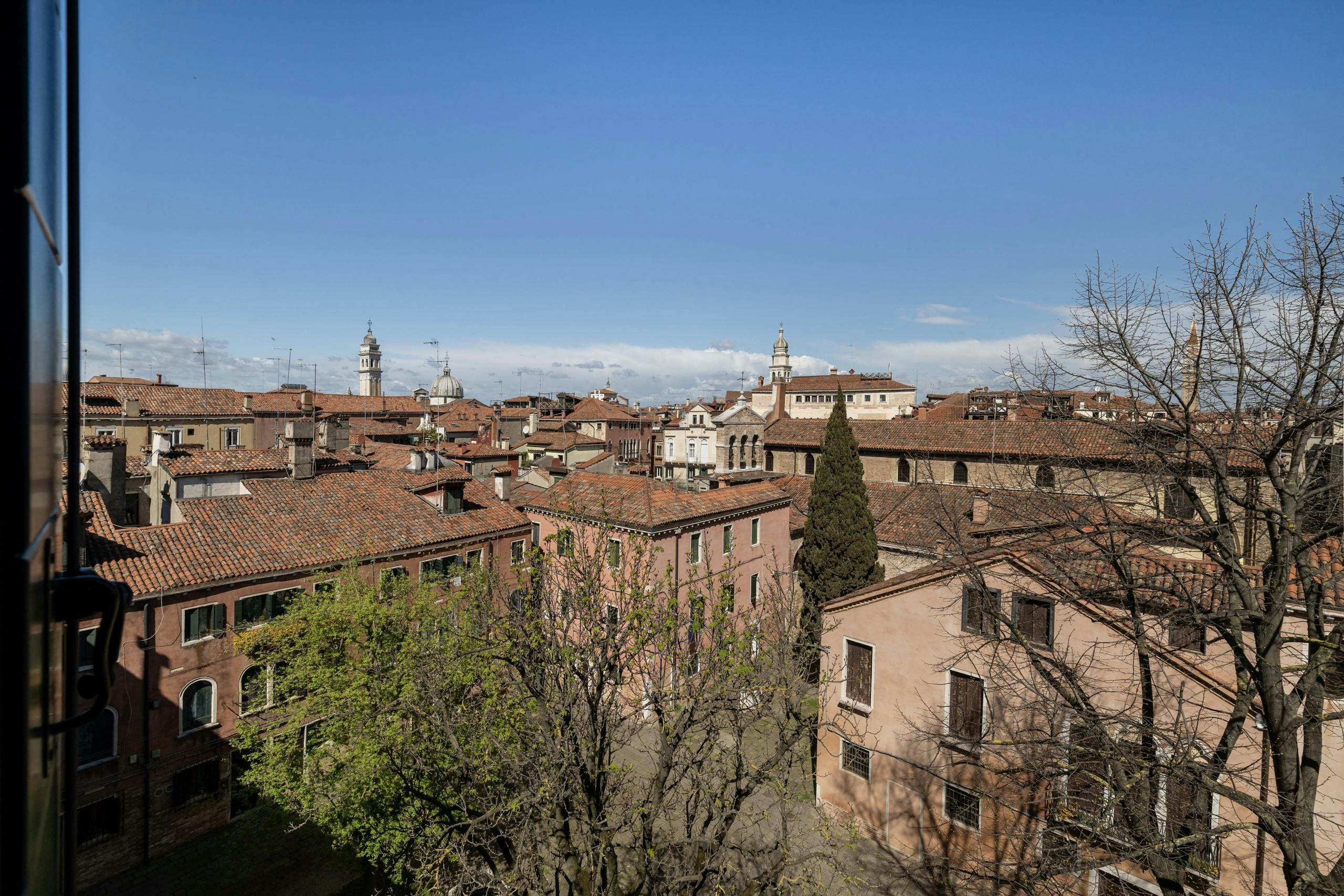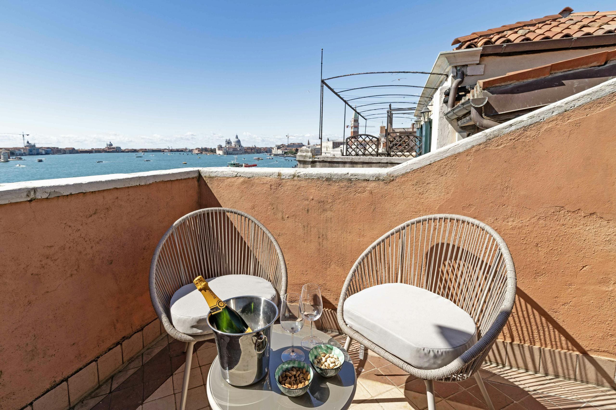 The apartment boasts private terraces that offer panoramic views across Venice, including glimpses of the Lido, Giudecca, and San Giorgio. These outdoor spaces are ideal for enjoying a morning coffee or an evening aperitif while soaking in the rich Venetian atmosphere. Although the property does not feature a garden or pool, its proximity to the Venetian canals provides a unique aquatic charm.