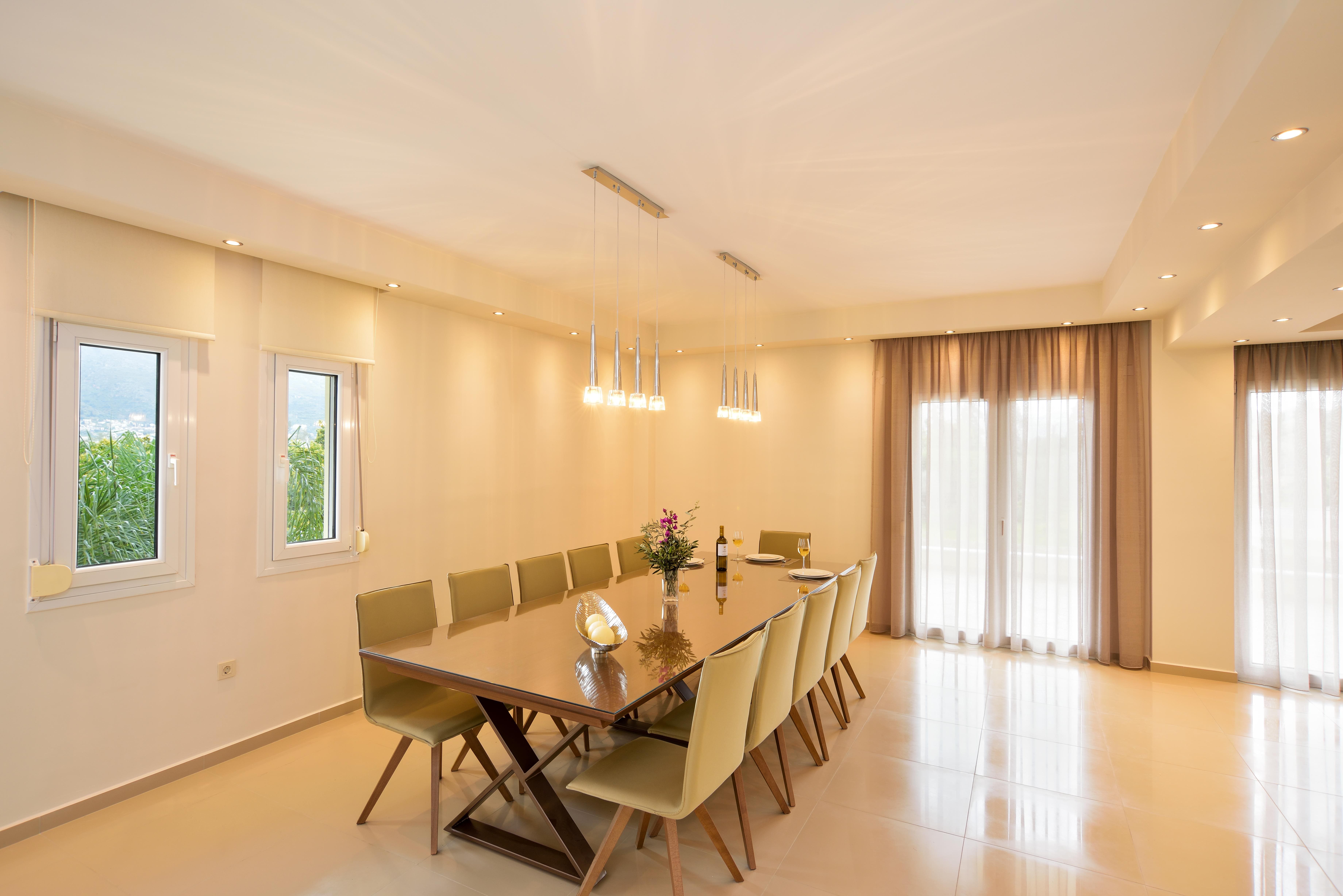 The interior of this luxury apartment in Chania is a testament to contemporary design and high-end amenities. The main living space is a serene oasis with its whites and creams, exuding a cool and calm ambiance. This expansive property boasts two fully equipped kitchens, ideal for those wanting to enjoy a little independence. The main kitchen is high-tech, featuring a wine fridge and an ice machine among other modern conveniences. The seven bedrooms are elegantly furnished, offering ample space and privacy, while the six bathrooms include indulgent features such as a Jacuzzi bathtub for ultimate relaxation.