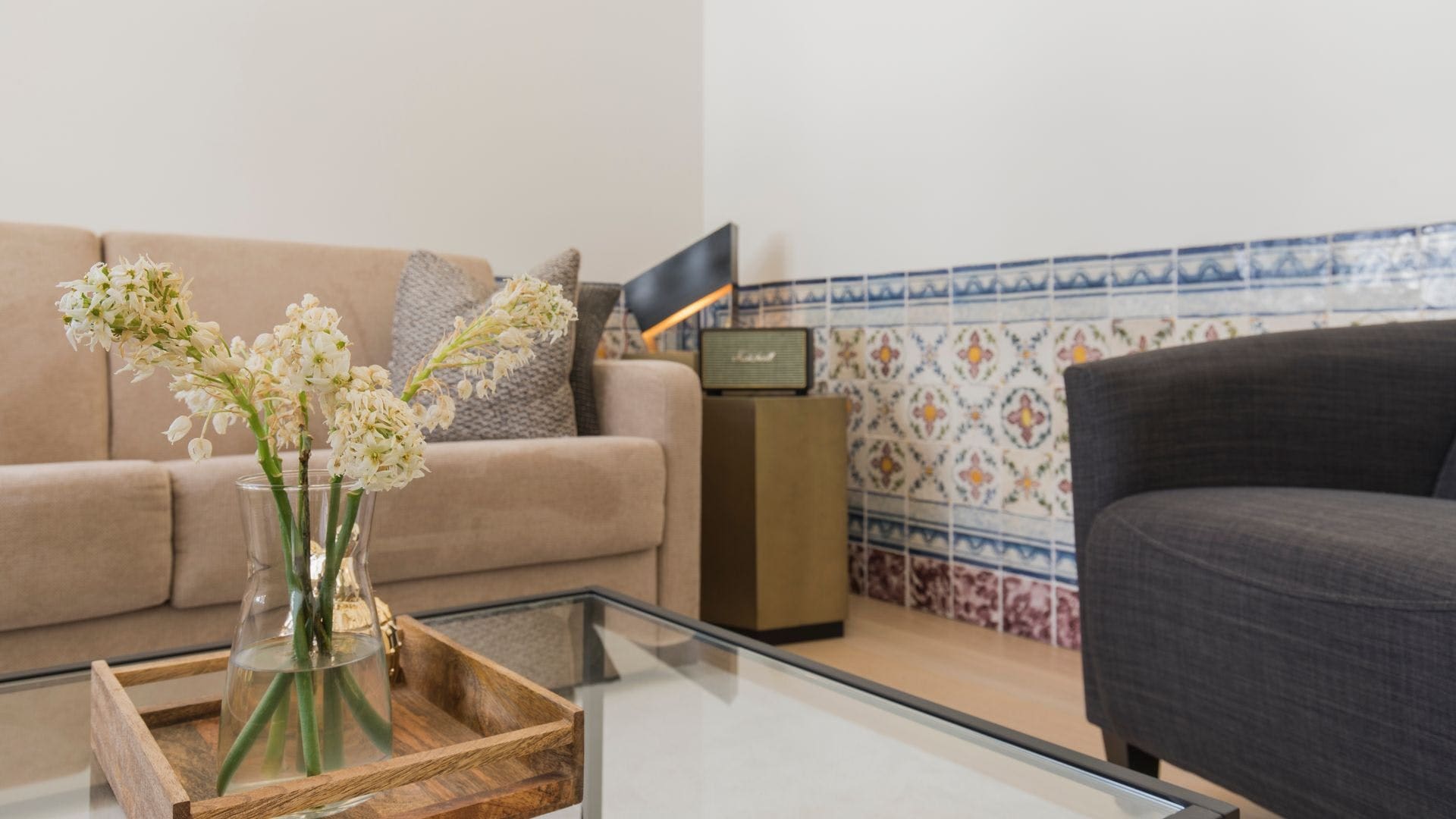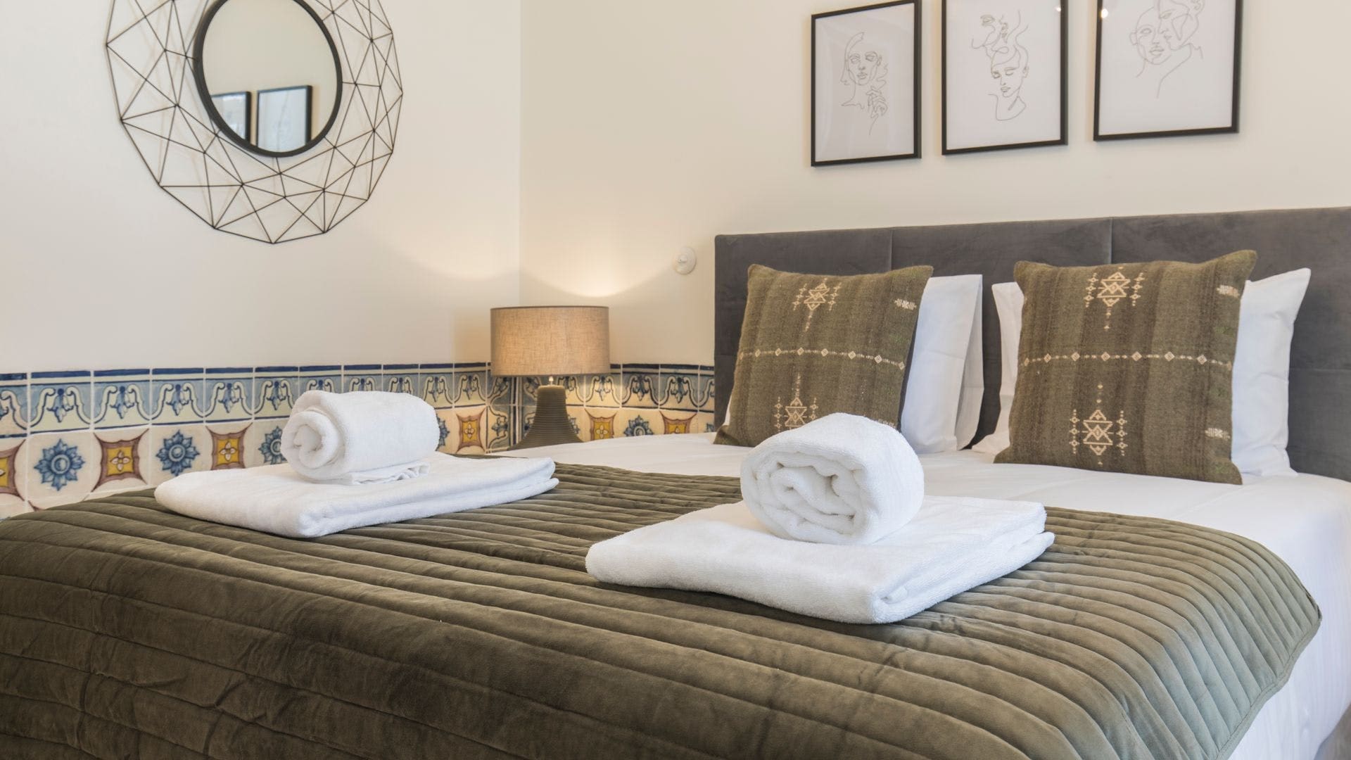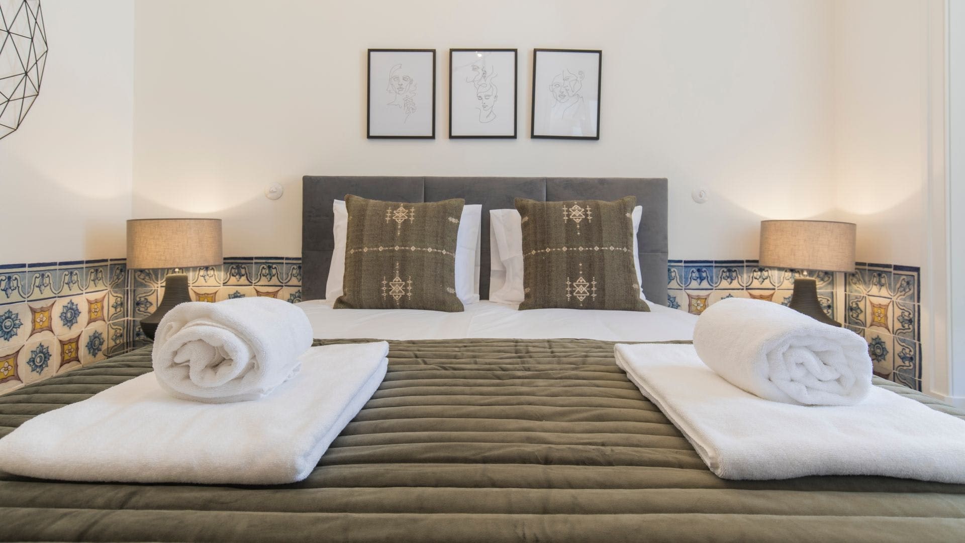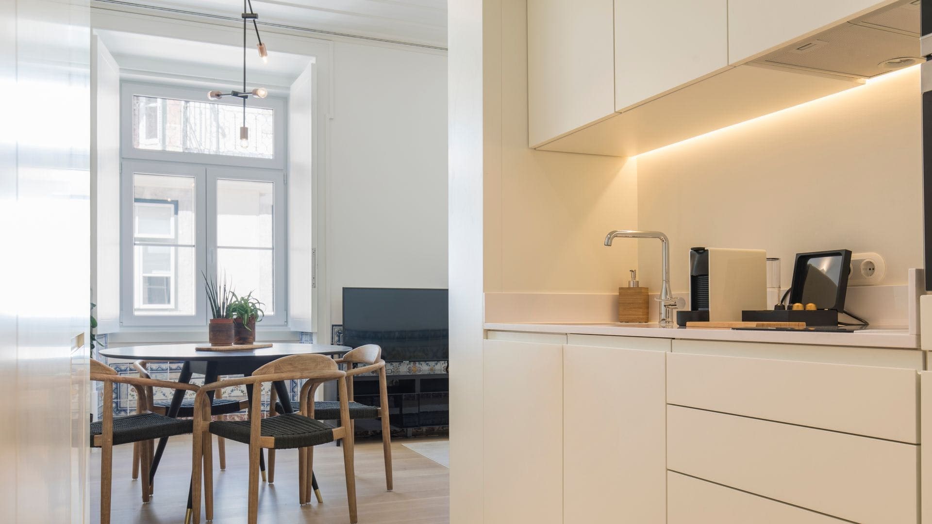Step into a world where classic Lisbon aesthetics meet contemporary comfort. The apartment features traditional azulejo tiles adorning the walls, filling each room with a sense of history and art. Natural light floods through the large windows, creating an inviting atmosphere in the living area. The soothing color palette of fawn and slate, complemented by boho-luxe faux fur throws, adds a unique touch to the décor. The kitchenette, equipped with a hob and microwave, provides all the essentials for preparing light meals during your stay.