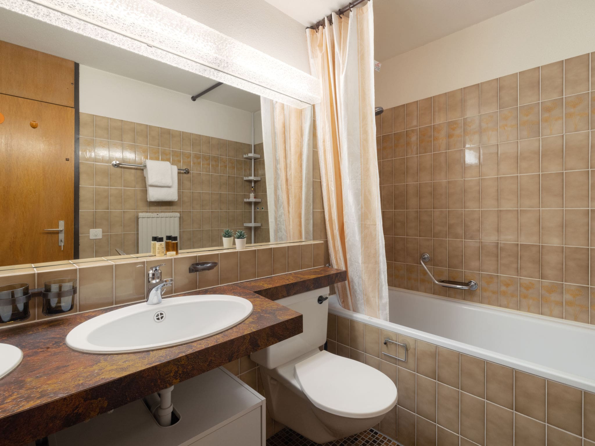The fully equipped open kitchen includes modern appliances such as a three-plate hob, oven, dishwasher, and Nespresso coffee machine, perfect for preparing everything from quick breakfasts to leisurely meals. The bathroom offers both bath and shower facilities with double hand-basins, while the south-facing balcony provides outdoor space to enjoy the mountain atmosphere and views.