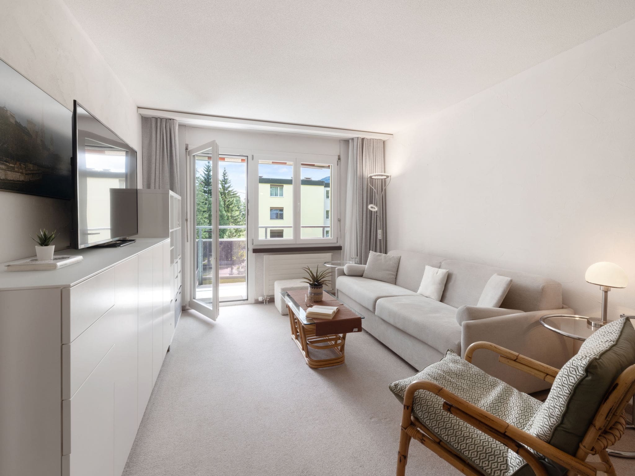 The property benefits from shared park grounds within the Allod-Park complex, offering green space in the heart of Davos. The south-facing balcony captures excellent natural light throughout the day, creating an ideal spot for morning coffee or afternoon relaxation. The apartment’s position at 1,560 meters above sea level ensures crisp mountain air and stunning alpine surroundings.