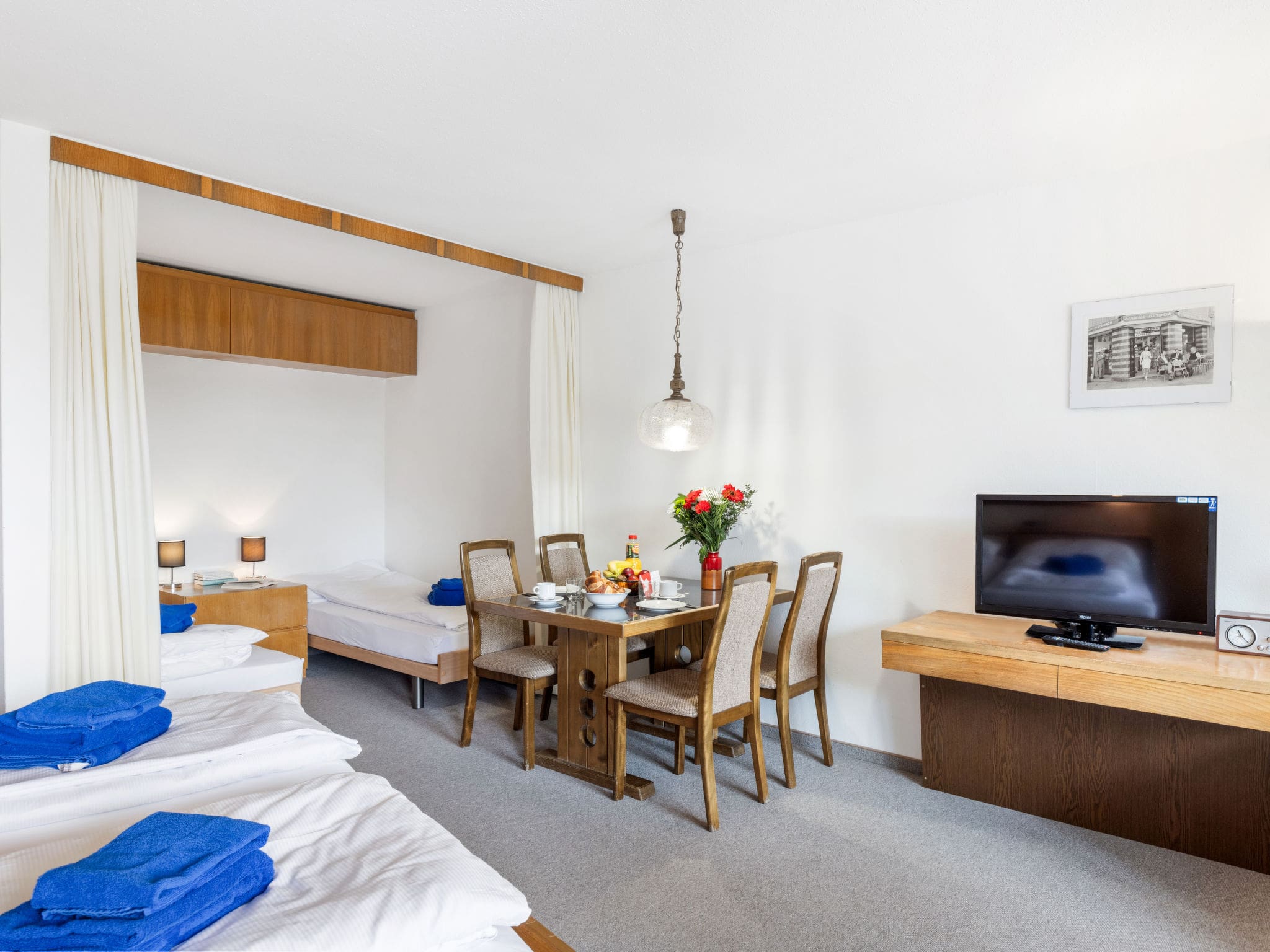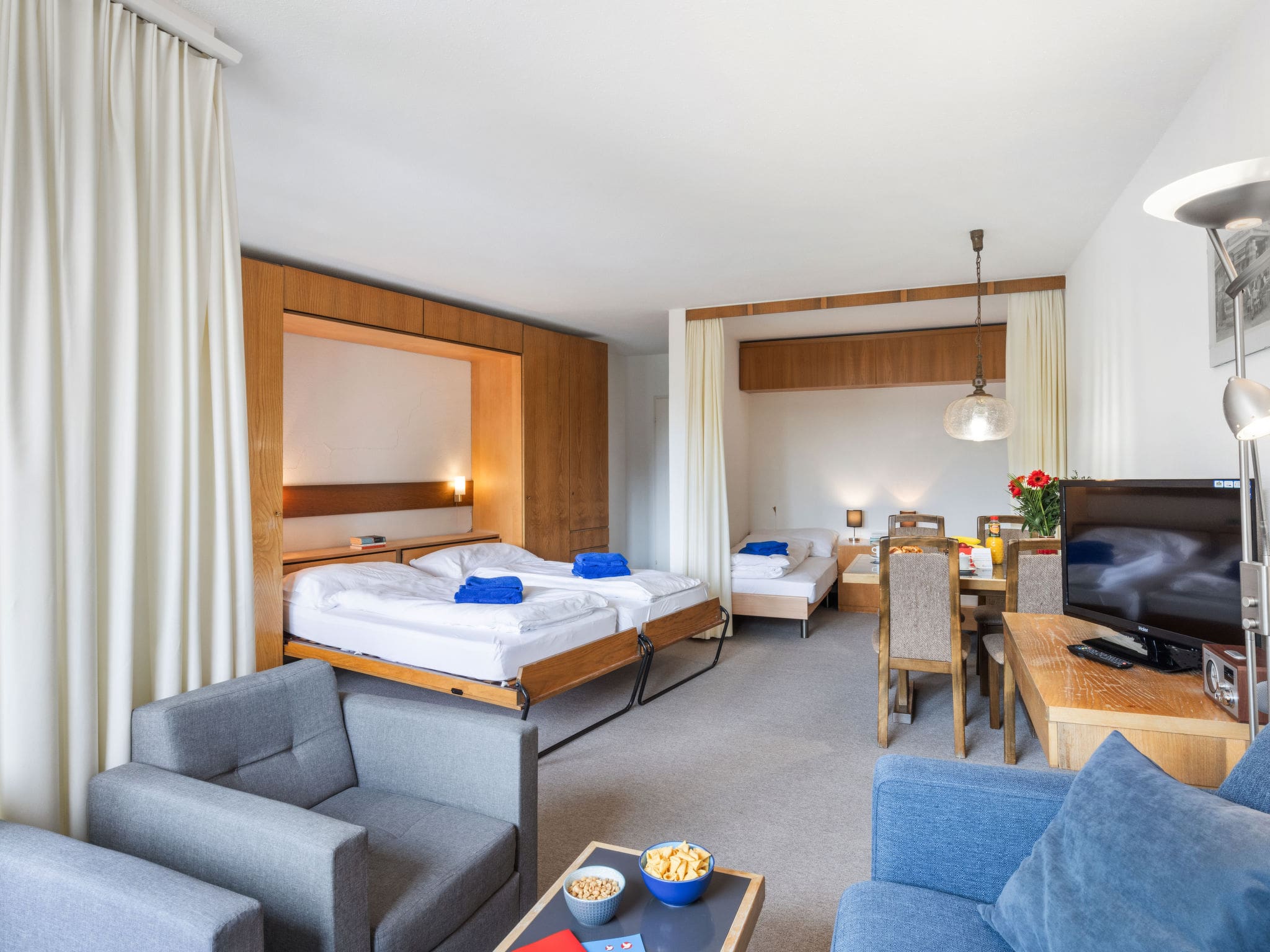 The 53-square-metre apartment showcases contemporary alpine design with recent 2023 renovations that blend modern convenience with cosy mountain charm. The open-plan living and dining area serves as the heart of the space, featuring comfortable furnishings and a flat-screen television with cable channels. Floor-to-ceiling windows flood the interior with natural light while showcasing spectacular mountain panoramas that extend across the resort and surrounding countryside. The ingenious space planning includes two fold-away beds in the main living area and an intimate alcove with two additional beds, creating flexible sleeping arrangements perfect for families or small groups. The compact yet fully equipped kitchen features modern appliances including a ceramic glass hob, oven, dishwasher, and kettle, enabling guests to prepare everything from quick mountain breakfasts to hearty alpine dinners. A pristine shower room completes the accommodation, while complimentary Wi-Fi ensures connectivity throughout your stay.