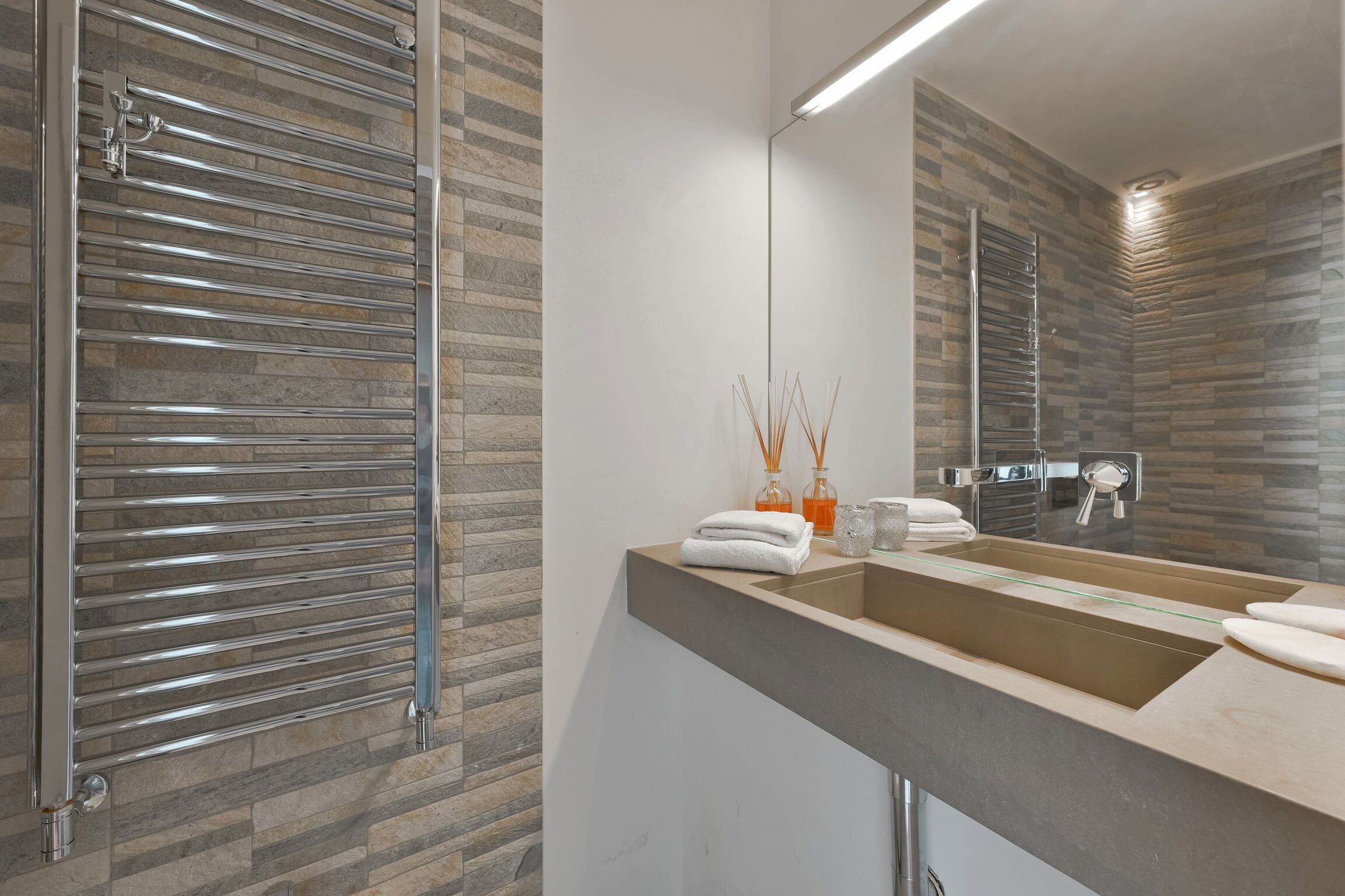 The apartment’s outdoor spaces are truly exceptional, featuring two terraces that offer panoramic views of the Florence skyline. The rooftop terrace is a standout, providing a perfect spot for morning coffee or evening aperitifs as you take in the 360-degree vistas. The first terrace, accessible from both living rooms, houses a discreet cupboard with a washing machine and dryer, adding to the convenience of your stay.