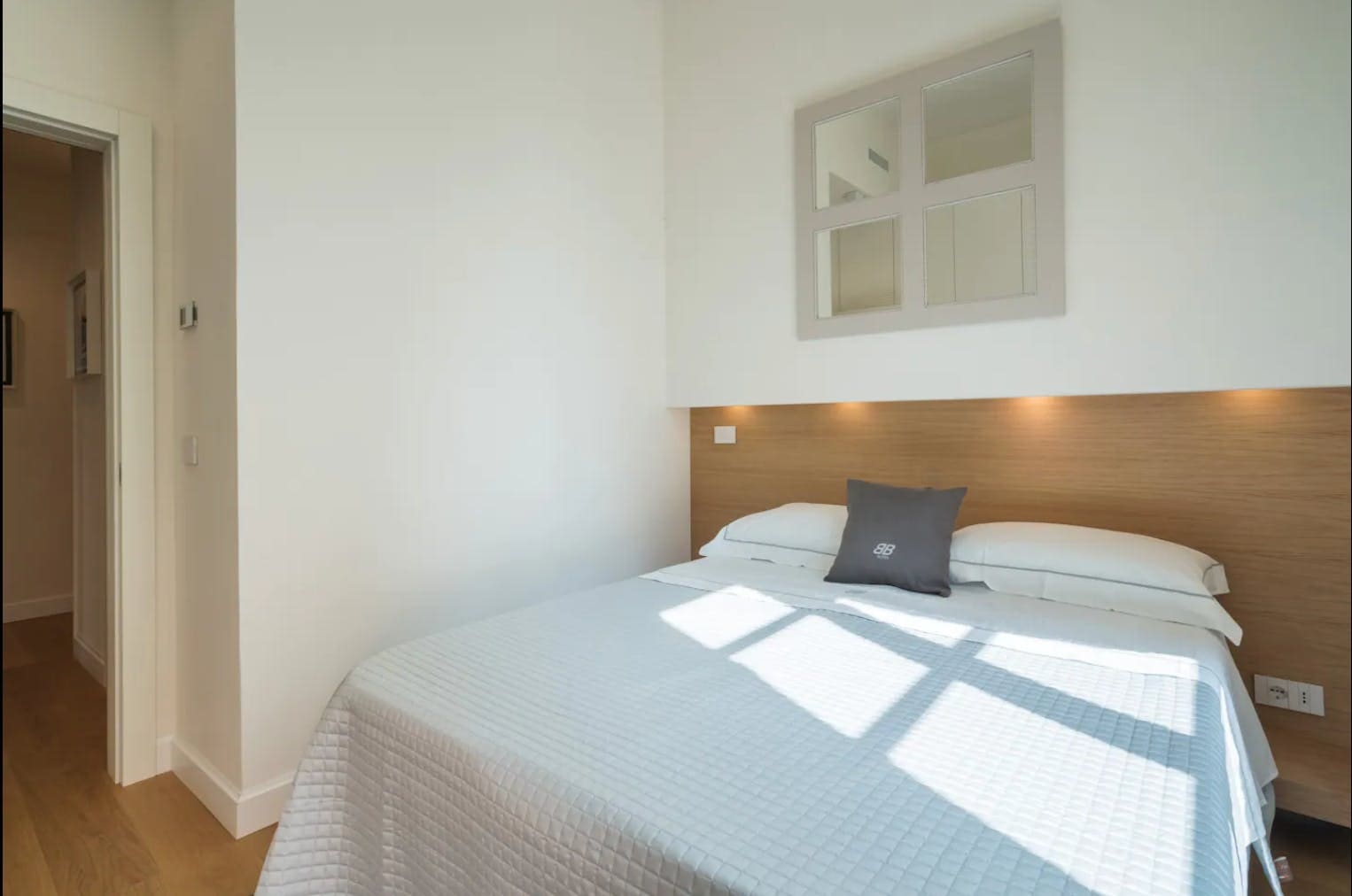 Upon entering, you are greeted by a seamless blend of contemporary design and historic charm. The open-plan living area features high, exposed wooden ceilings and large wood-framed windows that flood the space with natural light. The kitchen, equipped with modern appliances, combines Scandinavian functionality with Italian style. Both bedrooms offer flexibility in configuration, with the second bedroom convertible to either a double or twin setup, ensuring comfort for all guests.