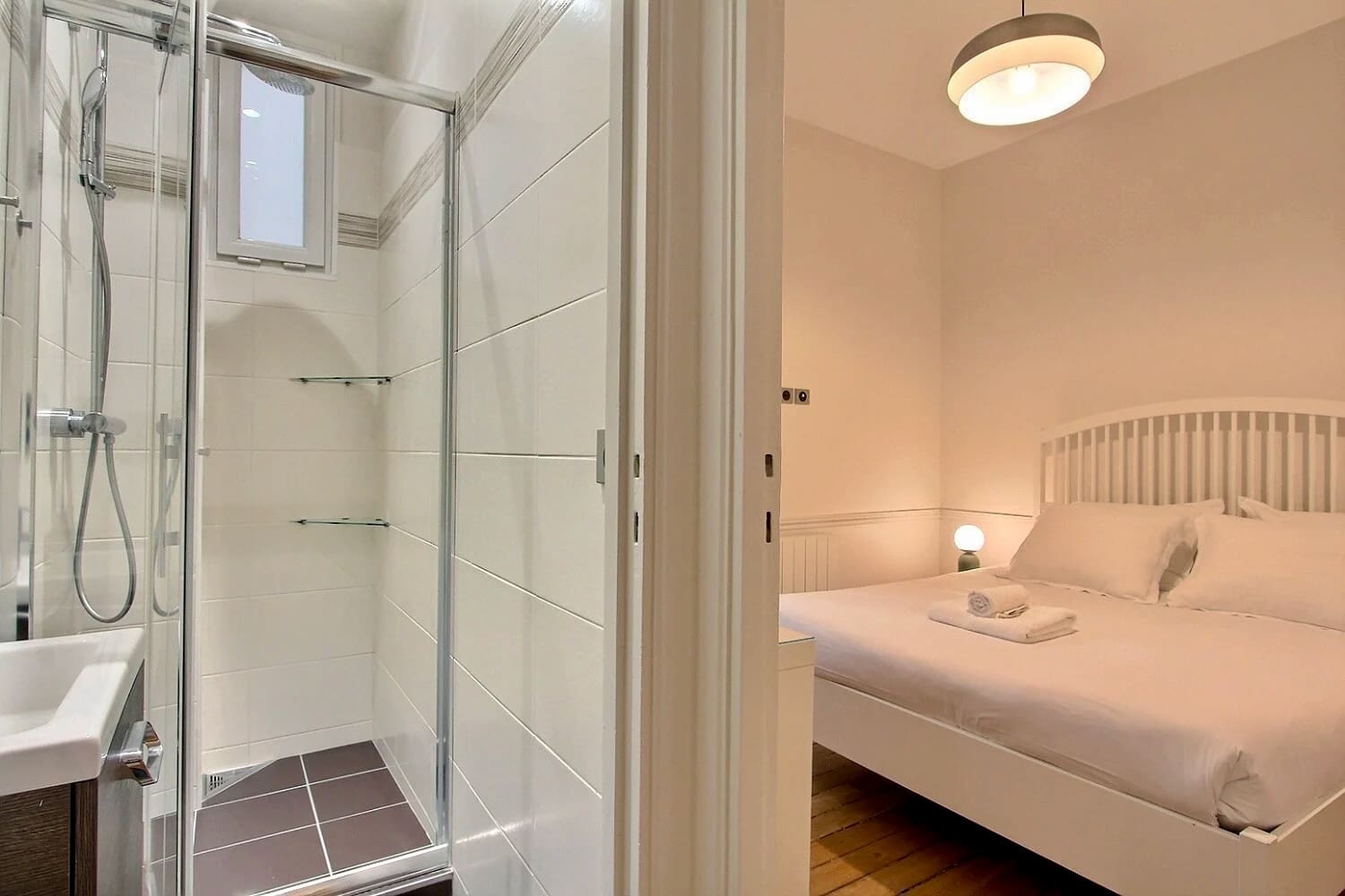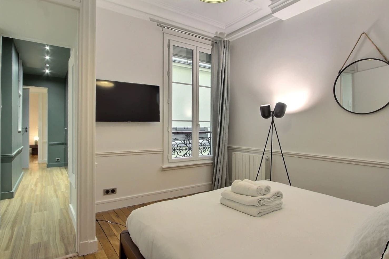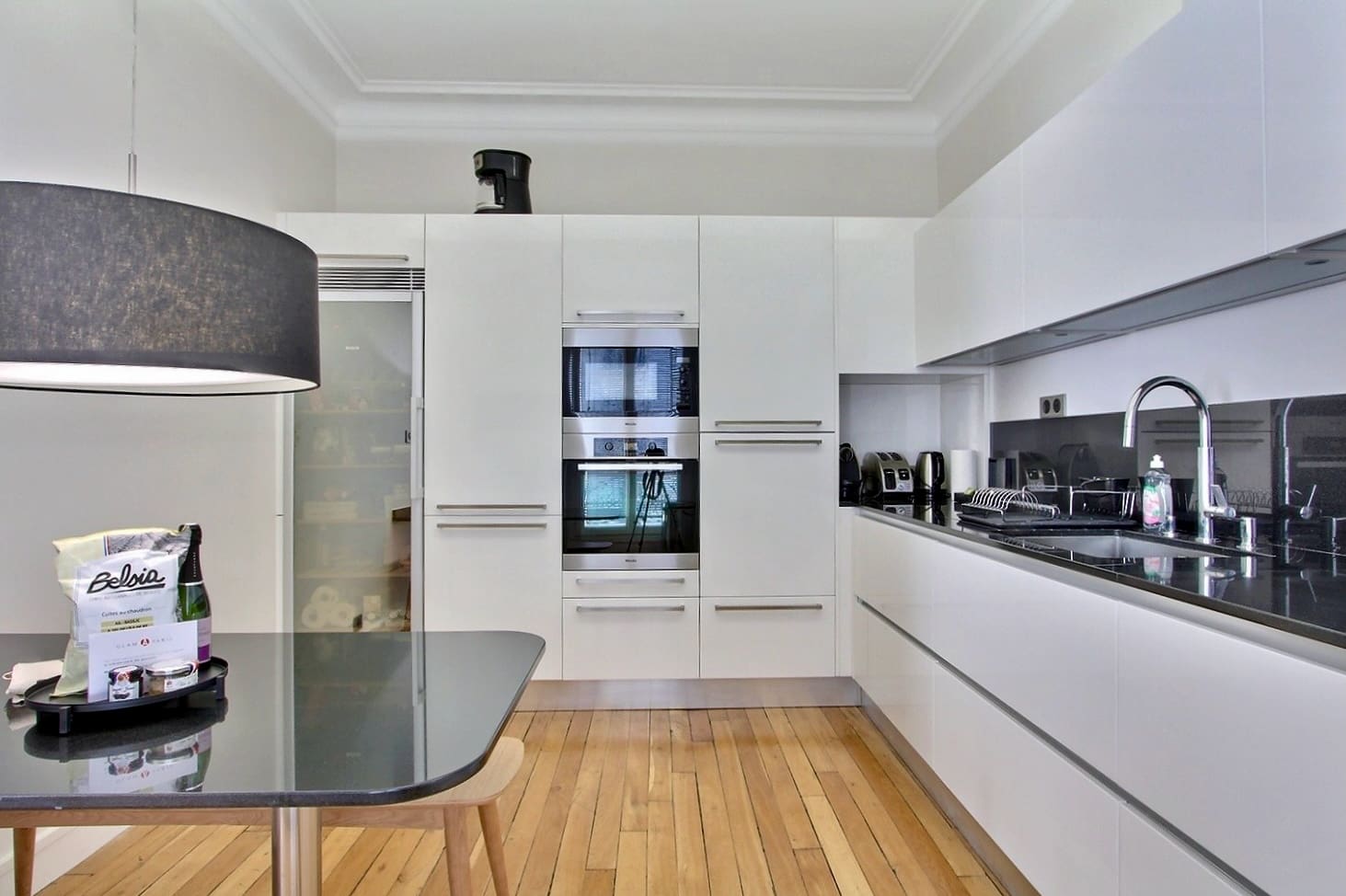 Step into a world of sophisticated design and comfort in this luxury apartment rental in Paris. The spacious living area features high ceilings and expansive windows, allowing natural light to fill the space and offering captivating street views. The fully equipped kitchen is perfect for preparing gourmet meals, while the three elegantly furnished bedrooms promise restful nights, each overlooking a serene courtyard. The apartment’s unique layout includes two bathrooms with modern fixtures, and a separate toilet, a common feature in France.