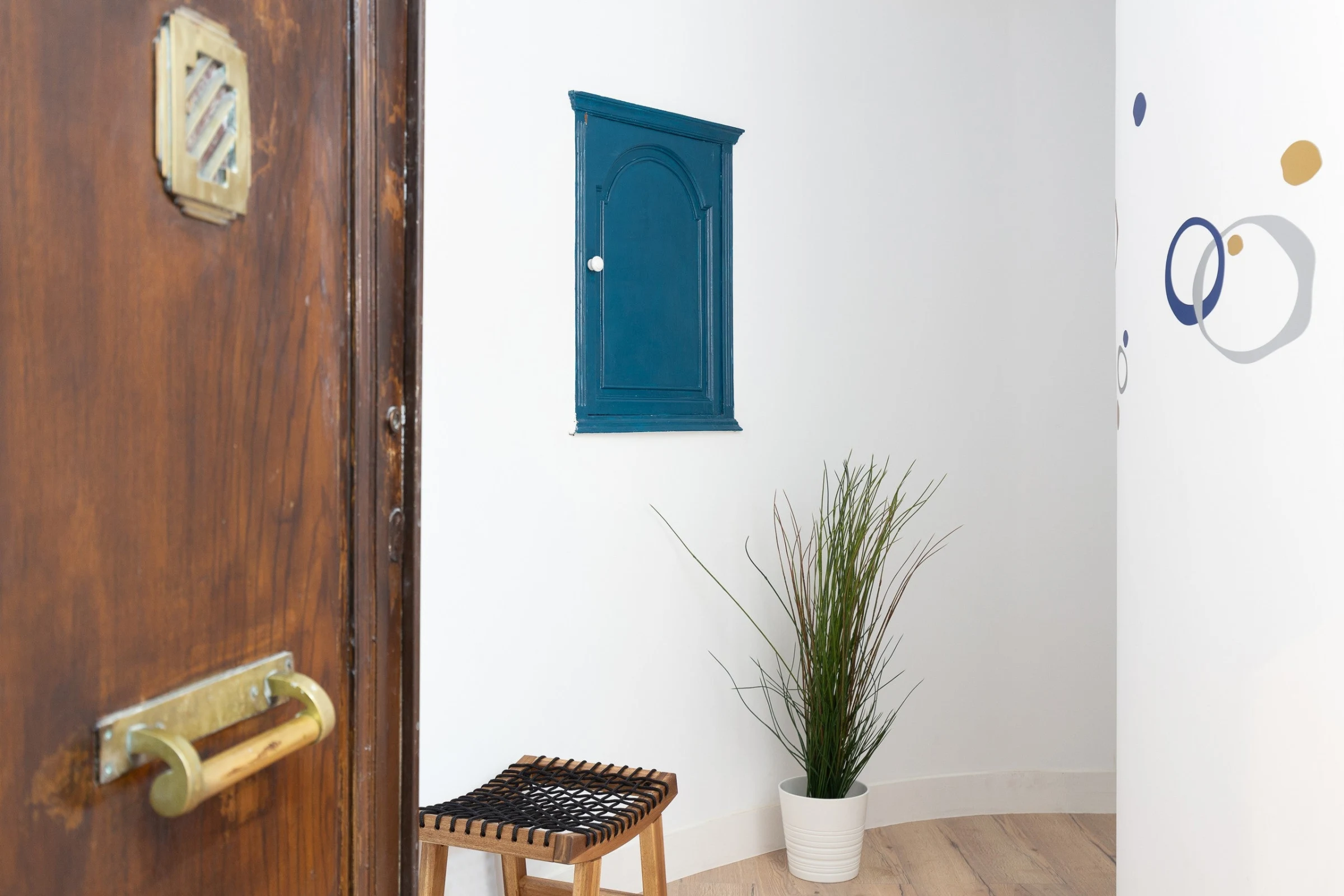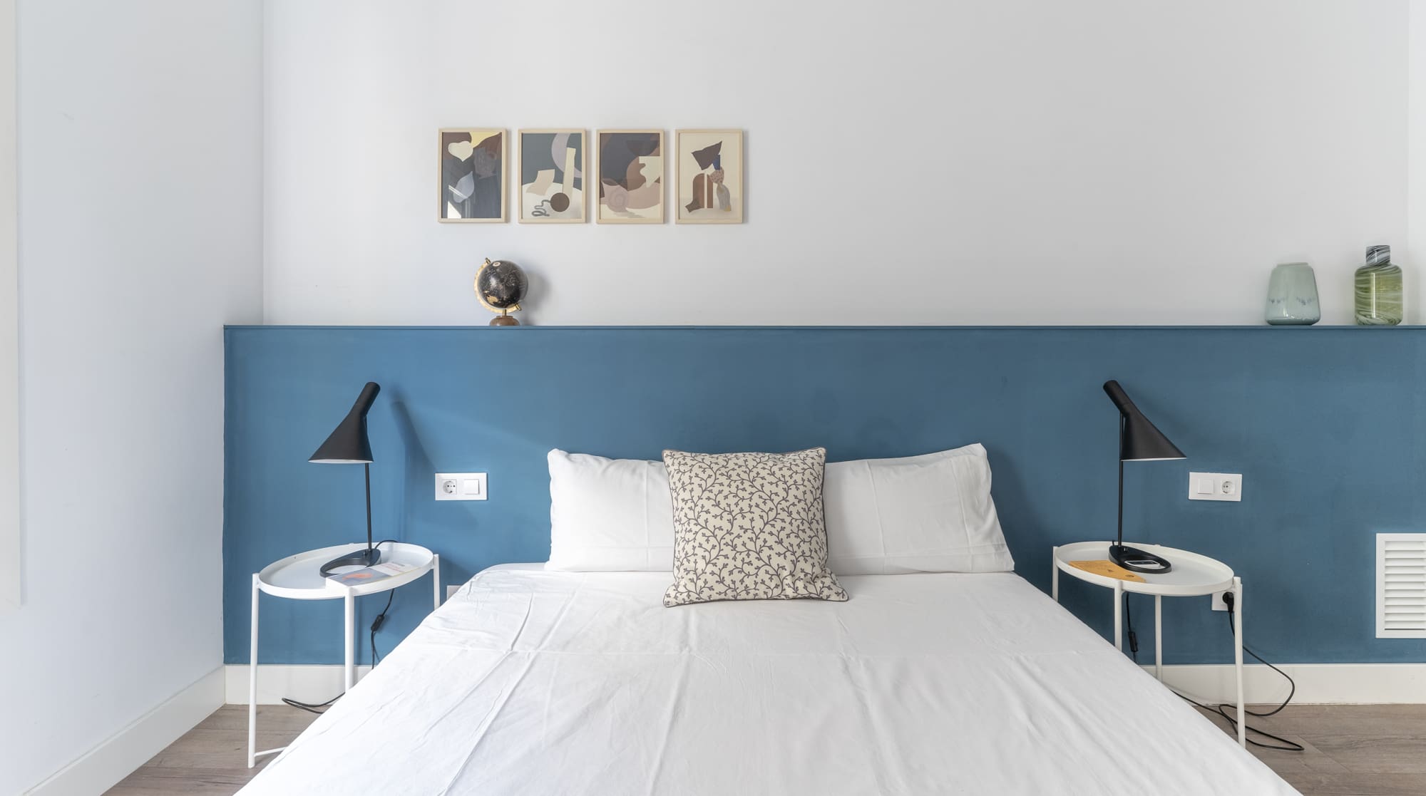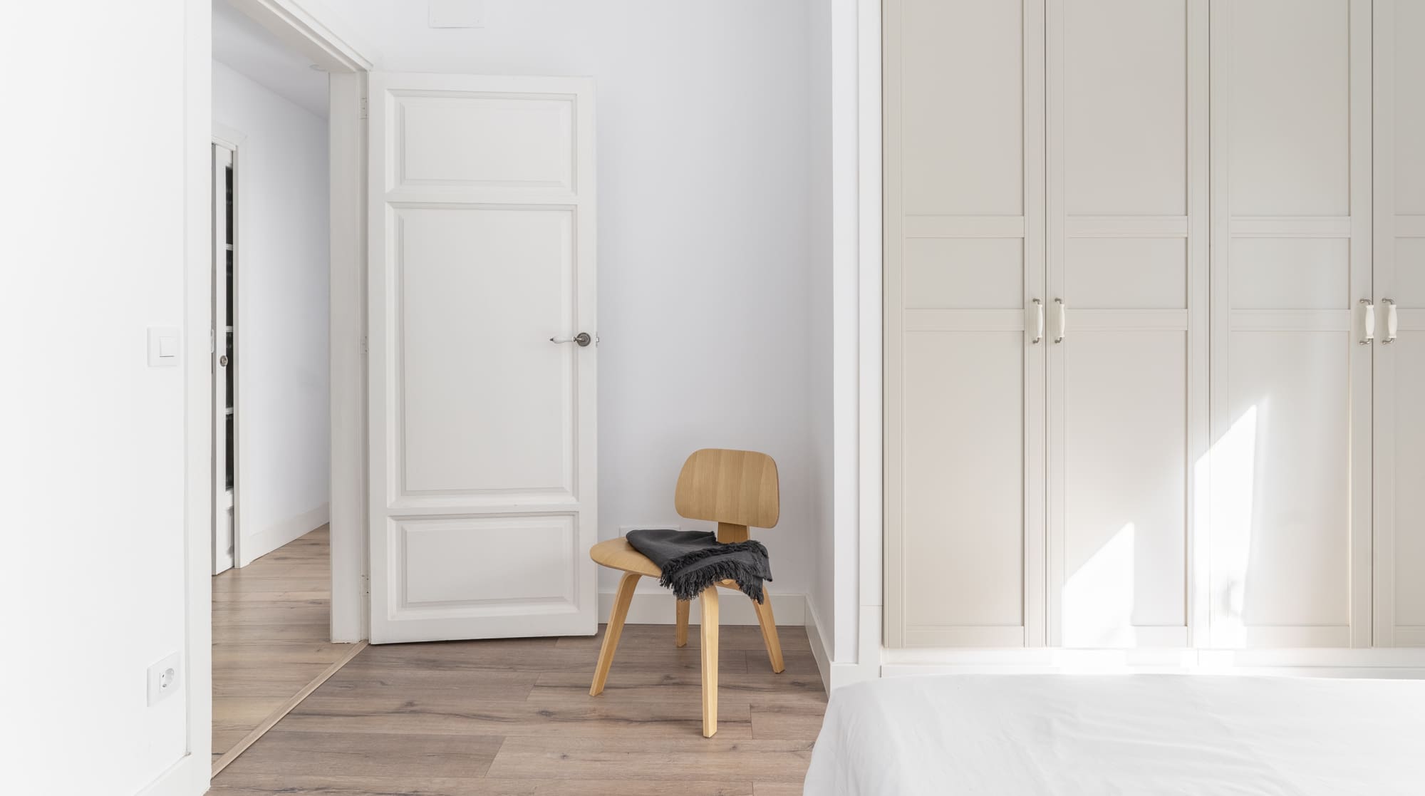 Step inside and be welcomed by a light-filled interior that combines minimalist design with mid-century elegance. The apartment features lofty ceilings and classic parquet wooden flooring, creating an inviting atmosphere. The bespoke wooden kitchen is a chef’s delight, perfect for preparing a morning breakfast with a fresh cup of coffee. With a spacious dining area, you can gather around the table to plan your Barcelona adventures. The main bedroom includes a dedicated workspace, ideal for those looking to work remotely.