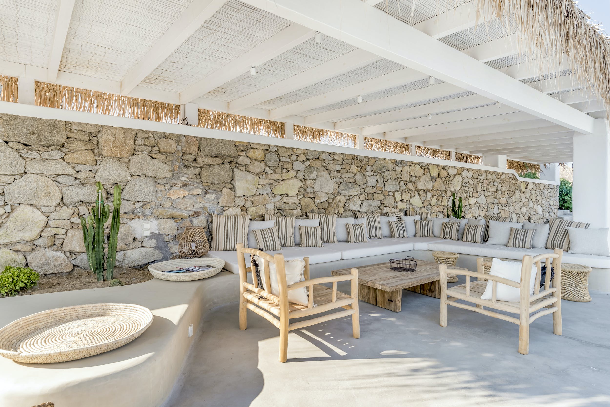 Step inside this exquisite Mykonos villa, where elegance and comfort meet. The villa features eight spacious bedrooms, each with an en-suite bathroom, offering privacy and luxury for up to 16 guests. The open-plan living area on the ground floor is designed for social gatherings, while boho-chic décor elements like cacti and raw wood accents create a laid-back yet sophisticated atmosphere. The fully equipped kitchen makes it easy to prepare meals, whether you’re dining indoors or al fresco.