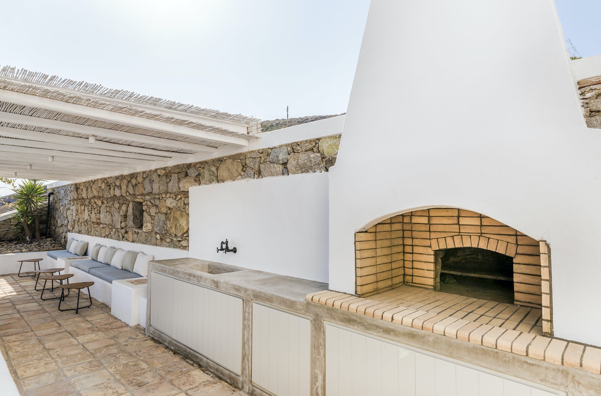 The villa’s outdoor areas are nothing short of spectacular. A lagoon-like swimming pool beckons you to take a refreshing dip, while the expansive terrace offers various seating areas under macrame parasols and a bamboo pergola. Enjoy outdoor dining with the Aegean as your backdrop, or retreat to the rooftop terrace for a private taverna experience with panoramic sunset views.