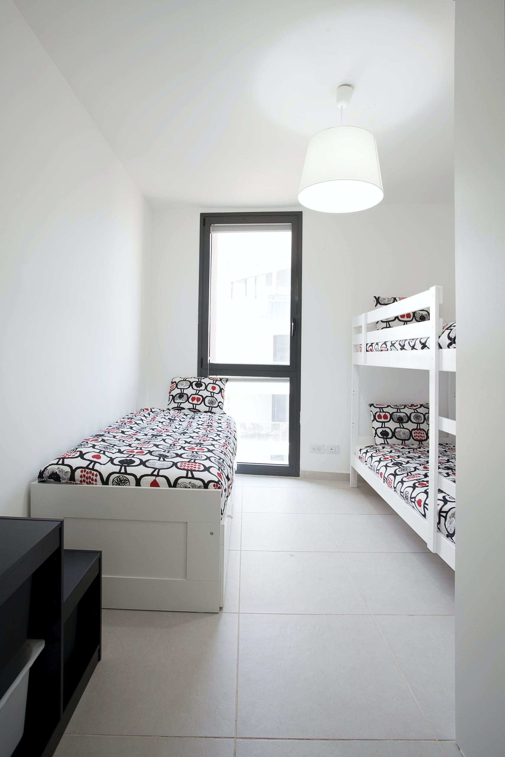 Accommodating up to five guests, this apartment features two bedrooms and two bathrooms. The dining table doubles as a workspace, and while there isn’t enough indoor seating for all guests, the outdoor area accommodates four. Pets and children are welcome. Explore our luxury villa rentals in Israel for more properties.