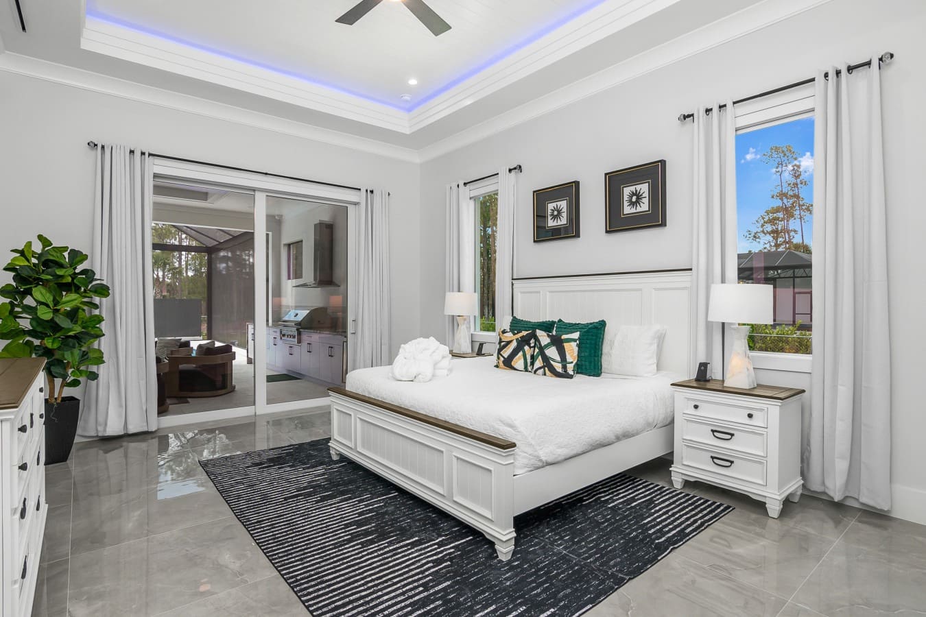 The villa’s interior is a testament to elegance and comfort, making it a prime choice for anyone looking for a luxury villa rental in Collier County. The expansive living areas, adorned with chic furnishings, provide a perfect setting for relaxation and entertainment. The villa features four spacious bedrooms, each with an ensuite bathroom, ensuring privacy and convenience. A state-of-the-art kitchen, equipped with modern appliances, caters to all your culinary needs. For those mixing business with leisure, a dedicated office space is available, making it ideal for remote working.