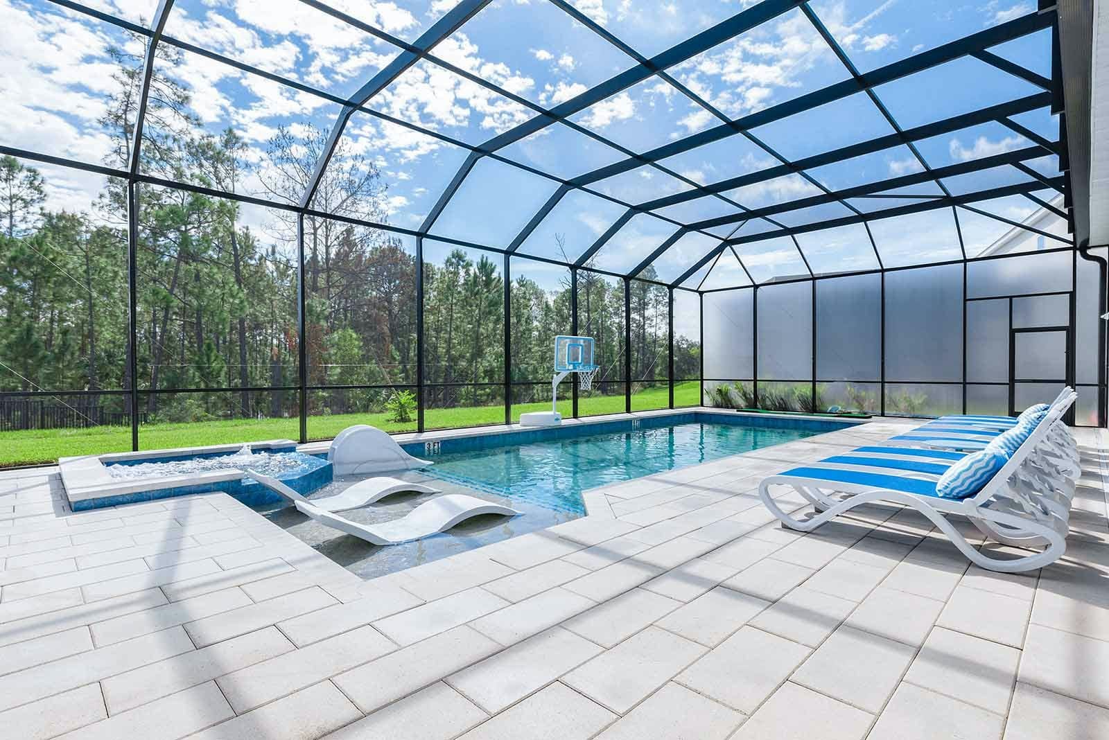 The villa’s outdoor area is a haven for leisure and recreation. Dive into the sparkling swimming pool or unwind in the hot tub as you soak up the Florida sun. The expansive terrace features comfortable seating and an outdoor dining area, ideal for enjoying al fresco meals. The villa’s lush surroundings create a peaceful ambiance, perfect for unwinding after a day of adventure.