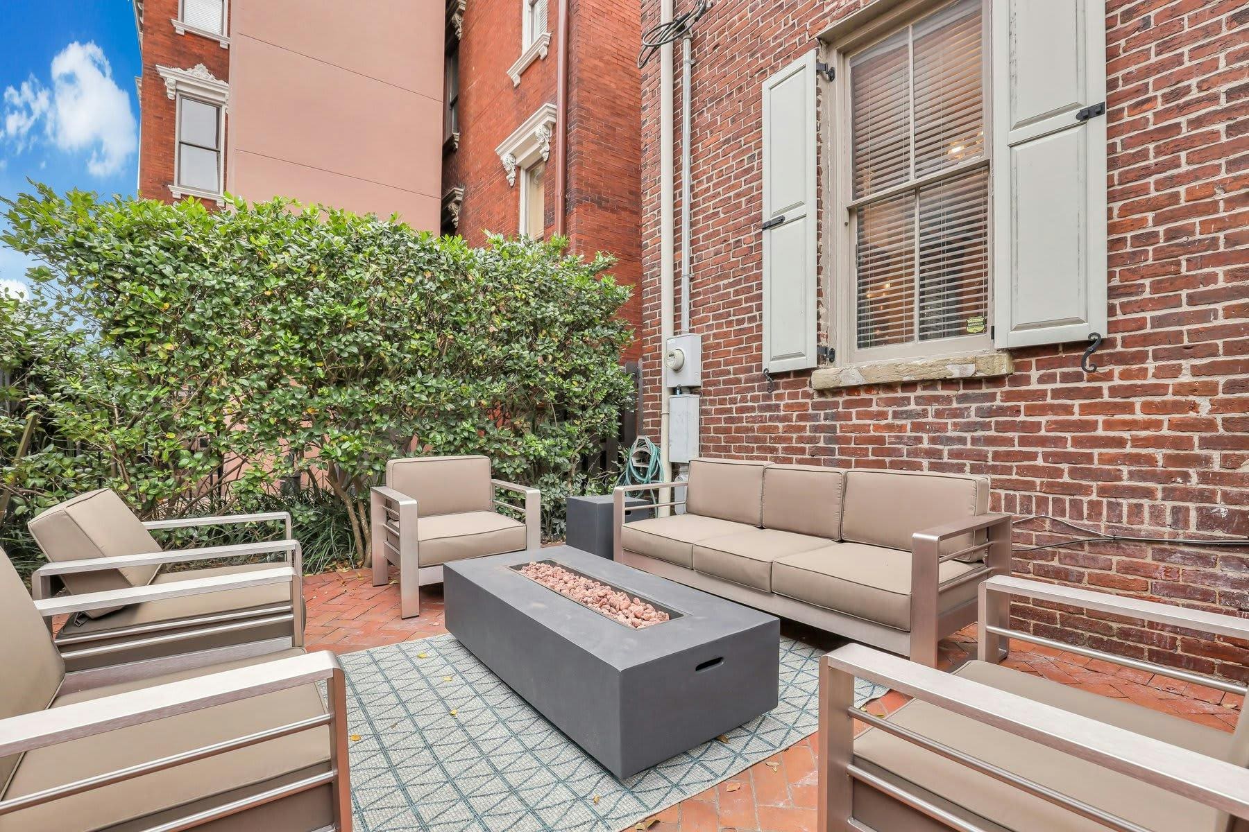 The property includes private front and back entrances, leading to a garden area that, while slightly overlooked, provides a charming spot for evening gatherings. Though there is no pool, the garden’s fire pit offers a cozy setting for memorable nights under the stars.