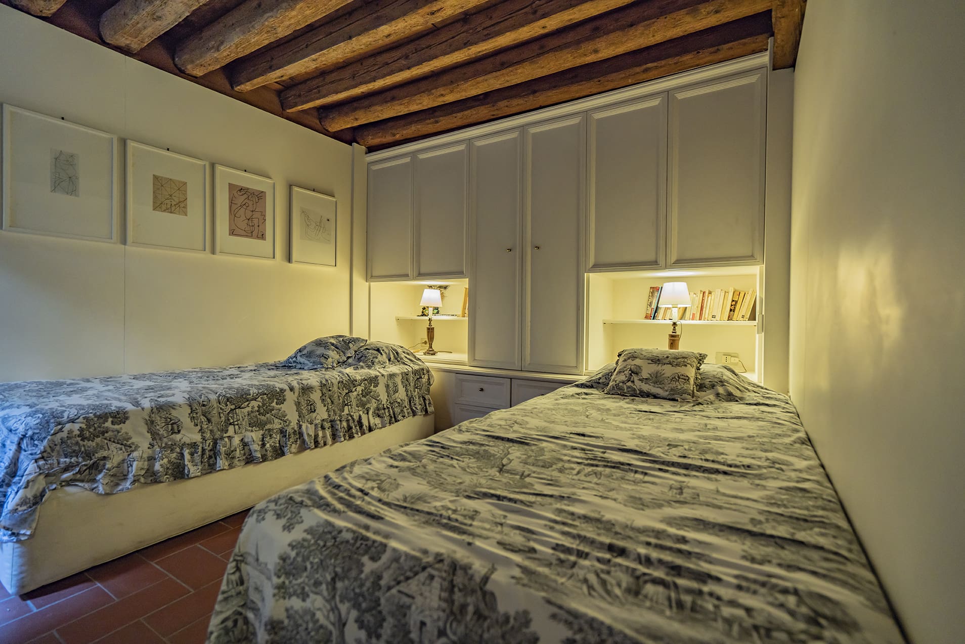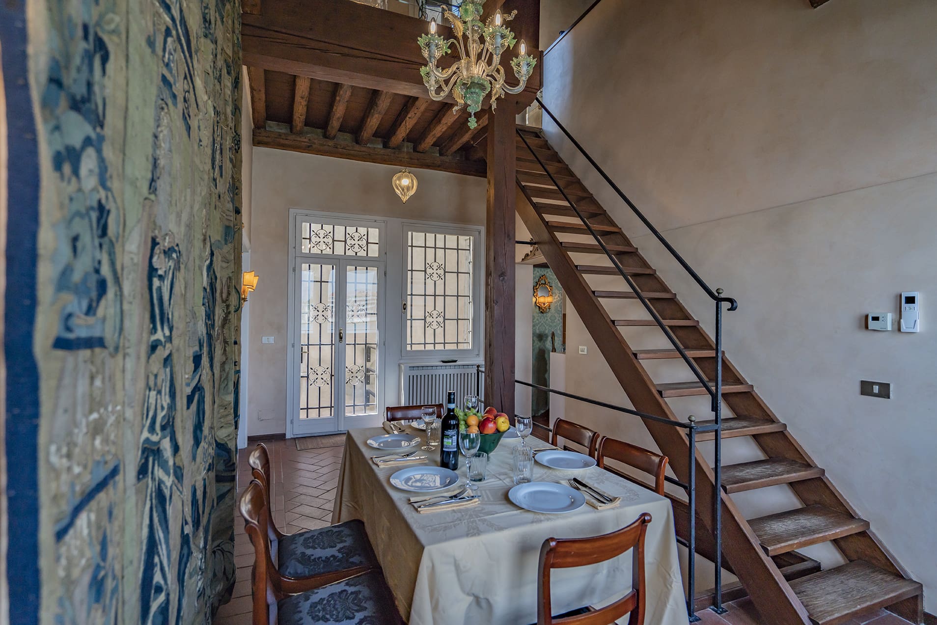 Step into a world of opulent refinement where Venetian artistry meets modern comfort. The apartment’s interior is adorned with stunning features, including an exquisite Murano glass chandelier in the salon and a captivating tapestry that sets the tone for sophisticated dining experiences. Each of the three bedrooms is a testament to luxury, with one room particularly suited for children, ensuring a perfect family retreat. The main bedroom features a captivating ceiling fresco, while Renaissance-style murals grace the walls, evoking the grandeur of a bygone era. With fast Wi-Fi and a desk offering inspiring views, it’s also ideal for remote working.