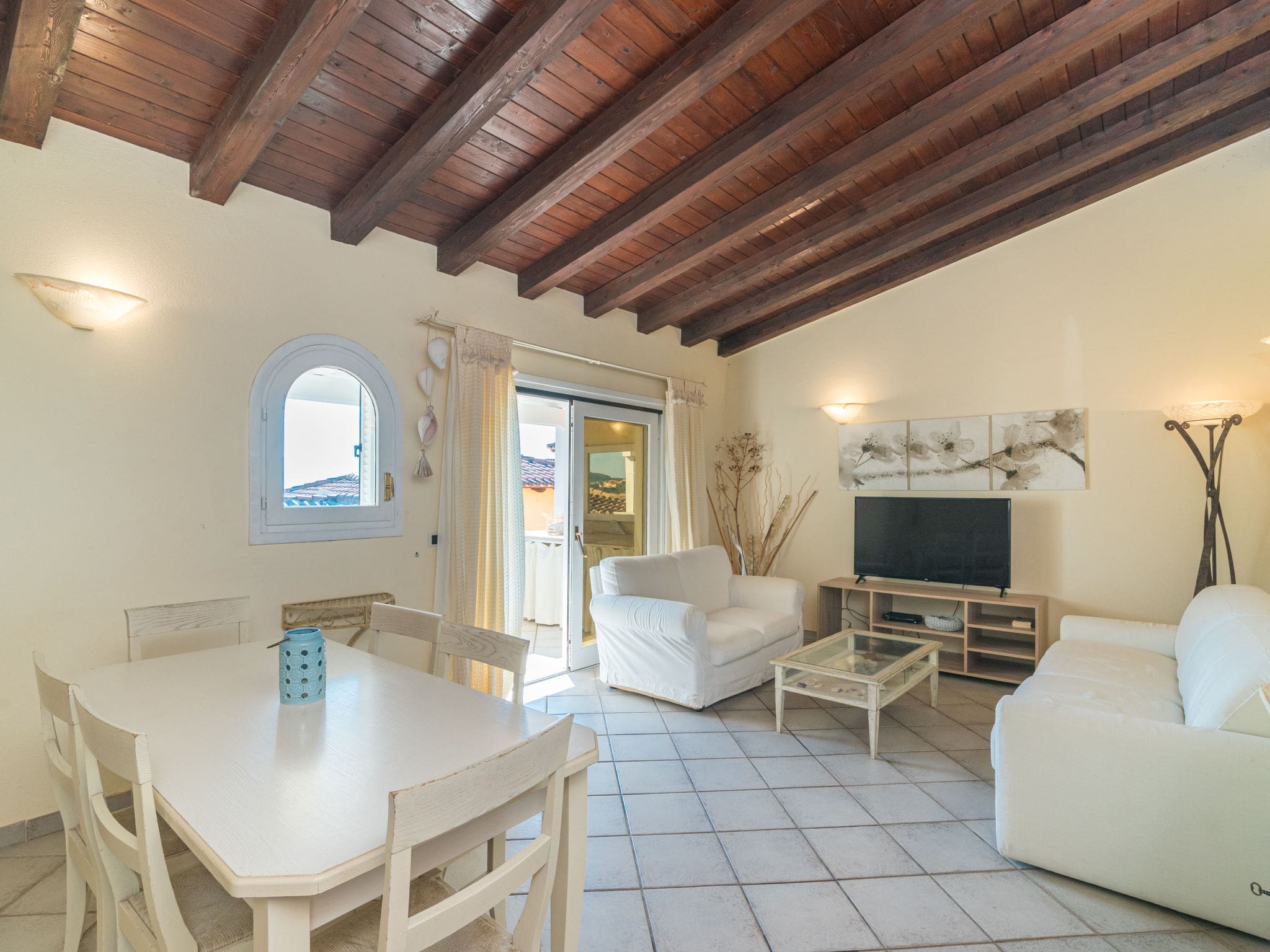 The heart of outdoor relaxation centers around the magnificent roofed terrace, complete with comfortable furniture and unobstructed views across the Mediterranean Sea. The elevated position within the resort provides a sense of privacy while maintaining easy access to the shared swimming pool below. The complex features beautifully maintained gardens and direct beach access via a scenic pathway, allowing guests to transition effortlessly between poolside lounging and seaside adventures. An outdoor shower provides convenient refreshment after swimming, while covered parking ensures vehicles remain protected from the Sardinian sun.