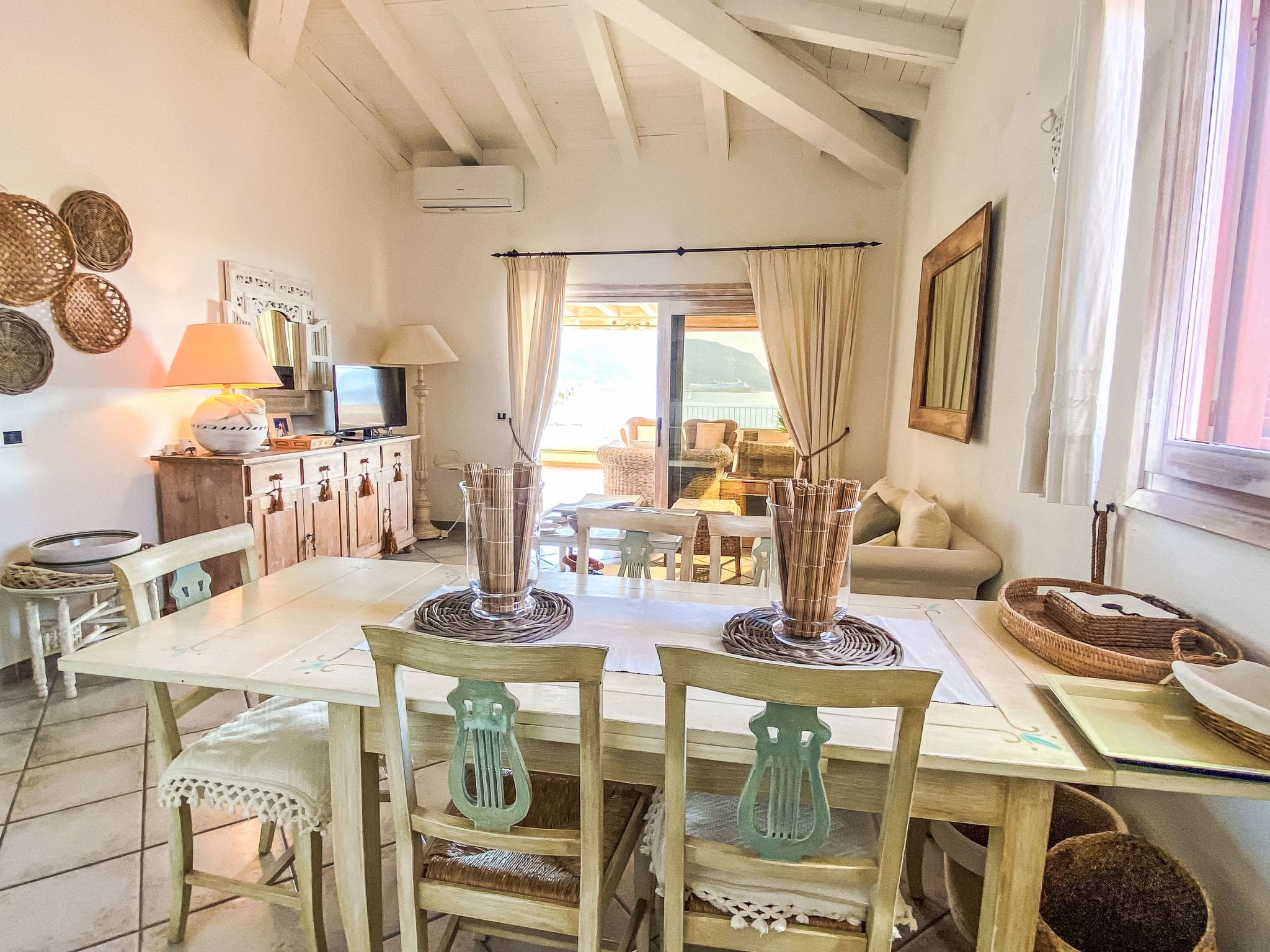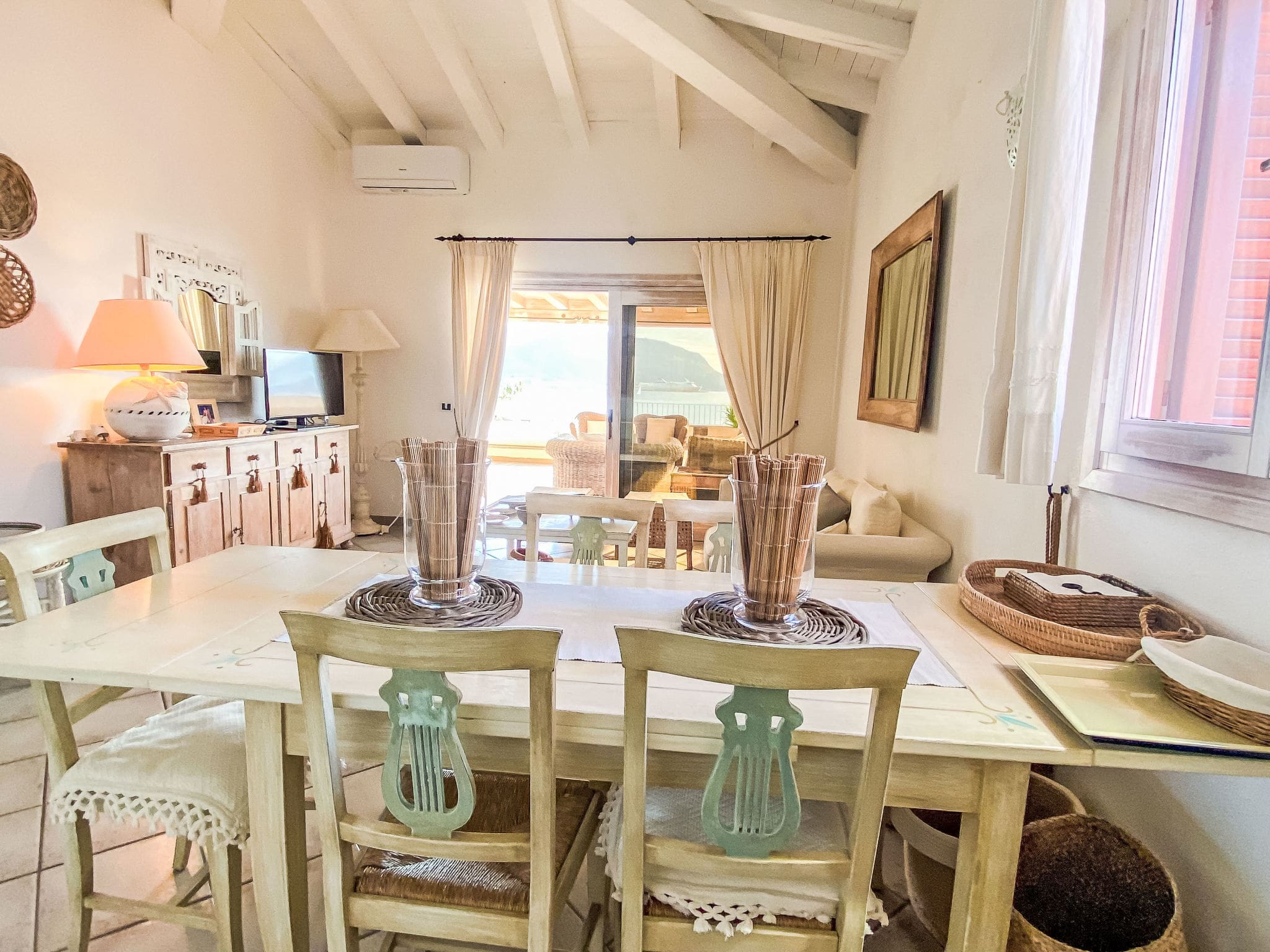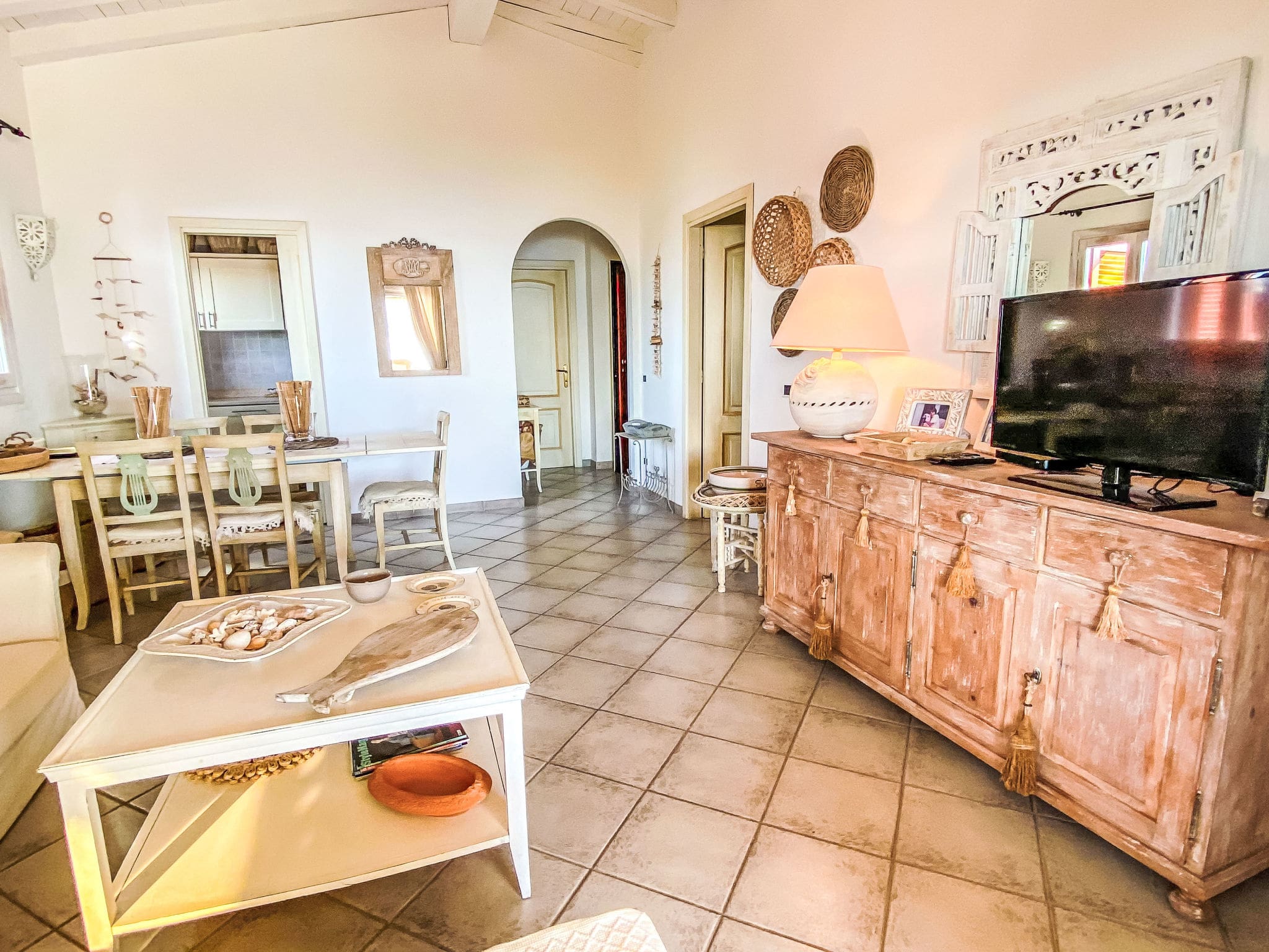 The bright and tastefully furnished 85-square-metre apartment spans the first floor, featuring an open-plan living and dining area with comfortable seating including a sofa bed, satellite television, and air conditioning for year-round comfort. The space flows seamlessly onto a spectacular 120-square-metre terrace that captures magnificent views across the sea to the iconic island of Tavolara. The master bedroom opens directly onto this expansive terrace, while a second room features comfortable bunk bed accommodation. The open kitchen comes fully equipped with modern appliances including a four-ring gas hob, oven, and dishwasher, perfect for preparing meals using fresh local ingredients. Two well-appointed shower rooms with WC ensure convenience for all guests, while thoughtful touches like a washing machine, iron, and hair dryer add to the apartment’s appeal.