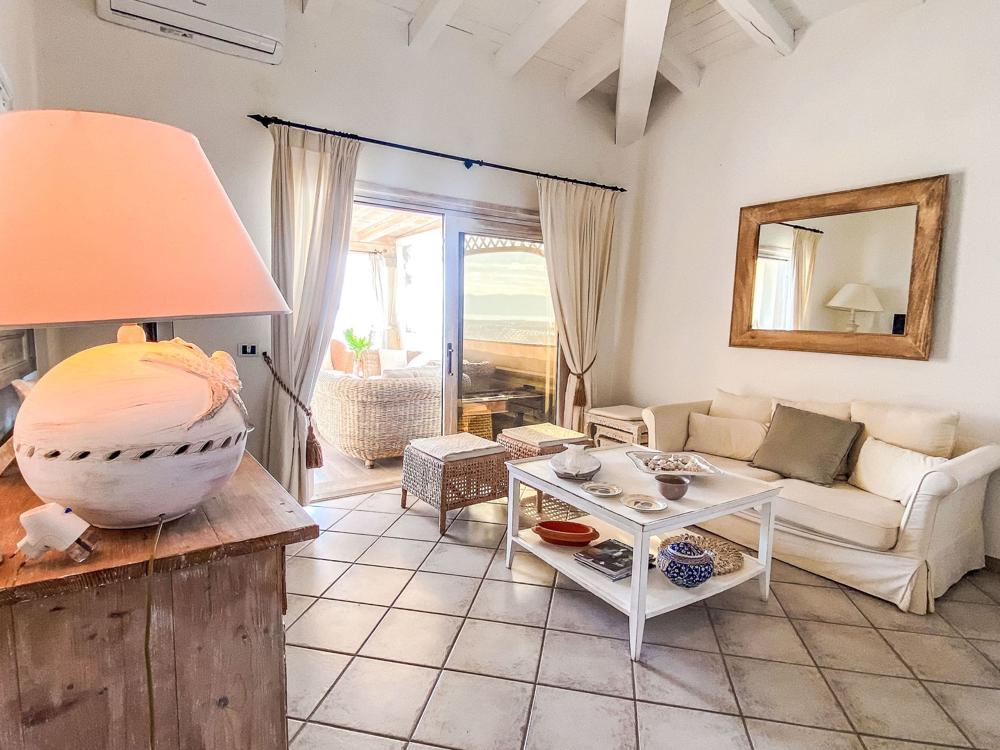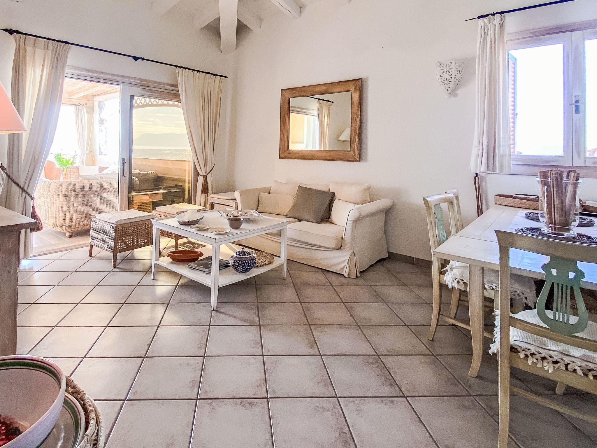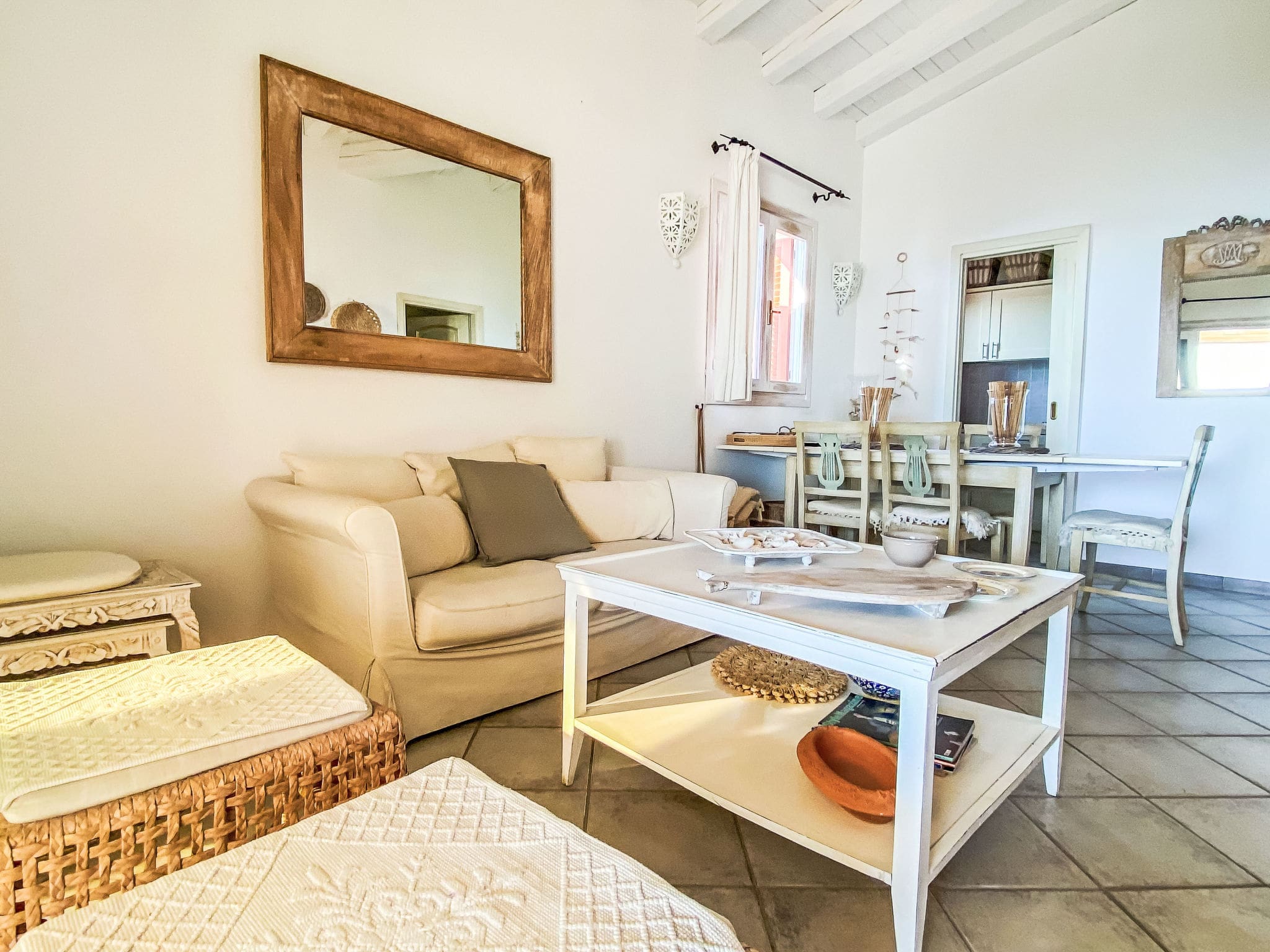 The bright and tastefully furnished 85-square-metre apartment spans the first floor, featuring an open-plan living and dining area with comfortable seating including a sofa bed, satellite television, and air conditioning for year-round comfort. The space flows seamlessly onto a spectacular 120-square-metre terrace that captures magnificent views across the sea to the iconic island of Tavolara. The master bedroom opens directly onto this expansive terrace, while a second room features comfortable bunk bed accommodation. The open kitchen comes fully equipped with modern appliances including a four-ring gas hob, oven, and dishwasher, perfect for preparing meals using fresh local ingredients. Two well-appointed shower rooms with WC ensure convenience for all guests, while thoughtful touches like a washing machine, iron, and hair dryer add to the apartment’s appeal.