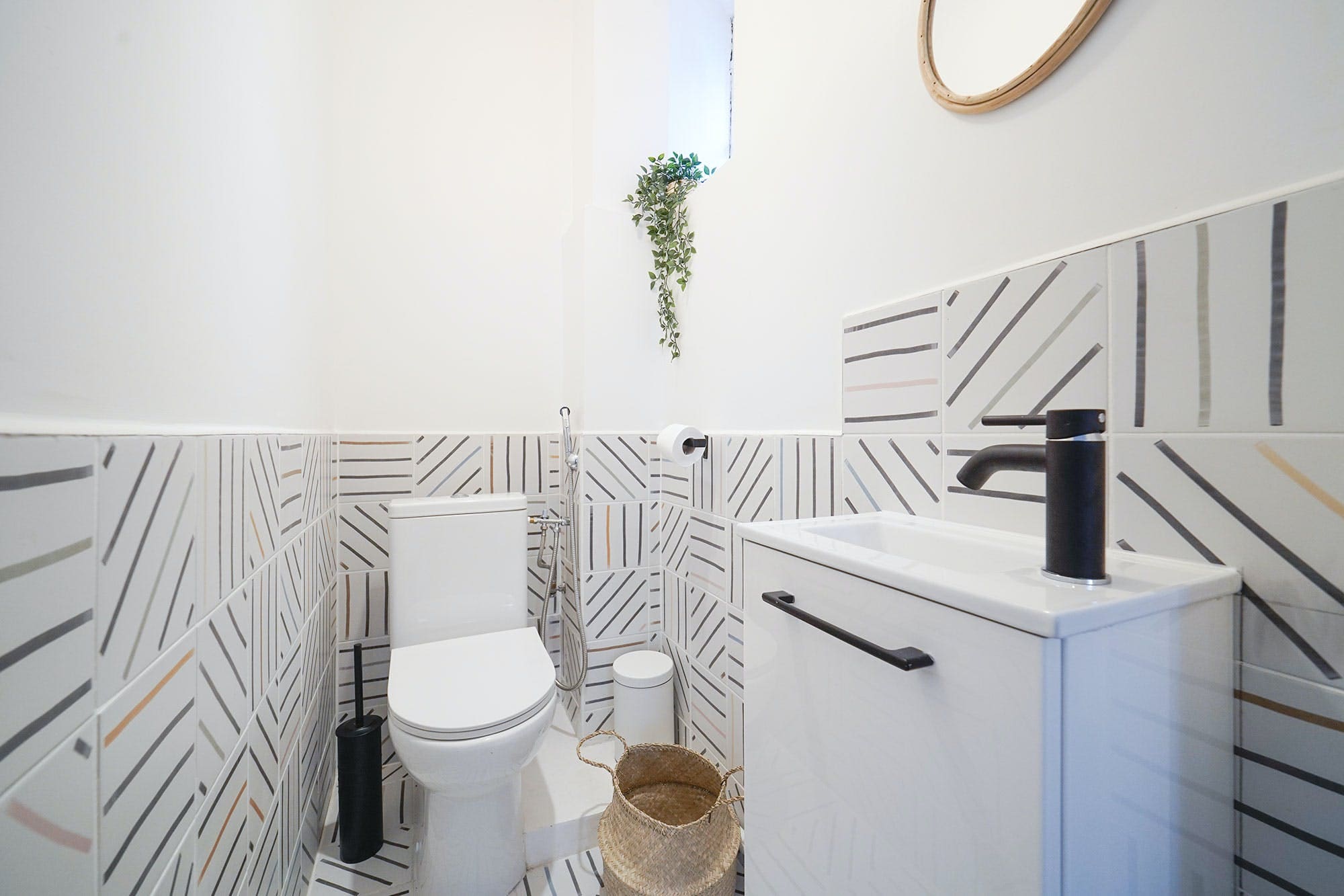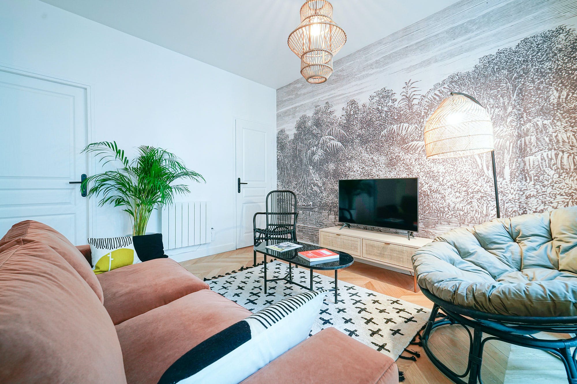 Step inside to discover an elegantly designed space that exudes sophistication. The interior boasts high ceilings, intricate moldings, and an array of sumptuous fabrics. The living area, adorned with a plush pink velvet sofa, serves as a cozy hub for relaxation. The kitchen is fully equipped with modern appliances, perfect for preparing gourmet meals. With two stylish bedrooms and two bathrooms, the apartment comfortably accommodates up to six guests. Note that one bedroom is separated by a semi-opaque screen, offering minimal privacy. At full capacity, two guests will enjoy the comfort of a sofa bed in the living area.