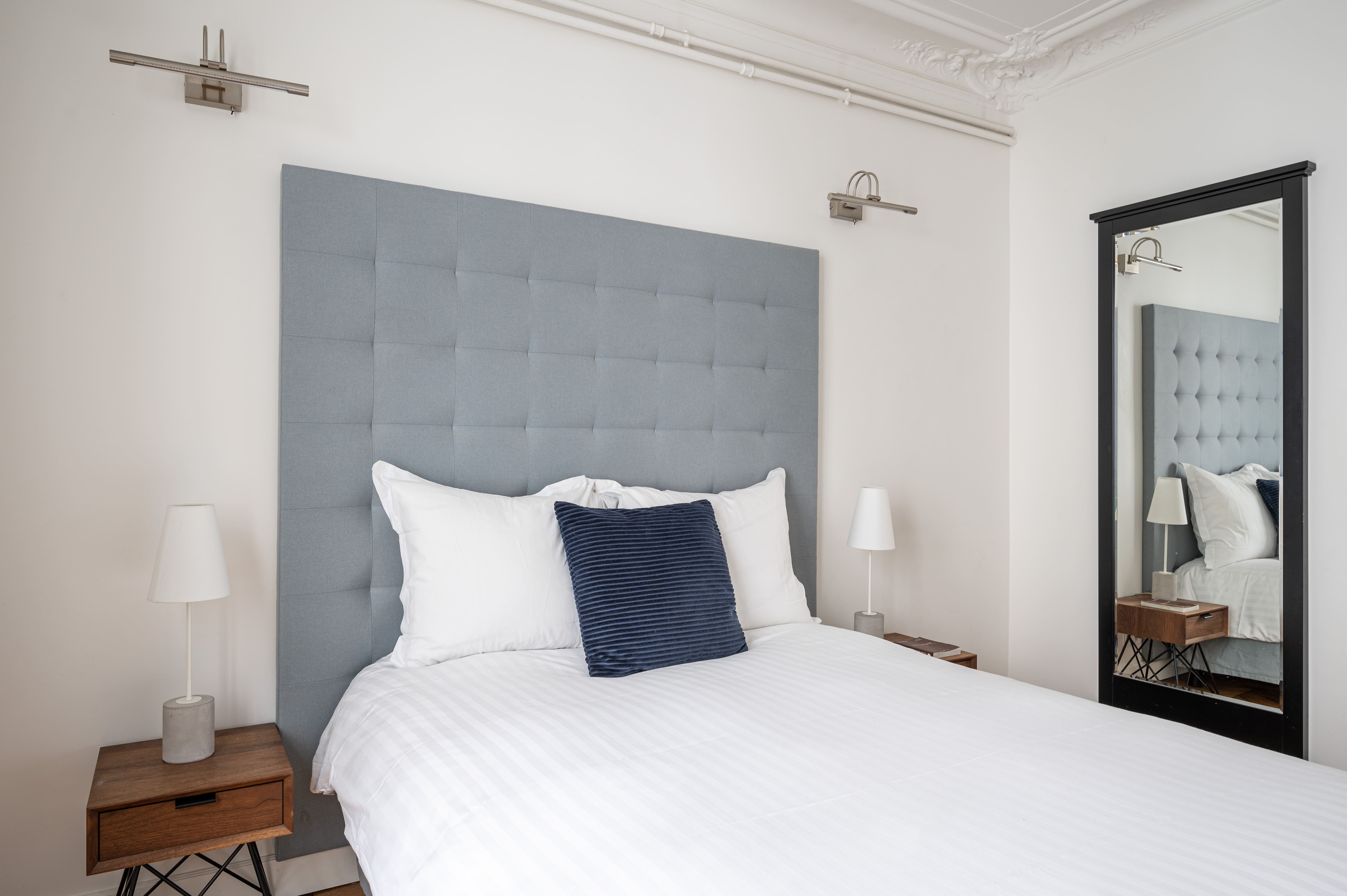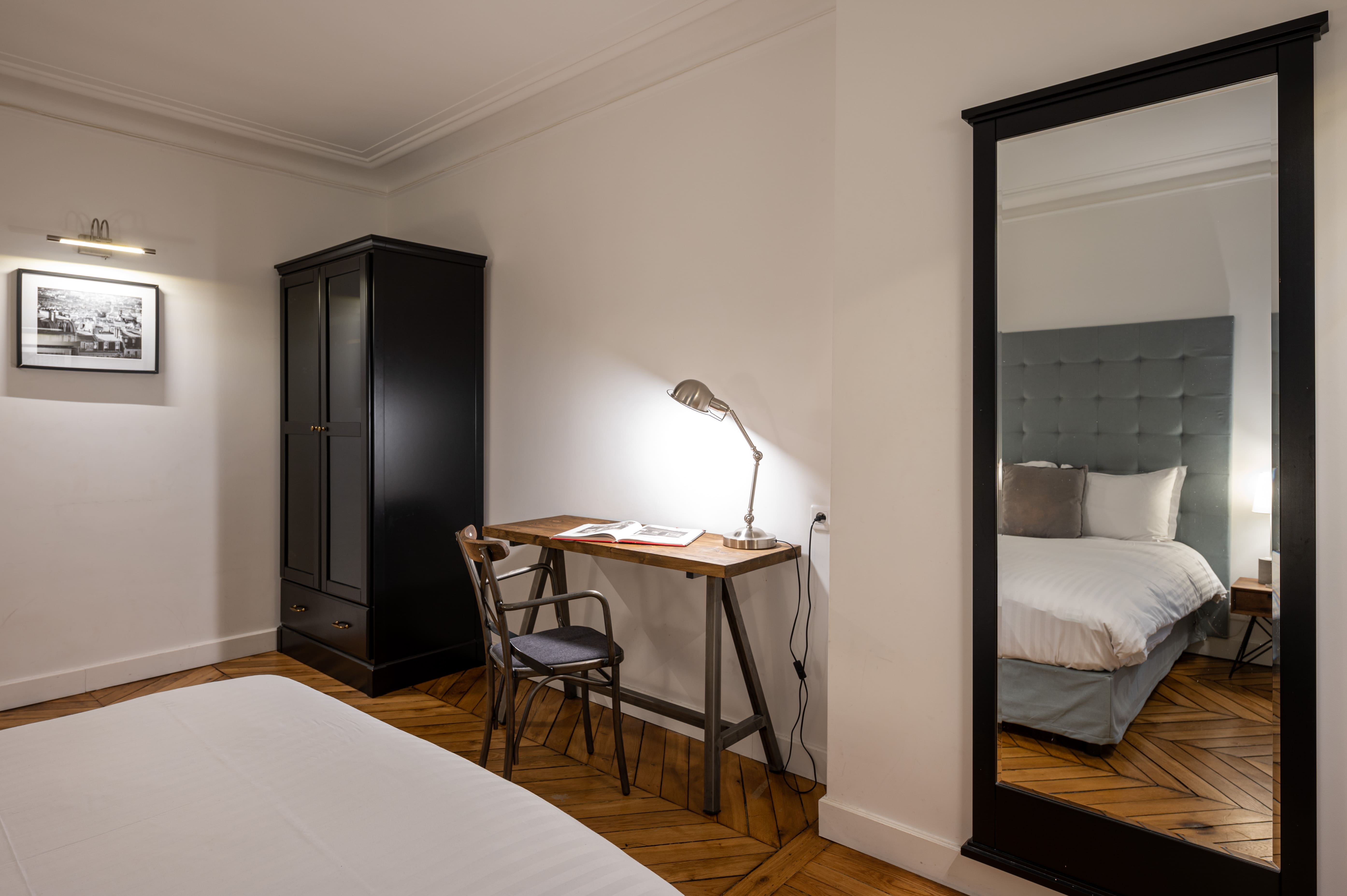 Step into a world of Parisian charm as you enter this spacious four-bedroom apartment. The interior boasts beautiful parquet flooring and wood-panelled walls, creating an ambiance of timeless elegance. The living area is adorned with charming black and white photographs, enhancing the quintessentially Parisian atmosphere. The kitchen is fully equipped for culinary adventures, and the long dining table is perfect for gathering with family and friends over a meal. Desks in some bedrooms provide a quiet space for remote work, and the living room’s sofa bed accommodates extra guests.