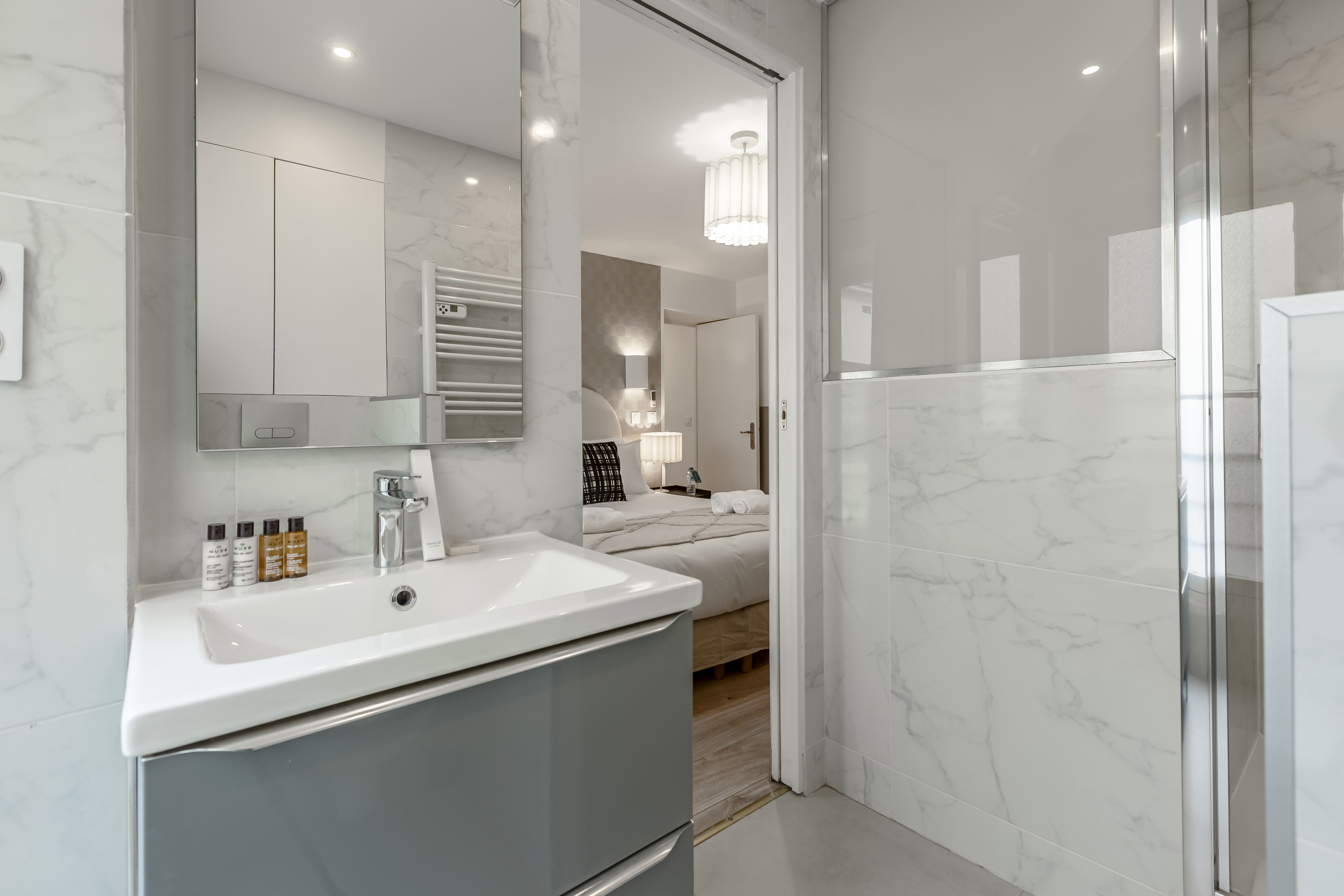 The interior of this exquisite apartment is designed with sophistication and comfort in mind. The open-plan living area, tastefully furnished with modern amenities, includes a convertible sofa bed to accommodate additional guests. The en-suite bathroom exudes luxury, offering a serene space to unwind after a day of exploration. A well-appointed kitchen and a cozy bedroom complete this elegant Parisian retreat.
