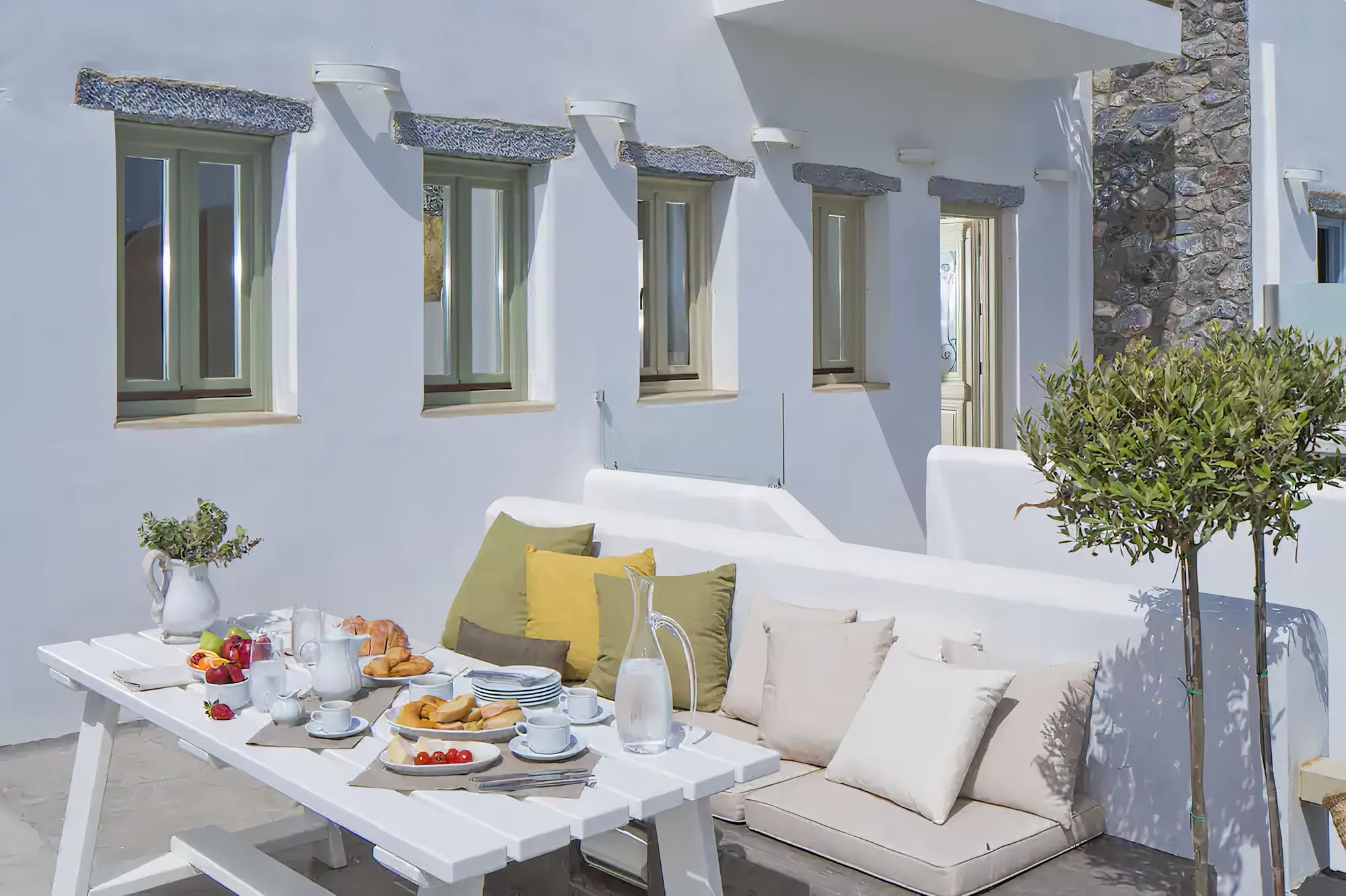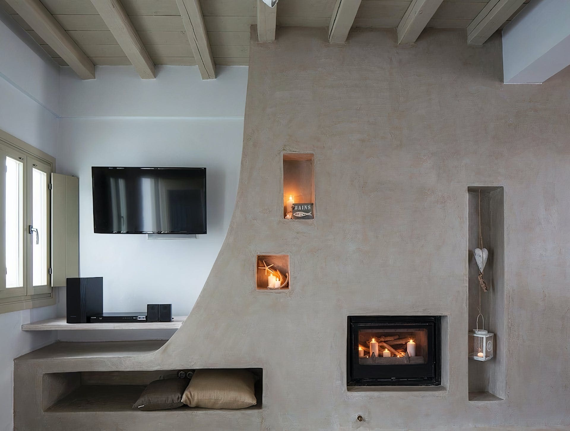The outdoor terrace is a true highlight, offering a bubbling hot tub and panoramic views of the azure sea. Relax with a glass of wine as you take in the tranquil surroundings, or dine al fresco under the stars. The nearby Livadi Beach is just a short walk away, providing endless opportunities for sunbathing and swimming in the crystal-clear waters.