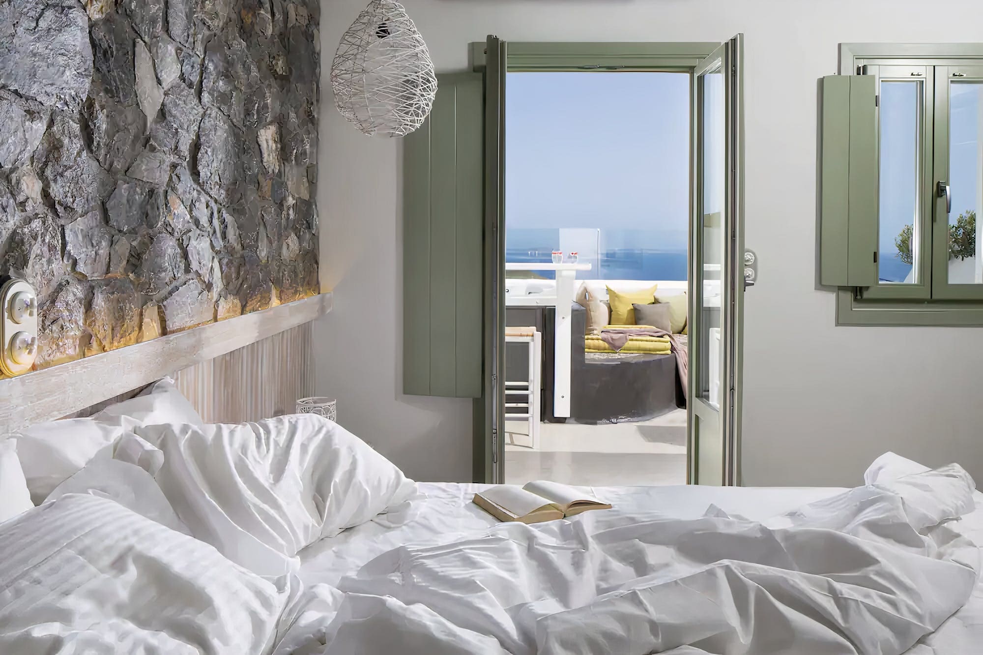 Outside, the apartment’s private terrace offers stunning views of the Aegean Sea. Enjoy al fresco dining under the shaded pergola, or take a refreshing dip in the swimming pool, which can be fenced upon request for added safety. The surrounding landscape of craggy hills and vibrant bougainvillaea adds to the charm and tranquility of this luxury retreat.