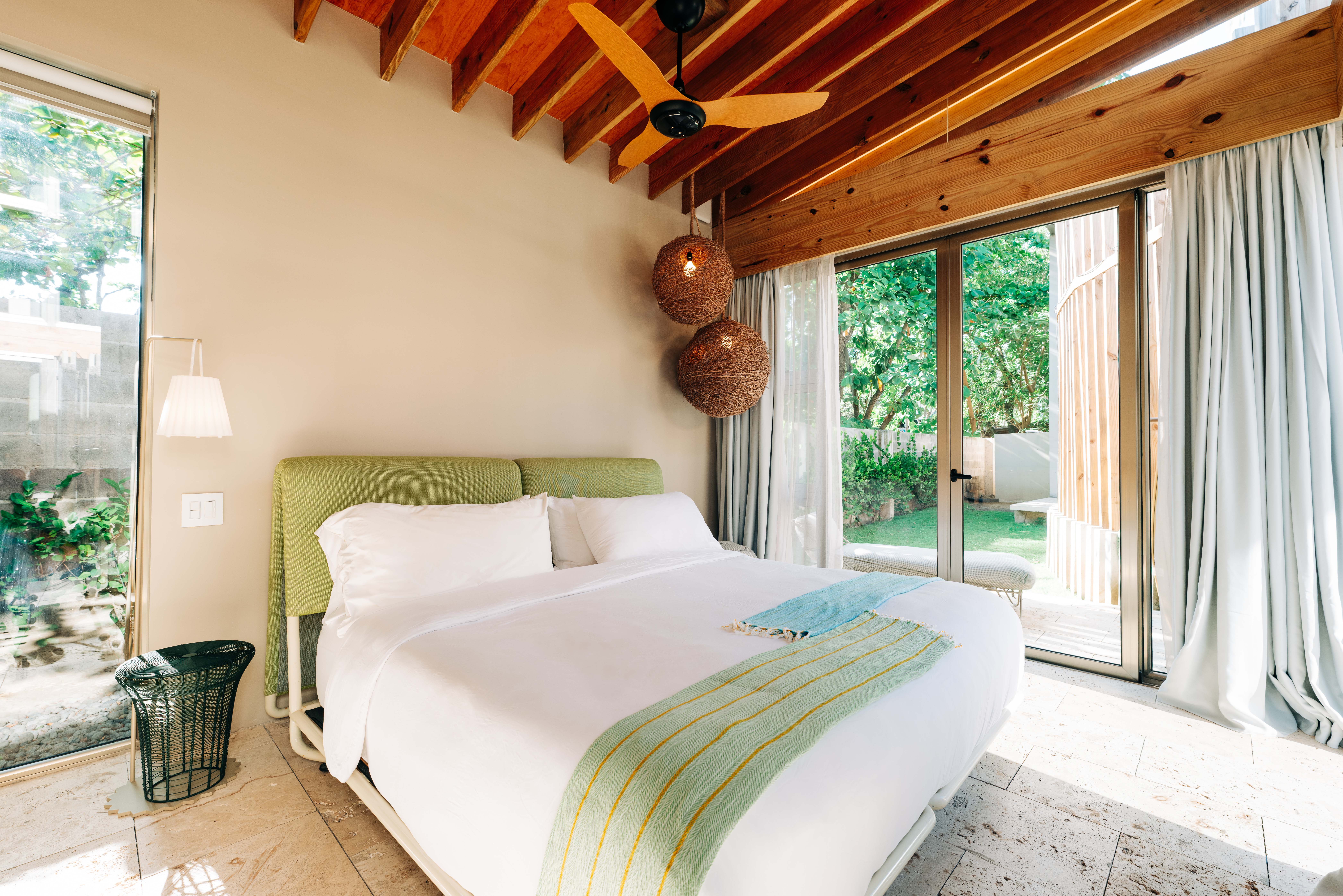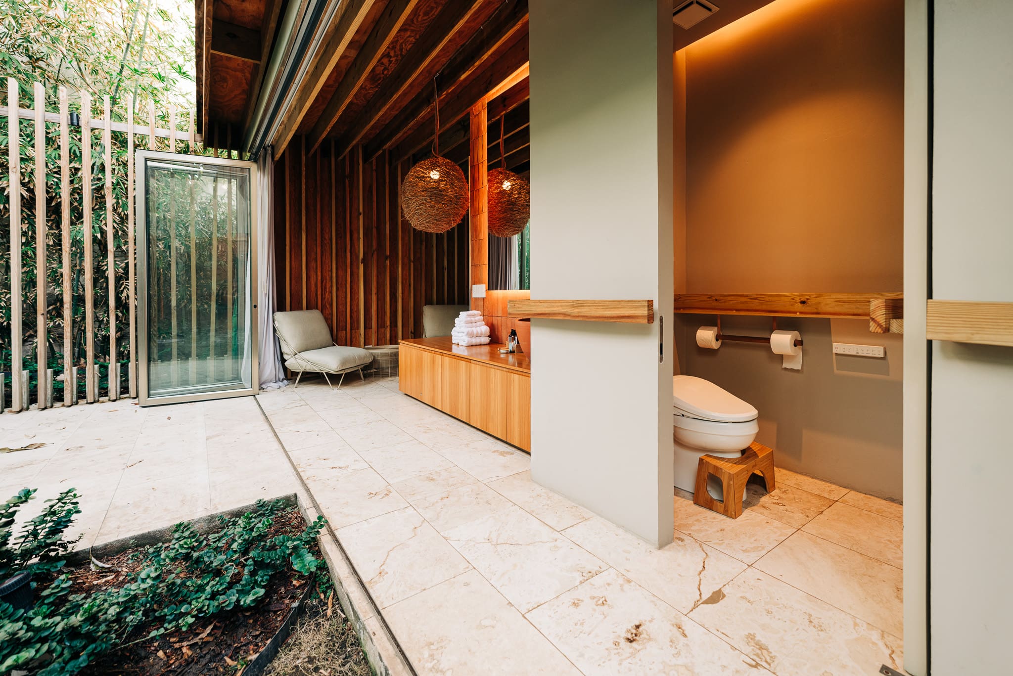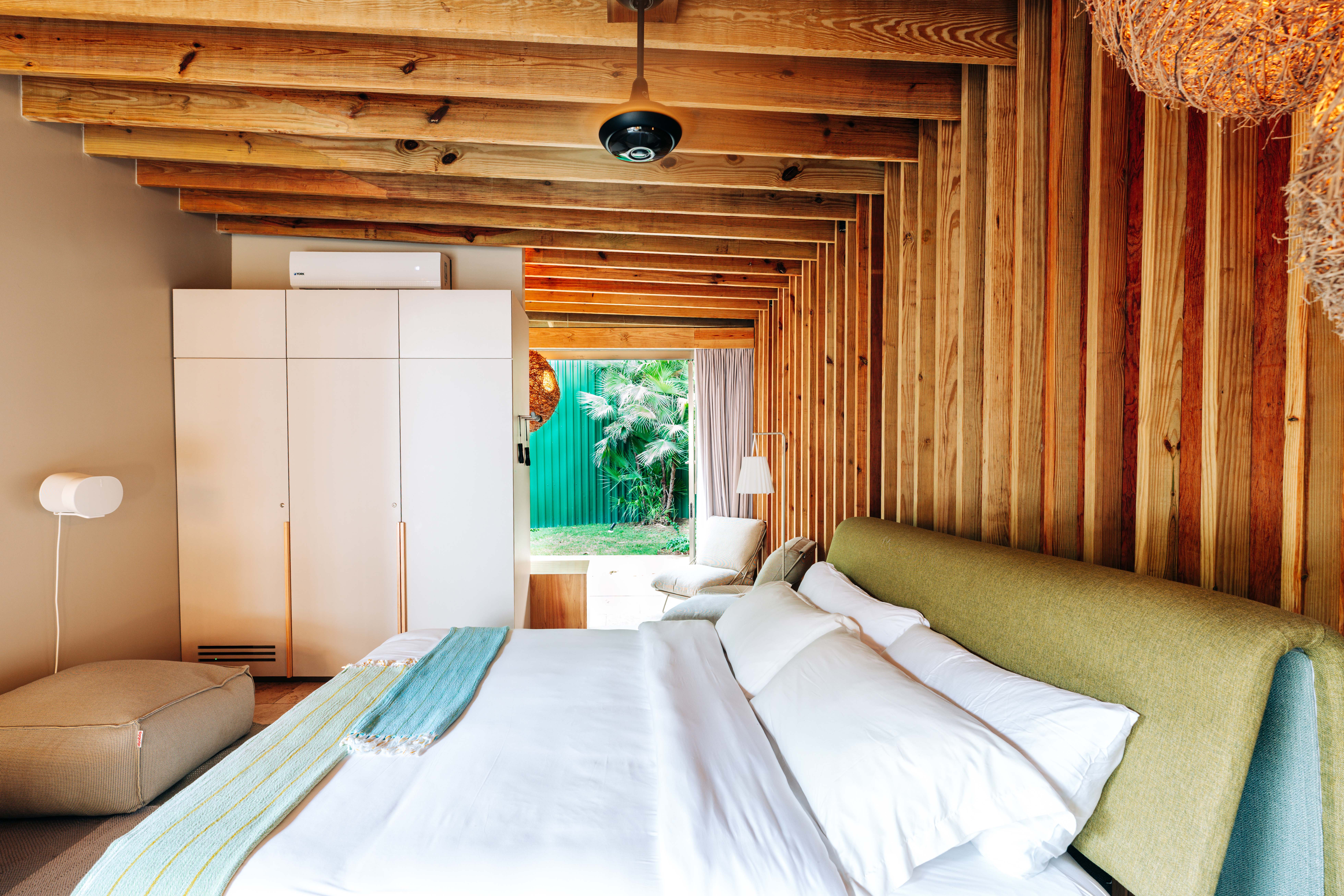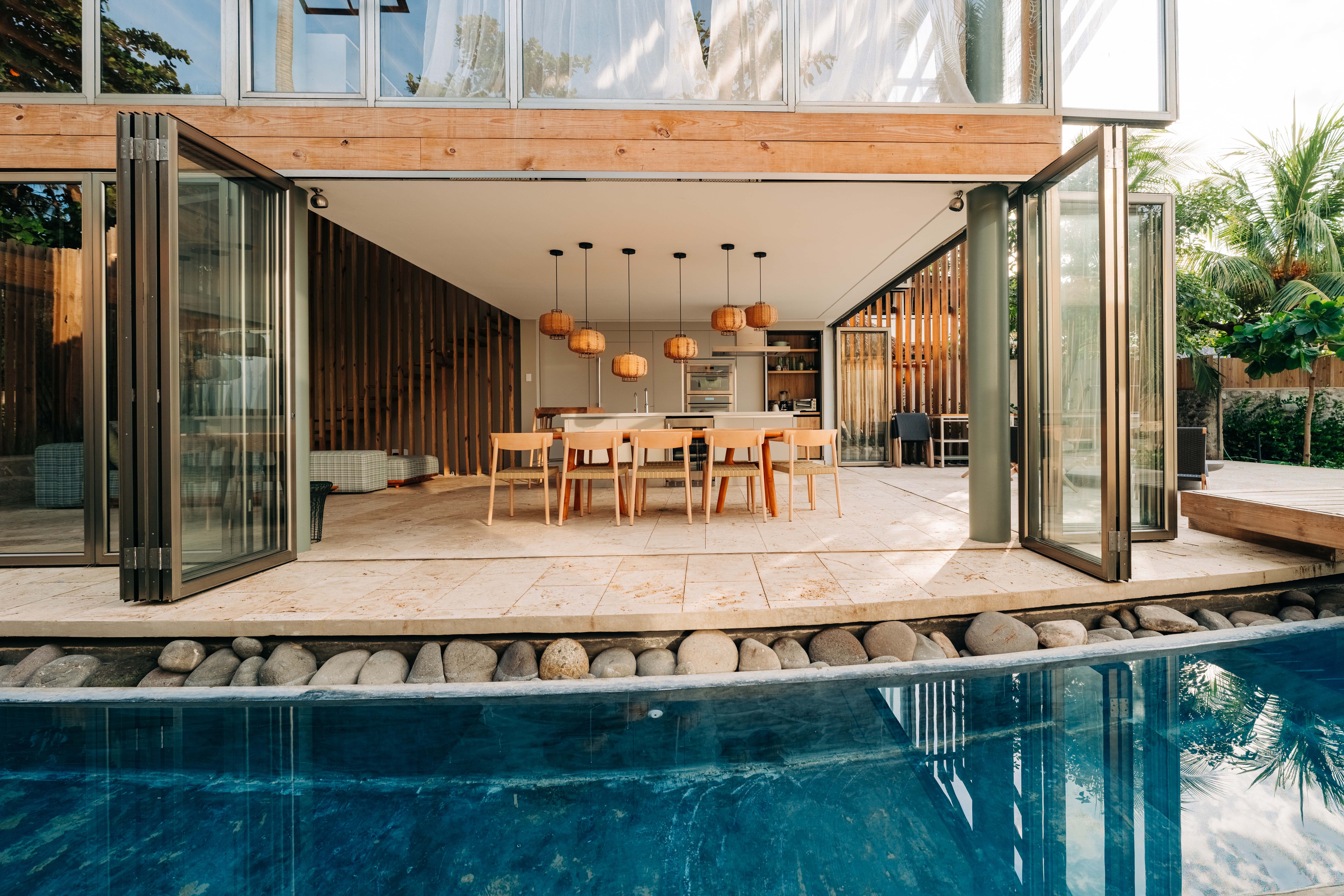 Step into a world of refined design and modern luxury. This spacious apartment features an open-plan living area that seamlessly connects to a state-of-the-art kitchen, perfect for entertaining. Each of the five bedrooms offers plush bedding and en-suite bathrooms, ensuring privacy and tranquility. The main bedroom, situated in a separate building, includes a private garden access with an outdoor shower, adding an extra touch of indulgence.