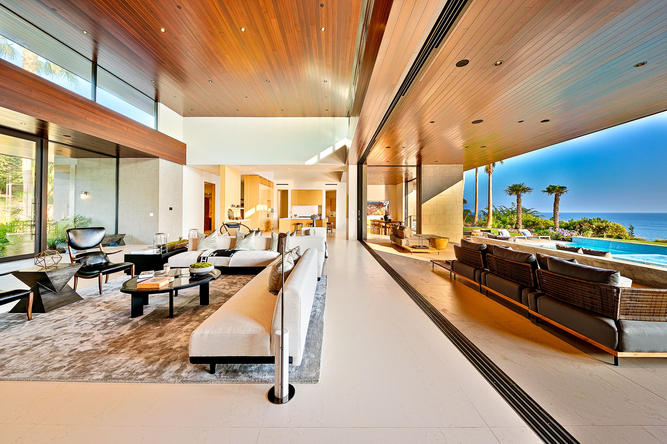 The outdoor areas offer a serene escape with a zen-like garden and a sparkling swimming pool. Whether you’re lounging poolside or enjoying an al fresco meal, the views of the ocean and the gentle Malibu breeze create an unforgettable experience. The property’s proximity to the beach allows for spontaneous seaside strolls and sunbathing sessions.