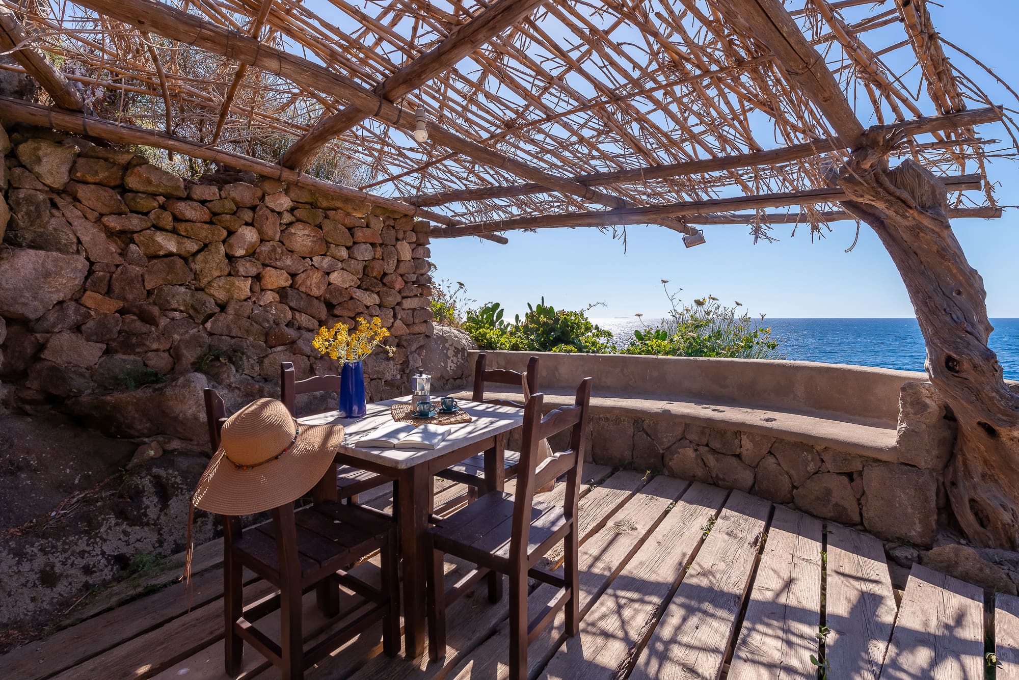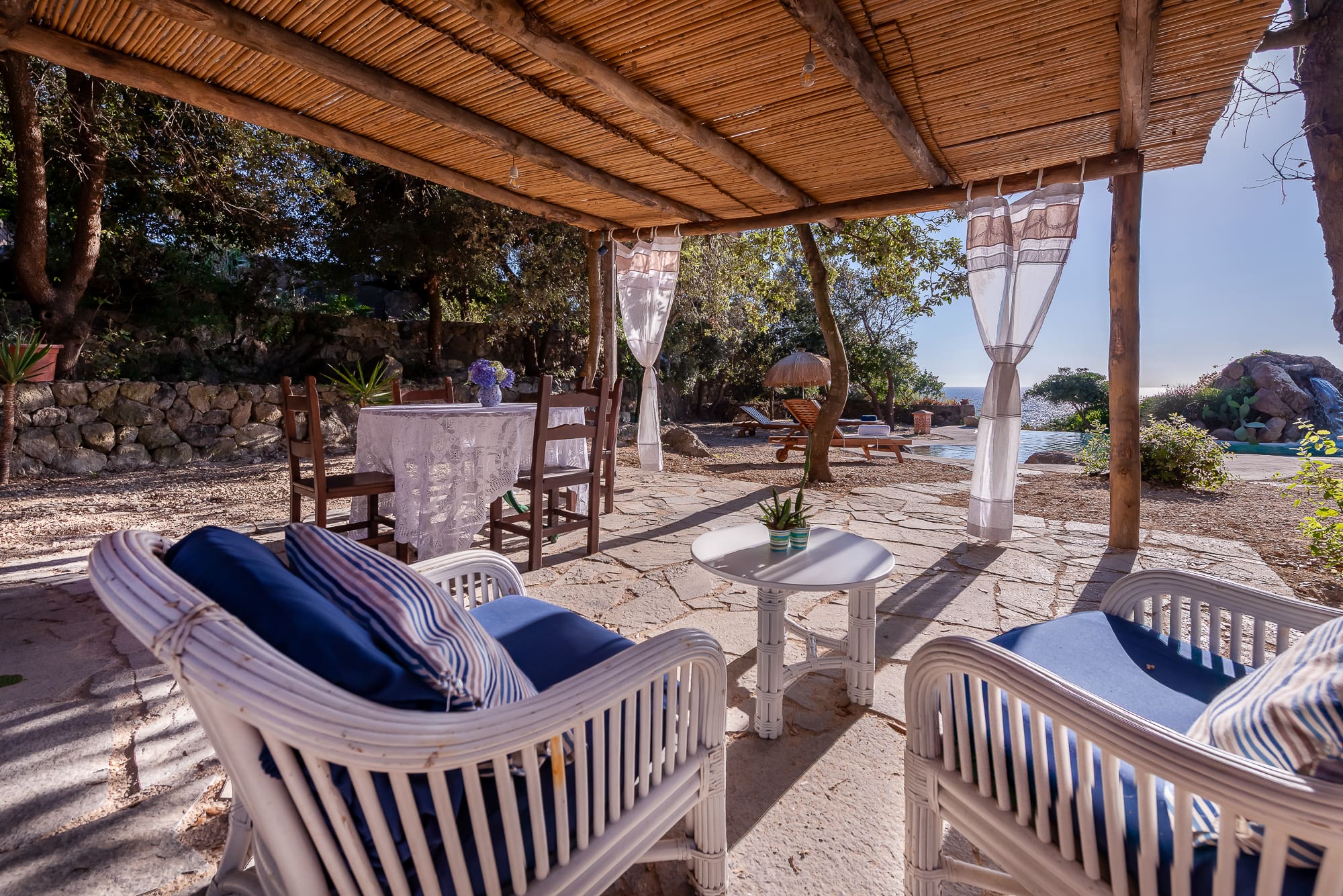 The apartment’s outdoor spaces are a sanctuary of tranquility. Relax on the sun-kissed terrace, where loungers and an alfresco dining area provide a perfect setting for soaking in the panoramic views of San Francesco Bay. The nearby path leads directly to the shimmering sea, inviting you to dip your toes in the Mediterranean waters.