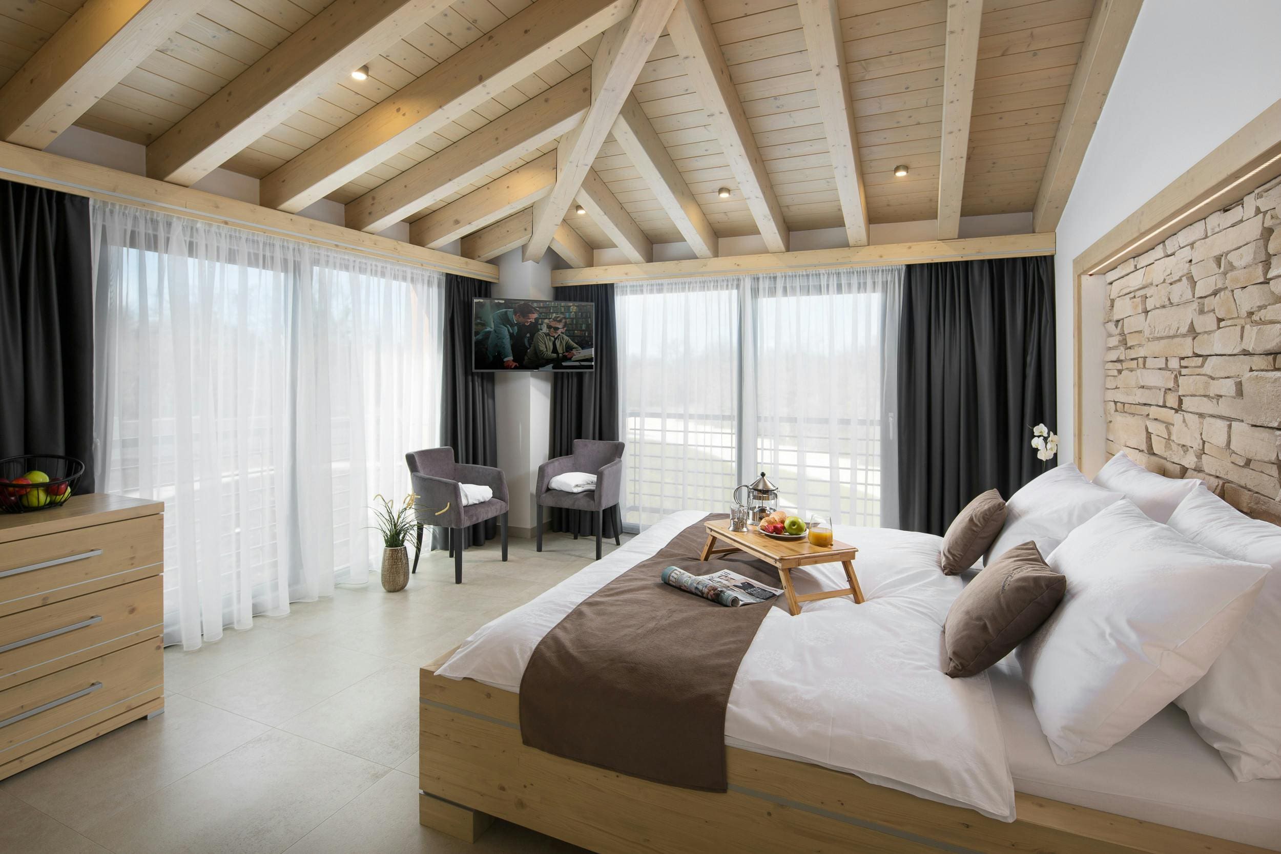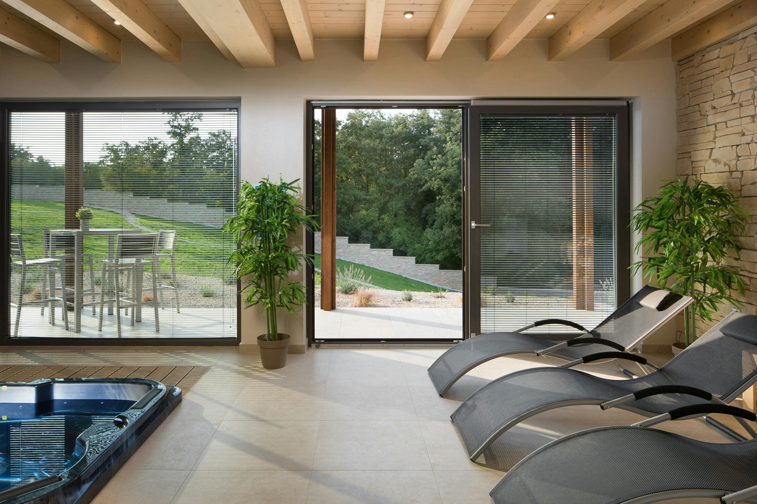 The outdoor spaces at Kuća Svetvinčenat are nothing short of spectacular. The highlight is an infinity pool that seems to blend seamlessly with the lush countryside views. Relax on the sun loungers by the pool or enjoy a leisurely swim. The property also features a sauna and steam room, providing the ultimate in relaxation. The surrounding gardens and terraces offer numerous spots for al fresco dining and unwinding under the Croatian sun.