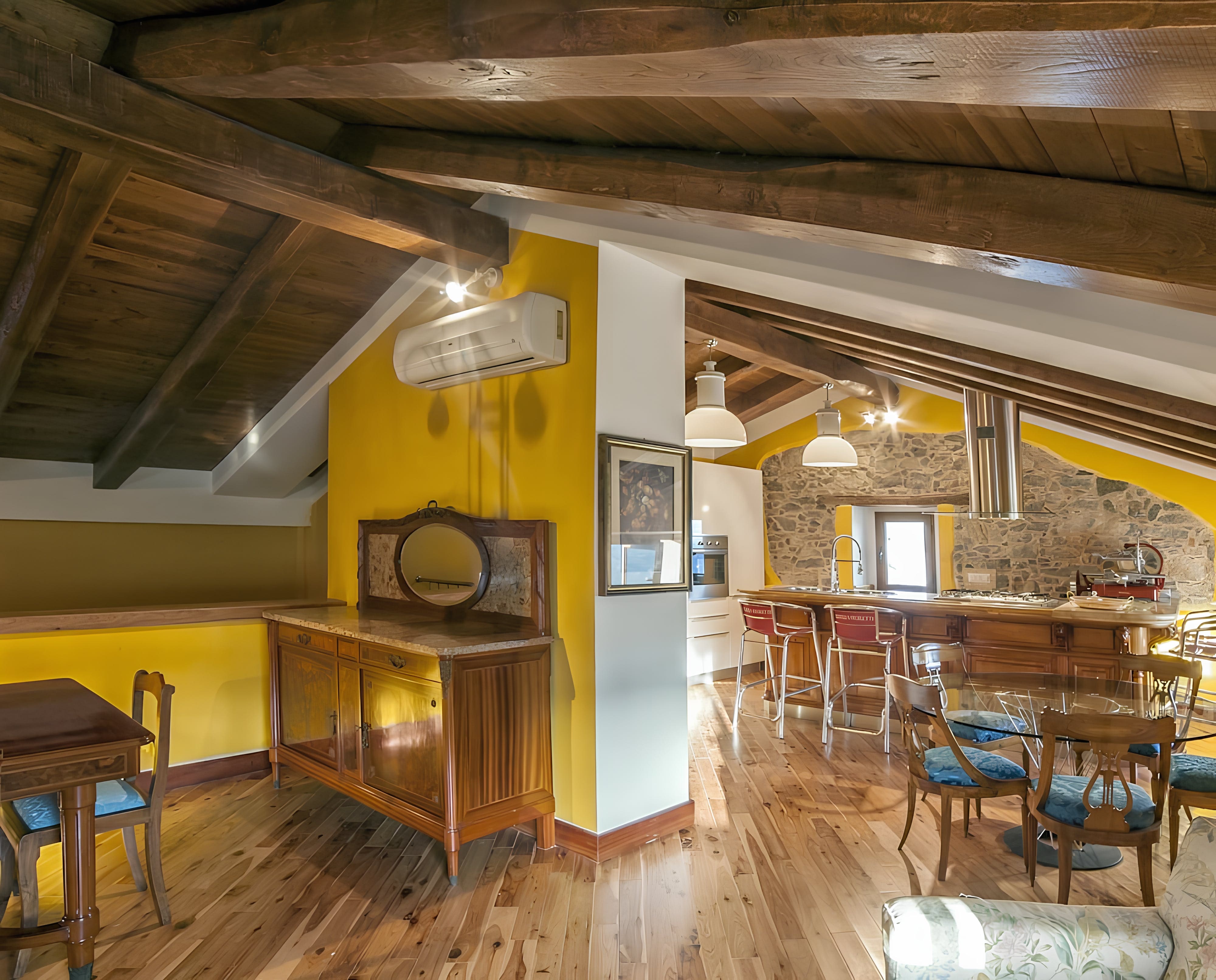 The interior of this stunning apartment is designed to impress. With seven well-appointed bedrooms, including four on a mezzanine level, guests can enjoy a sense of openness and comfort. The living area is an inviting space for relaxation, while the kitchen is fully equipped for preparing local delicacies. Each room is tastefully decorated, blending traditional Italian elements with contemporary design.