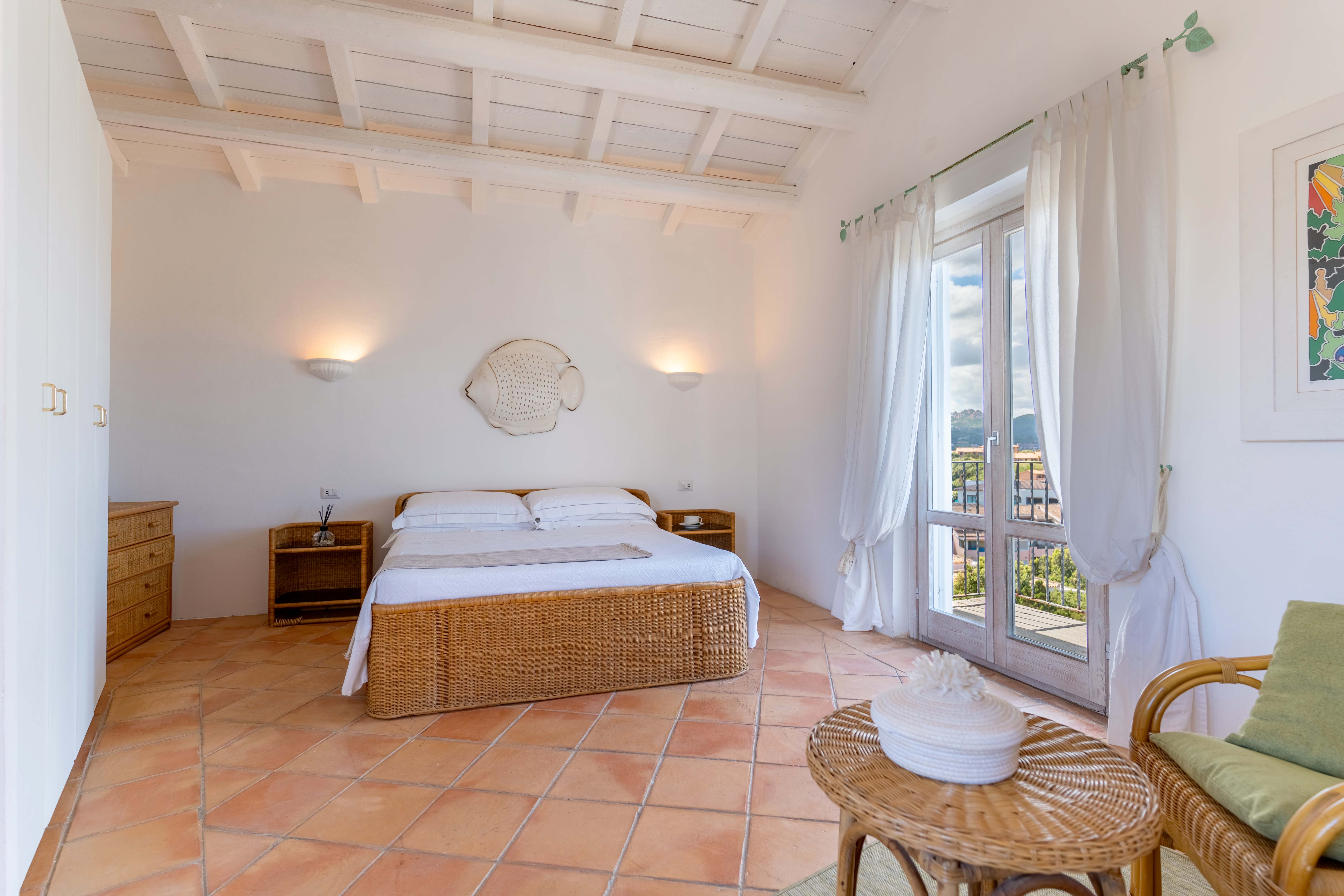 Spread across four floors, the interior of Villa Nuraghe Porto Rotondo is a masterclass in contemporary elegance. The high ceilings and terracotta tiles create an airy and cool atmosphere, while the stark white walls complement the rustic design elements. Each of the five spacious bedrooms offers an en-suite bathroom, ensuring privacy and comfort for all guests. The living areas feature wicker chairs and natural-themed artwork, providing a harmonious blend of luxury and homeliness. The fully equipped kitchen is perfect for culinary enthusiasts eager to create Italian feasts.